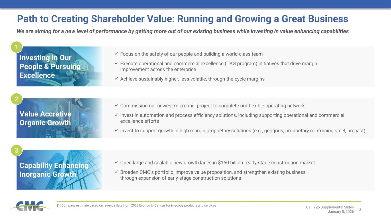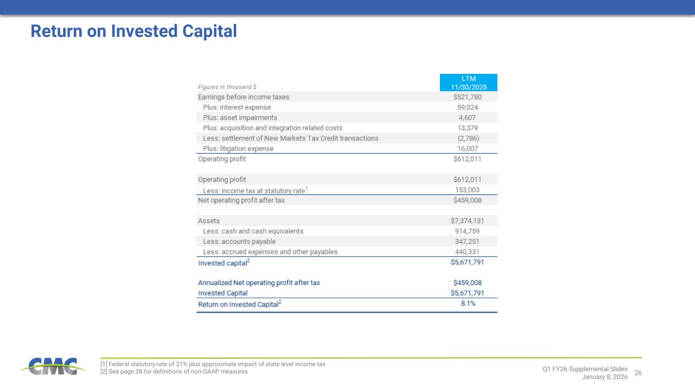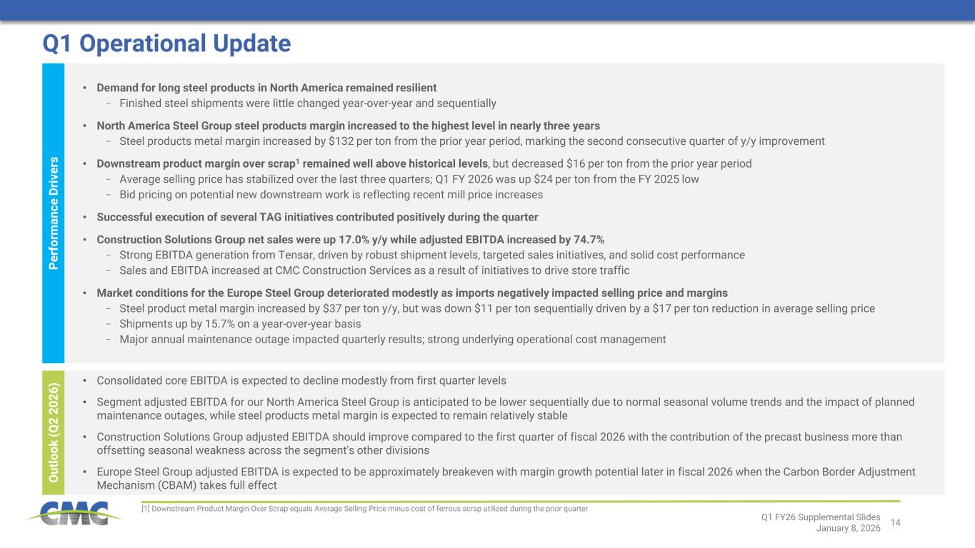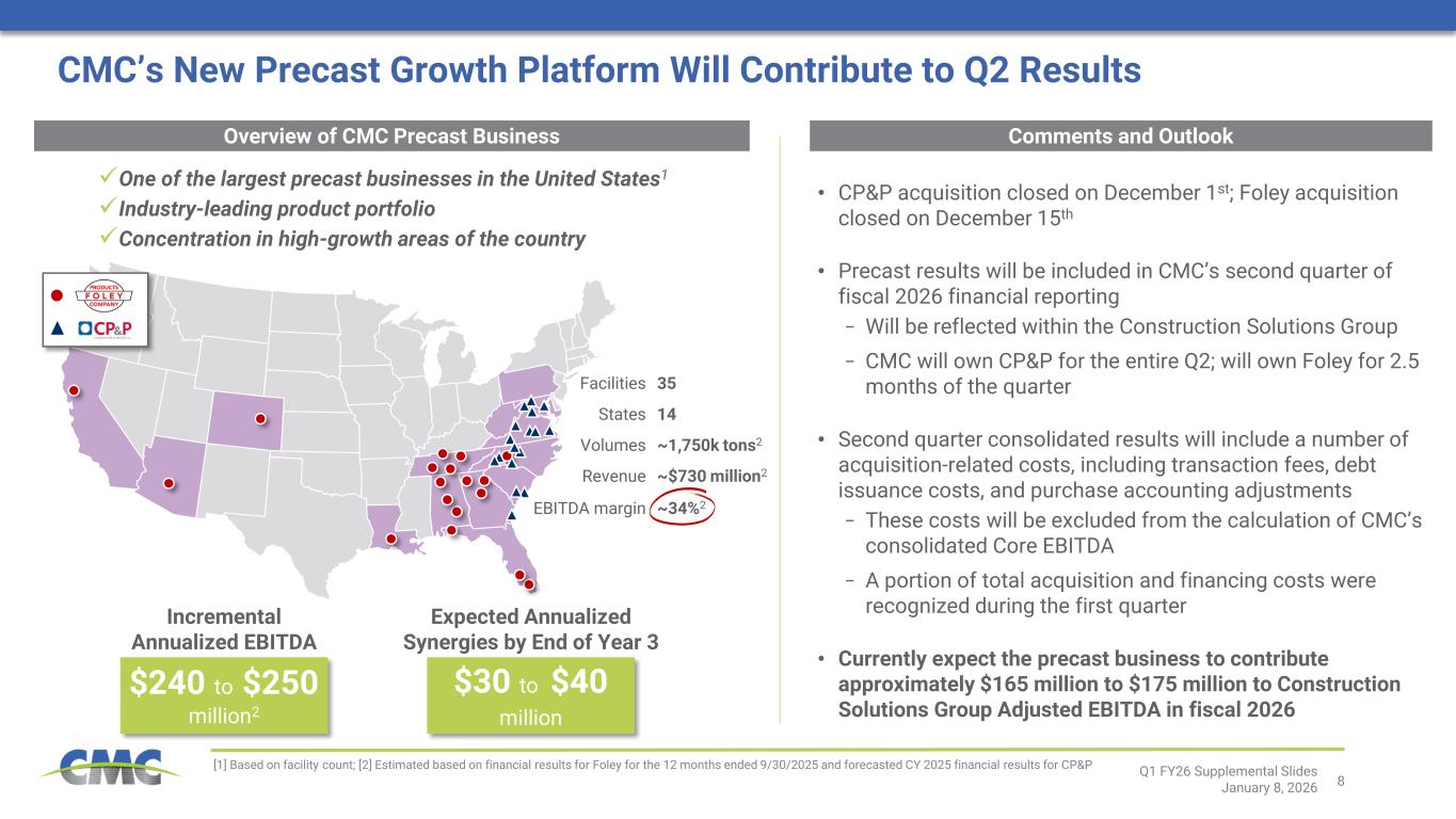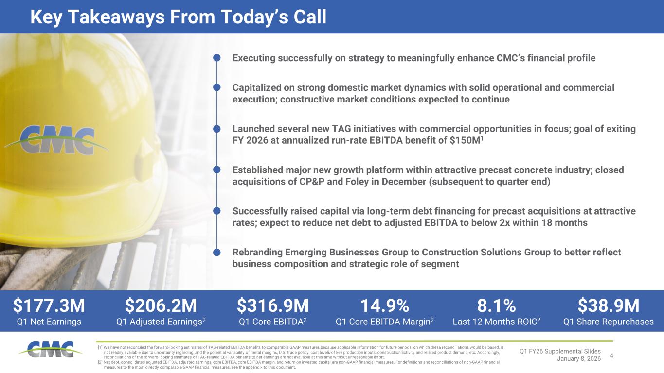 ピーター・マット社長兼最高経営責任者は次のように述べた。「2026年第1四半期は、2025会計年度に築いた戦略的基盤をさらに強化し、財務基盤と収益力を持続的かつ実質的に向上させるという目標を推進し続けたCMCにとって、卓越したスタートを切った四半期となりました。当社の事業展開地域全体における堅調な事業運営と商業的実行が財務実績を支え、CMCは建設的な市場環境を最大限に活用することができました。 またTAGプログラムにおいても勢いを維持し、利益率拡大と業界をリードするサービス提供の完全な価値実現を目指す主要な新施策を開始しました。これにより、2026年度末までに年間換算EBITDA利益1億5000万ドルを達成または上回る目標達成への確信を得ています。 最後に、2つの大規模プレキャスト事業買収を発表し、その後完了させました。これにより、高収益かつ拡張性のある新たな成長基盤を確立し、既存顧客と新規顧客の双方に対してさらなる価値を創出する体制を整えました。」