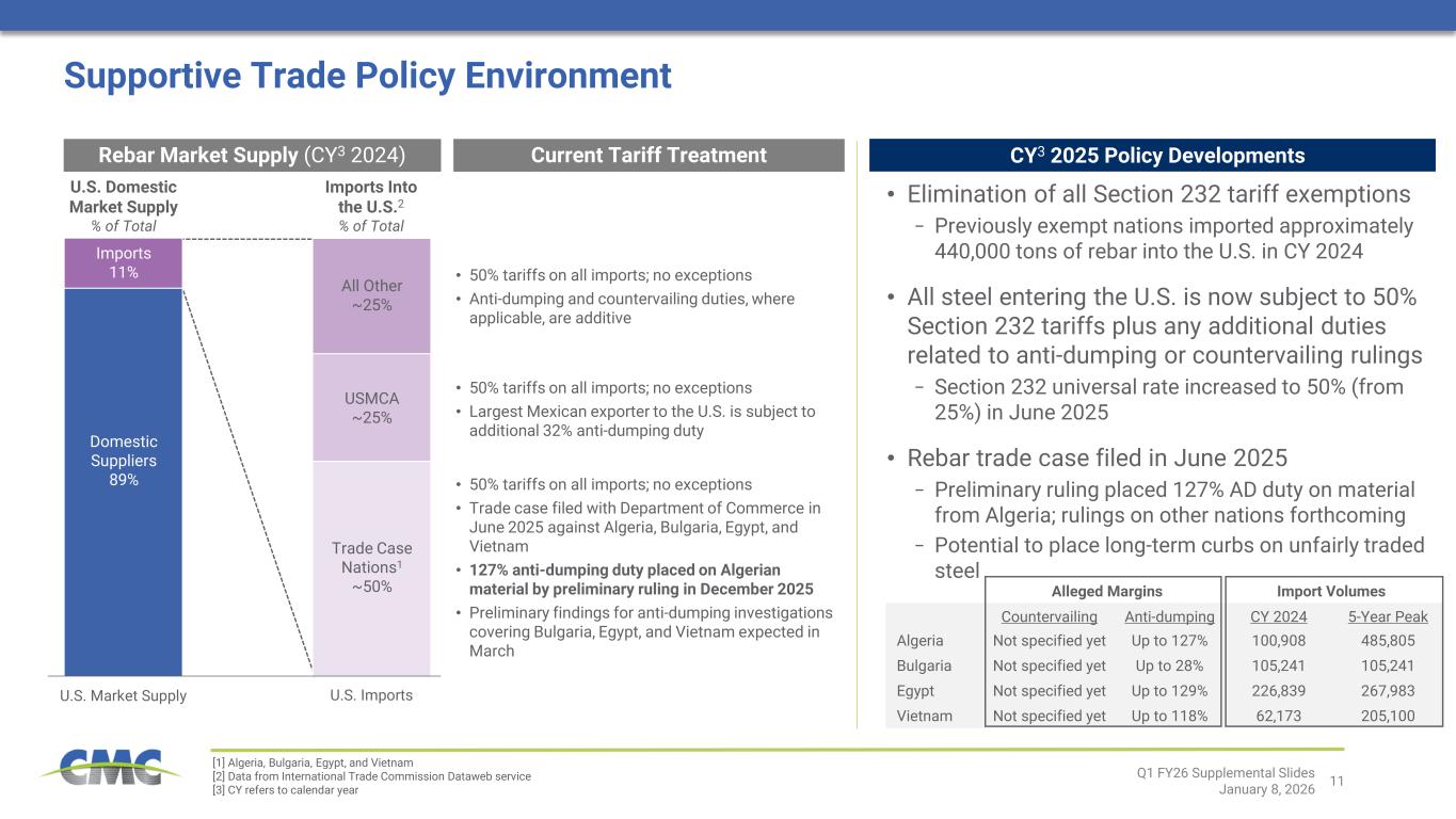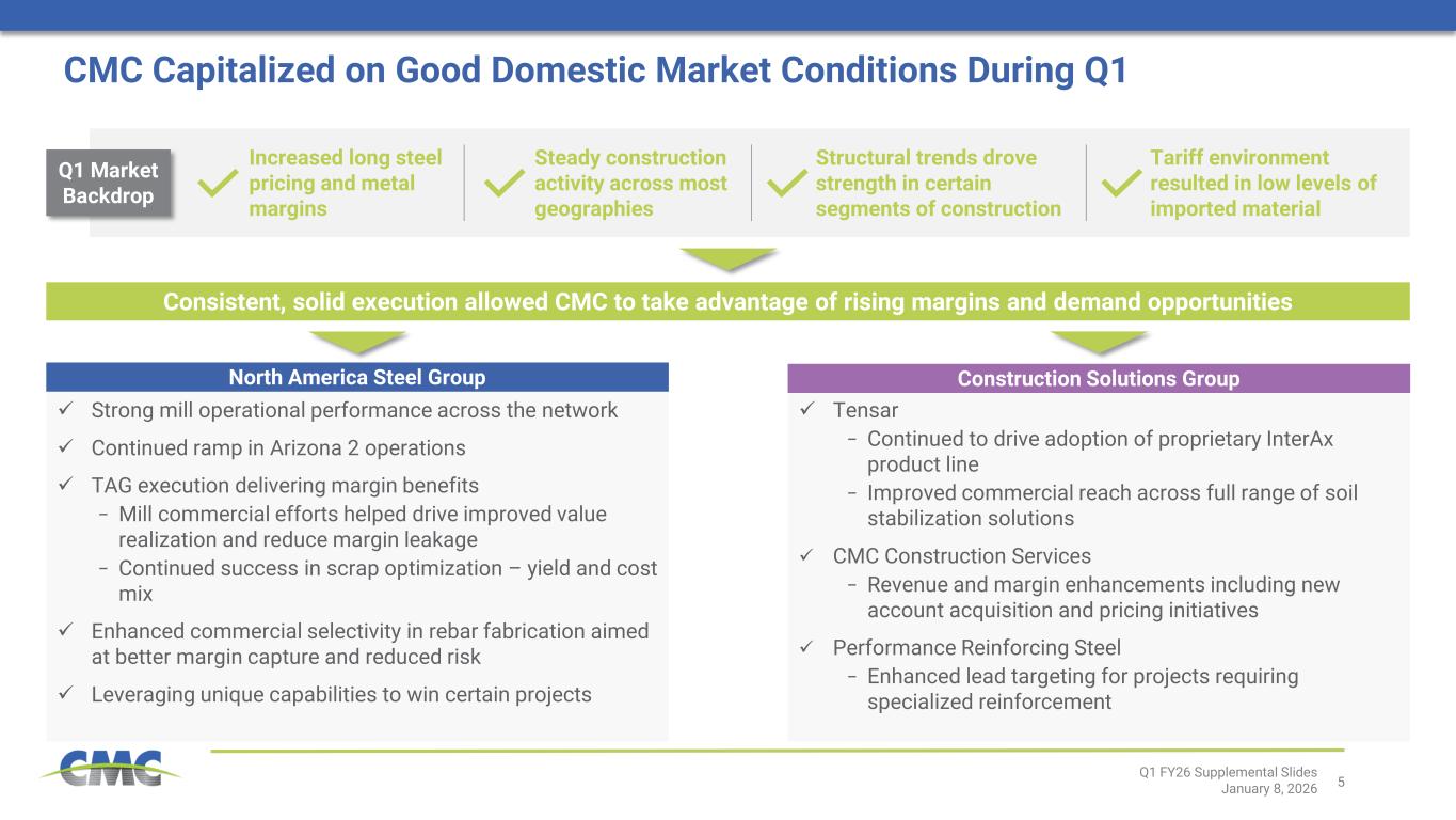 マット氏はさらに次のように述べた。「第1四半期の財務実績を見ると、前年同期比で大幅な改善を達成しました。 業績は、安定した需要と拡大するマージンを特徴とする、北米スチール部門と建設ソリューション部門の両方における堅調な国内市場環境に支えられました。鋼材製品のマージンは四半期連続で増加し、約3年ぶりの高水準に達しており、良好な市場動向に基づきさらに上昇する可能性があります。当社(CMC 2026年度第1四半期 - 2)の分析に基づけば、