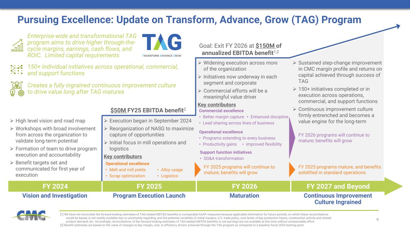 本ニュースリリースには、連邦証券法上の将来予測に関する記述が含まれております。これには、CP&P買収およびFoley買収による期待される利益、一般的な経済状況、当社事業に影響を与える主要なマクロ経済要因、進行中の貿易措置の影響、顧客の流動性に対する継続的な圧力の影響、買収および戦略的投資による潜在的なシナジー効果と成長、当社製品への需要、出荷量、金属マージン、 特に国内製鉄所稼働開始期間における当社の製鉄所をフル稼働させる能力、当社の操業に必要な原材料およびエネルギーの将来の供給可能性とコスト、特定の報告セグメントにおける成長率、建設ソリューションズグループセグメント内の製品マージン、自社株買い、法的手続き、建設活動、国際貿易、地政学的状況の影響、設備投資、 税額控除、当社の流動性及び将来の流動性要件を満たす能力、推定契約上の義務、新施設の予想される能力と利益、当社の成長計画及びイニシアチブ(TAGオペレーショナル・アンド・コマーシャル・エクセレンス・プログラムを含む)の遂行による予想される利益とタイムライン、並びに将来の事象に関する当社の予想または見解。 本リリースにおける歴史的事実以外の記述は、将来に関する見通し表明です。これらの将来に関する見通し表明は、一般的に「当社または当社の経営陣が『予想する』」「『見込む』」「『確信する』」「『推定する』」「『将来の』」「『意図する』」「『可能性のある』」「『計画する』」「『すべきである』」「『かもしれない』」「『見込みがある』」「『見通し』」などの表現、ならびに戦略・計画・意図に関する議論によって識別できます。 「できる」、「する」、「すべき」、「可能性が高い」、「見込まれる」、「予測」、「見通し」などの表現、あるいは戦略、計画、意図に関する議論によって識別できます。