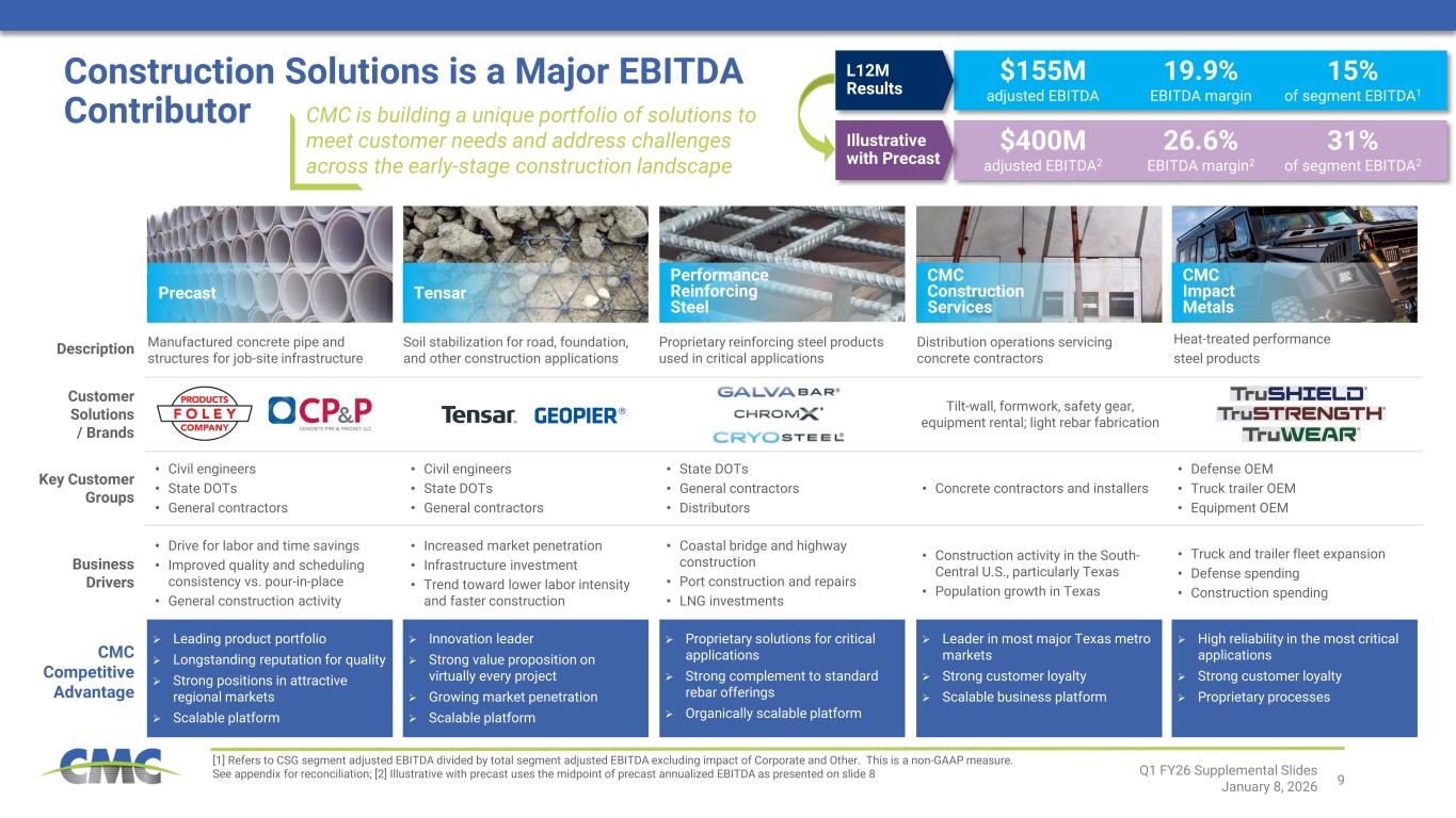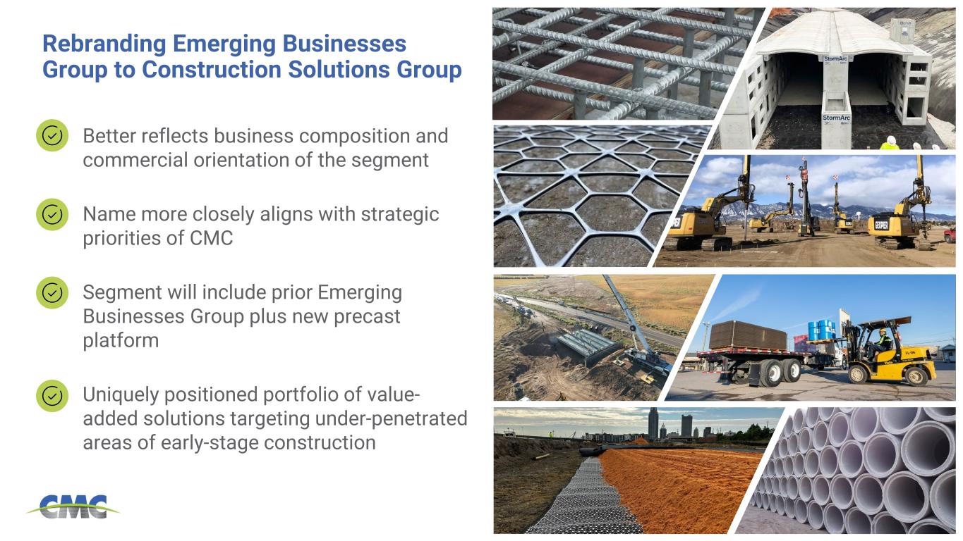 2026年度第1四半期より、従来の「新興事業グループ(EBG)」報告セグメントは、当該セグメントの事業構成と戦略的優先事項をより適切に反映するため、「建設ソリューションズグループ(CSG)」に名称変更されました。本セグメントには、従来EBG内で報告されていた全事業が含まれ、さらに2026年度第2四半期よりCMCの新規プレキャストコンクリート事業も含まれます。 名称変更は、CMCの報告構造および過去に報告された財務情報に影響を与えません。