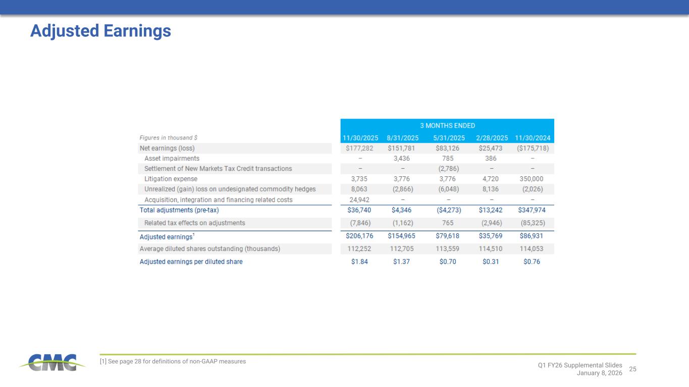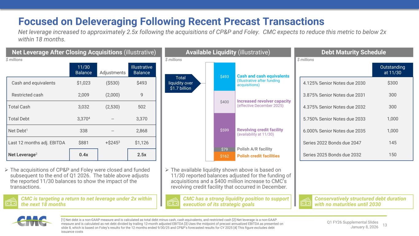 2025年11月30日現在、現金、現金同等物および制限付き現金は合計30億ドル、利用可能な流動性は約19億ドルであった。当四半期中、CMCは合計3,890万ドル相当の普通株式663,220株を買い戻した。 2025年11月30日現在、現行の自社株買い承認枠には1億6610万ドルが利用可能残高として残存している。2025年11月30日時点の現金残高には、11月に発行した優先社債による調達資金20億ドルが含まれており、その大部分はFoley買収資金に充てられた。 12月にはCP&P社とFoley社の両買収を完了し、約25億ドルの支払いを行った。
