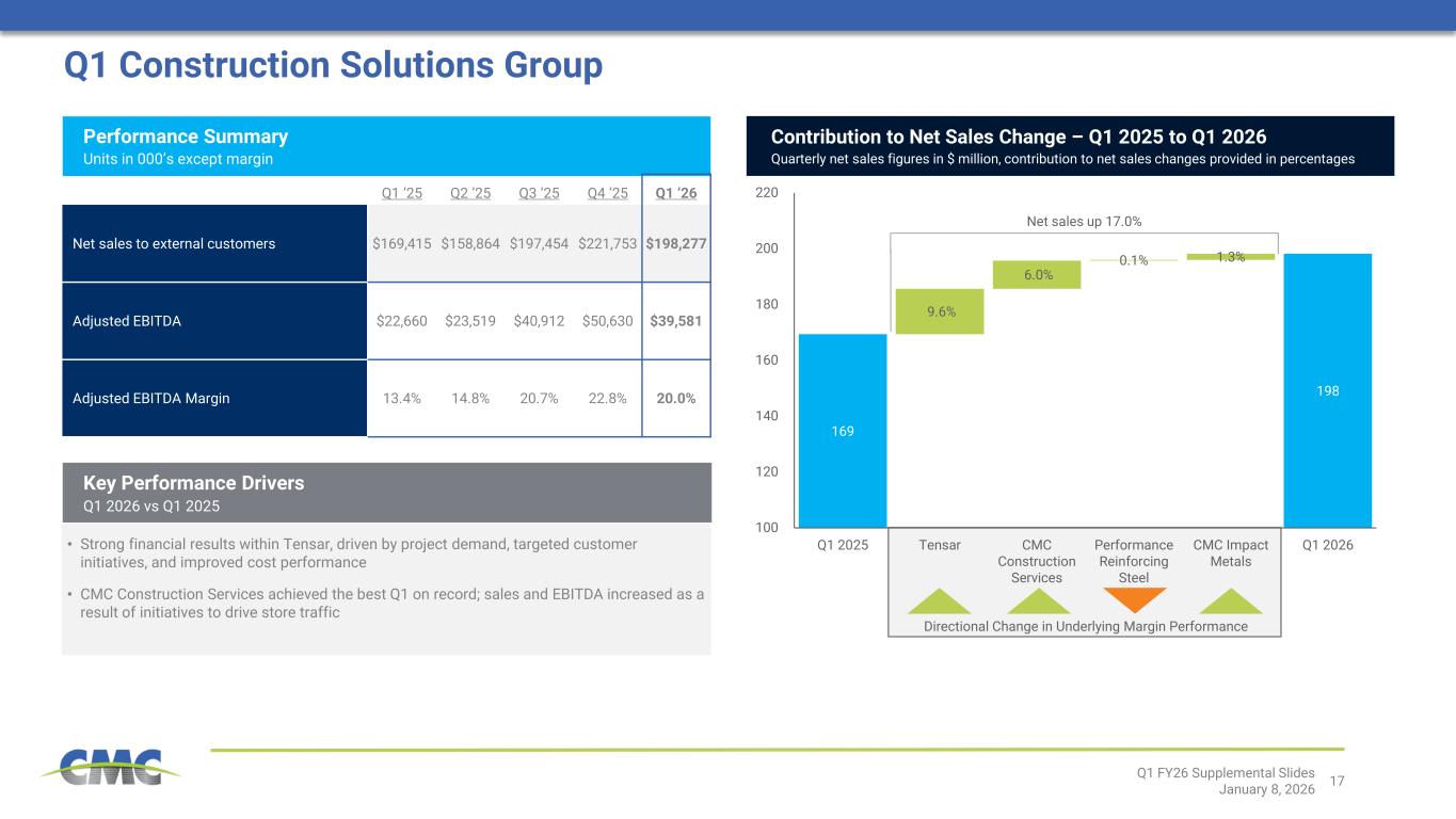 CSGの第1四半期純売上高は1億9830万ドルで、前年同期比17.0%増加しました。一方、調整後EBITDAは3960万ドルで前年同期比74.7%増となり、セグメント史上最高の第1四半期業績を記録しました。 収益性の改善は主に、堅調な需要、コスト効率の向上、およびターゲットを絞った商業的取り組みの恩恵を受けたCMCのテンサー部門における継続的な強さに牽引された。CMC建設サービスおよびCMCインパクトメタルズもEBITDAの前年比成長に貢献したが、それらの貢献は、前年同期の高水準と比較してパフォーマンス補強鋼材部門の低調な結果によって一部相殺された。 CMC建設サービス部門の純売上高とマージンは、商業部門の標準化に向けた施策の恩恵を受けた(CMC 2026年度第1四半期 - 4)