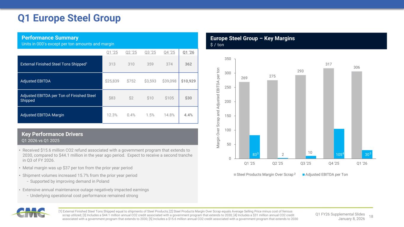欧州鉄鋼グループの調整後EBITDAは、2026年度第1四半期に1,090万ドルとなり、前年同期の2,580万ドルから減少した。調整後EBITDAマージンは4.4%で、前年同期の12.3%から低下した。 この前年比減少は、CO2クレジット収入の減少が主因であり、2026年度第1四半期は1,560万ドルであったのに対し、2025年度第1四半期は4,410万ドルを受領していた。 四半期におけるCO2クレジット収入の減少は、2025年度第4四半期にクレジットの一部を受領した結果である。エネルギーコスト還付額の変化を除くと、調整後EBITDAは輸送量の堅調さと金属マージンの拡大により、前年同期比で大幅に改善した。