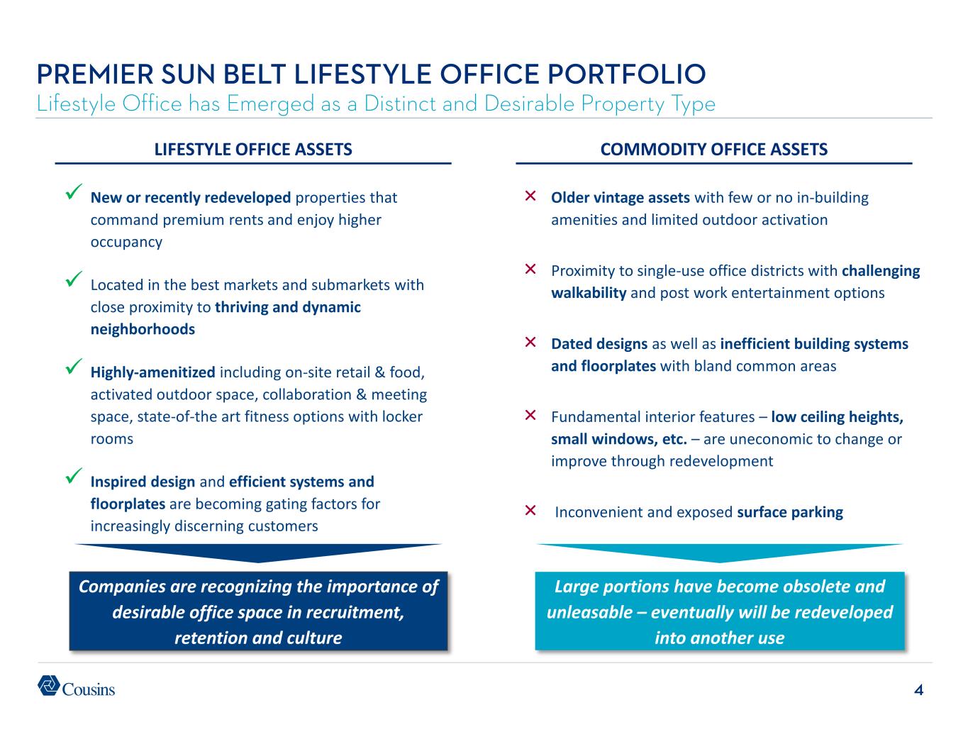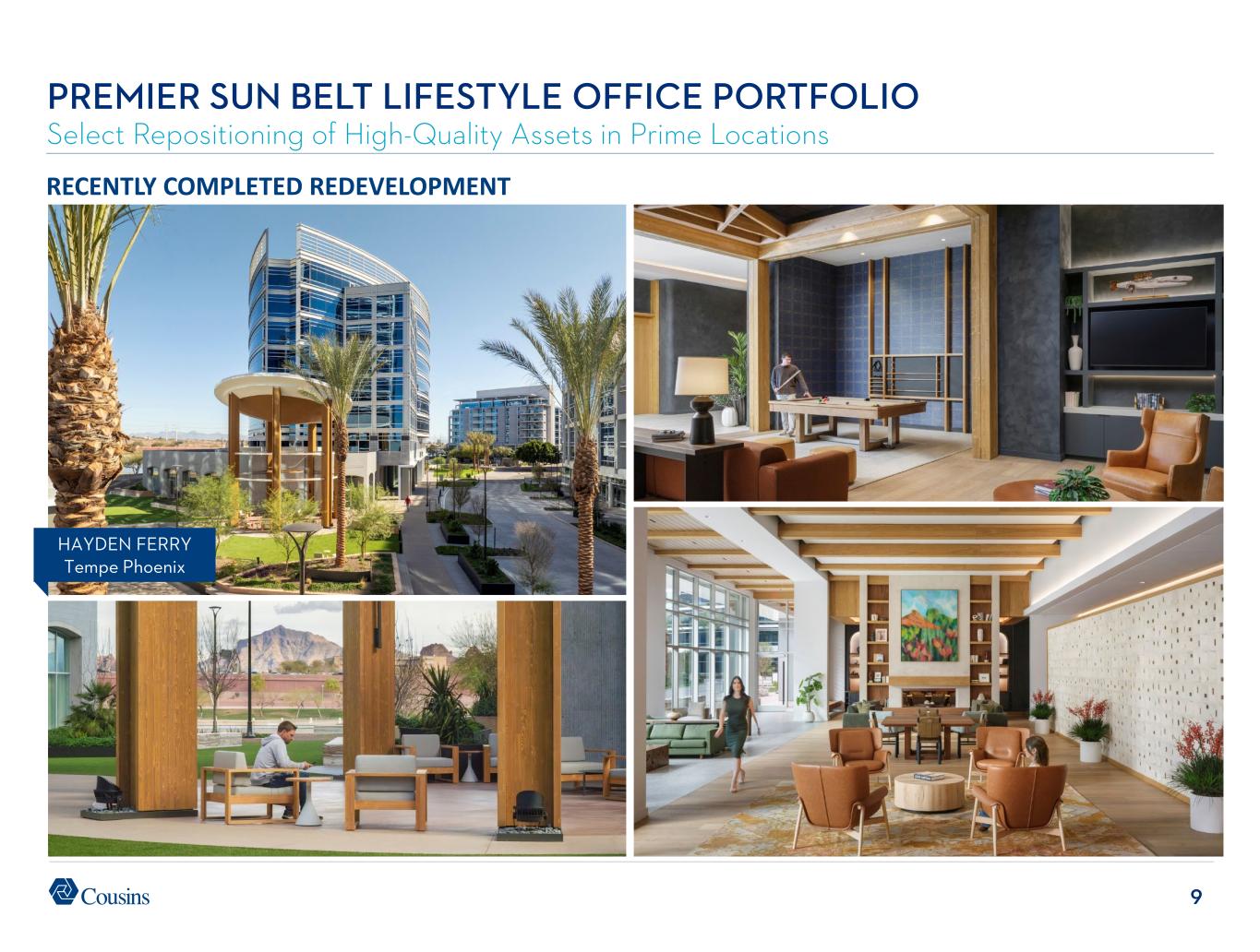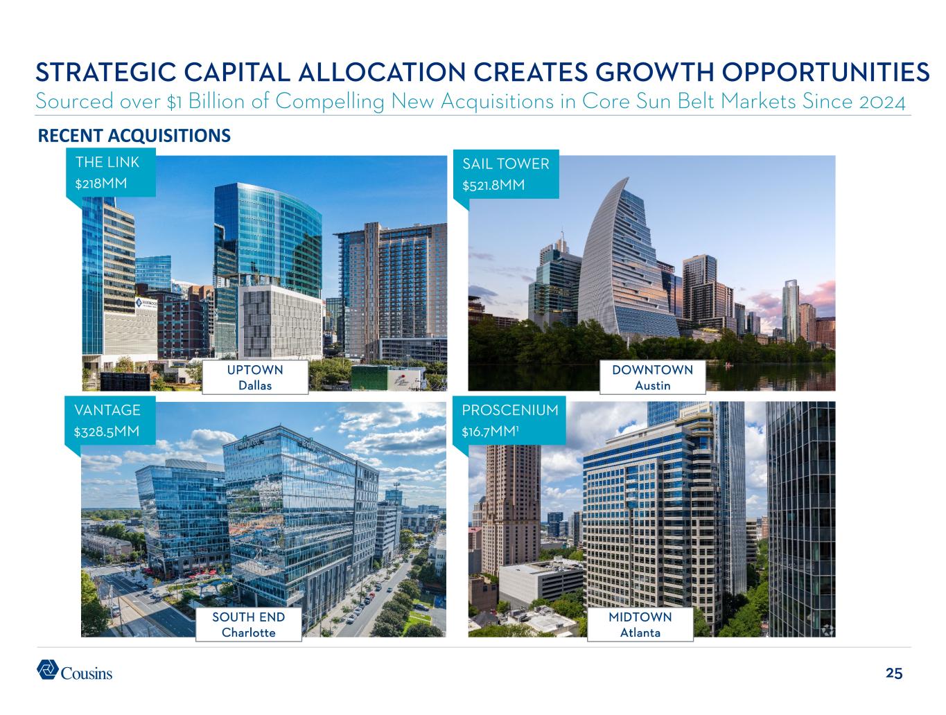 39 Page 17 – Benefiting from Powerful Office Trends 1. Source: U.S. Census Bureau Historical Population Change Data, 1910-2020. Page 18 – Benefiting from Powerful Office Trends 1. Source: JLL U.S. Office Outlook 2Q 2025. Page 19 – Benefiting from Powerful Office Trends 1. Source: JLL U.S. Office Outlook 1Q 2025. Page 20 – Positioned for Organic Growth 1. Lease expirations as a percentage of total portfolio rent when available, otherwise percentage of square footage as reported in companies’ most recent quarterly filings. Includes all members of the FTSE NAREIT Equity Office Index that report lease expirations. Page 21 – Positioned for Organic Growth 1. Per Cousins’ quarterly supplemental reports. Page 22 – Positioned for Organic Growth 1. Per Cousins’ quarterly supplemental reports. Page 23 – Strategic Capital Allocation Creates Growth Opportunities 1. Per Cousins’ quarterly supplemental reports. Average age is adjusted for ten assets that have been redeveloped over the past seven years. Page 24 – Strategic Capital Allocation Creates Growth Opportunities 1. Represents leased percentage per 30-Jun-2025 filings. 2. Cousins’ share of total estimated project costs per 30-Jun-2025 filings. Page 25 – Strategic Capital Allocation Creates Growth Opportunities 1. Represents Cousins’ share of initial investment. Page 26 – Strategic Capital Allocation Creates Growth Opportunities 1. See endnote 12 for Page 2. Page 27 – Balance Sheet Primed for Opportunities 1. See endnote 14 for Page 2. 2. See endnote 13 for Page 2. Page 28 – Track Record of Success 1. See endnote 10 for Page 2. Page 29 – Track Record of Success 1. Current dividend as of 8-Sept-2025. 2. Per Cousins’ supplemental reports. Page 30 – Track Record 0f Success 1. Source: Green Street Weekly Pricing reports through 8-Aug-2025. Includes 12 office peers covered by Green Street for entire period. NAV estimates adjusted for splits and spin-offs per Green Street. Appendix – Market Snapshots 1. Represents portfolio statistics of Company as reported in Cousins’ 30-Jun-2025 quarterly supplement, pro forma for Cousins’ acquisition of The Link in Dallas. 2. Calculation is based on pro-rata share of 2Q25 NOI of Cousins assets. 3. Source: CoStar. Represents most recent weighted average gross rental rates of Cousins’ properties with space available for lease; where net rents are quoted, operating expenses are added to achieve gross rents. 4. Based on 2Q 2025 revenues. Management uses SIC codes when available along with judgment to determine tenant industry classification. Page 2 – Why Cousins? 1. As of 30-Jun-2025. 2. Based on 2Q25 GAAP NOI. Average age is adjusted for ten assets that have been redeveloped over the past seven years. 3. Based on CoStar average asking rents for same pool of Cousins assets from 4Q19 to 2Q25. 4. Source: CoStar. Weighted average gross rental rates of 4 & 5 star properties in our markets as of 30-Jun- 2025; where net rents are quoted, estimated operating expenses are added to achieve gross rents. 5. See page 15 Benefiting from Powerful Office Trends. 6. See page 16 Benefiting from Powerful Office Trends. 7. See page 19 Benefiting from Powerful Office Trends. 8. See page 20 Positioned for Organic Growth. 9. See page 21 Positioned for Organic Growth. 10. FFO/share growth based on the midpoint of 2025 guidance when available, otherwise analyst consensus. 11. See page 24 Strategic Capital Allocation Creates Growth Opportunities. 12. Represents Cousins’ estimate of developable SF, excluding redevelopment. 13. Represents cash plus availability under Cousins’ Credit Facility as of 30-Jun-2025, pro forma for acquisition of The Link and the repayment of $250MM unsecured senior note in July 2025. 14. Represents total debt, including Company’s share of unconsolidated debt, net of cash, divided by quarterly Annualized Adjusted EBITDAre as reported in companies’ most recent quarterly filings. Includes members of the FTSE NAREIT Equity Office Index that report EBITDA. 15. See page 29 Track Record of Success. 16. See page 30 Track Record of Success. Page 3 – Cousins at a Glance 1. Represents Cousins’ pro-rata share of 2Q25 NOI per 30-Jun-2025 filings. 2. Cousins is developing Neuhoff, a mixed-use project in Nashville, through a 50% owned joint venture. 3. As of 30-Jun-2025, pro forma for Cousins’ acquisition of The Link. 4. As of 30-Jun-2025. 5. See endnote 2 for Page 2. 6. See page 24 Strategic Capital Allocation Creates Growth Opportunities. 7. See endnote 12 for Page 2. Page 12 – Premier Sun Belt Lifestyle Office Portfolio 1. Source: BofA’s proprietary quality assessment of US Office REITs published 11-July-2024, Green Street Office Insights. Page 13 – Premier Sun Belt Lifestyle Office Portfolio 1. See endnote 4 for Page 2. 2. Cousins’ asking rates represent only properties with space available for lease. Page 14 – Benefiting from Powerful Office Trends 1. See endnotes 1 and 2 for Page 16. 2. Source: JLL U.S. Office Outlook 2Q 2025. Page 15 – Benefiting from Powerful Office Trends 1. Source: JLL Research. 2. See endnote 2 for Page 2. 3. Source: JLL U.S. Office Outlook 2Q 2025. Reflects Atlanta’s largest office tenant moves during 2Q25. Page 16 – Benefiting from Powerful Office Trends 1. Source: U.S. Census Bureau Domestic Net Migration, July 2023-July 2024. 2. Source: Baird Equity Research. Twelve-month YoY change in office using employment for top 32 REIT markets as of 12/31/24 per BLS. ENDNOTES