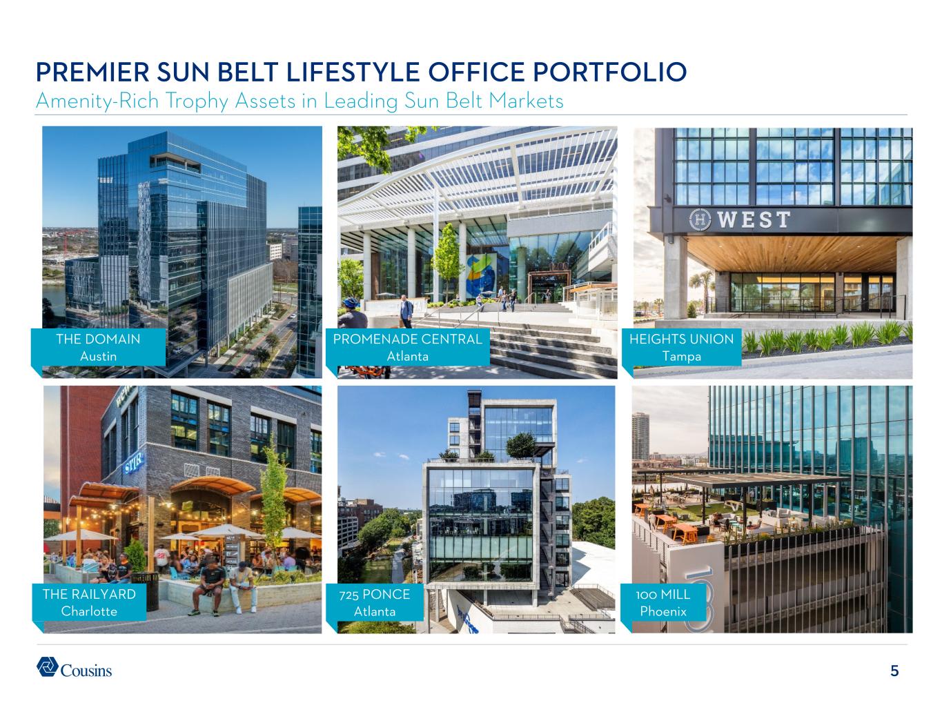 4 PREMIER SUN BELT LIFESTYLE OFFICE PORTFOLIO Lifestyle Office has Emerged as a Distinct and Desirable Property Type COMMODITY OFFICE ASSETS New or recently redeveloped properties that command premium rents and enjoy higher occupancy Located in the best markets and submarkets with close proximity to thriving and dynamic neighborhoods Highly-amenitized including on-site retail & food, activated outdoor space, collaboration & meeting space, state-of-the art fitness options with locker rooms Inspired design and efficient systems and floorplates are becoming gating factors for increasingly discerning customers LIFESTYLE OFFICE ASSETS × Older vintage assets with few or no in-building amenities and limited outdoor activation × Proximity to single-use office districts with challenging walkability and post work entertainment options × Dated designs as well as inefficient building systems and floorplates with bland common areas × Fundamental interior features – low ceiling heights, small windows, etc. – are uneconomic to change or improve through redevelopment × Inconvenient and exposed surface parking Companies are recognizing the importance of desirable office space in recruitment, retention and culture Large portions have become obsolete and unleasable – eventually will be redeveloped into another use