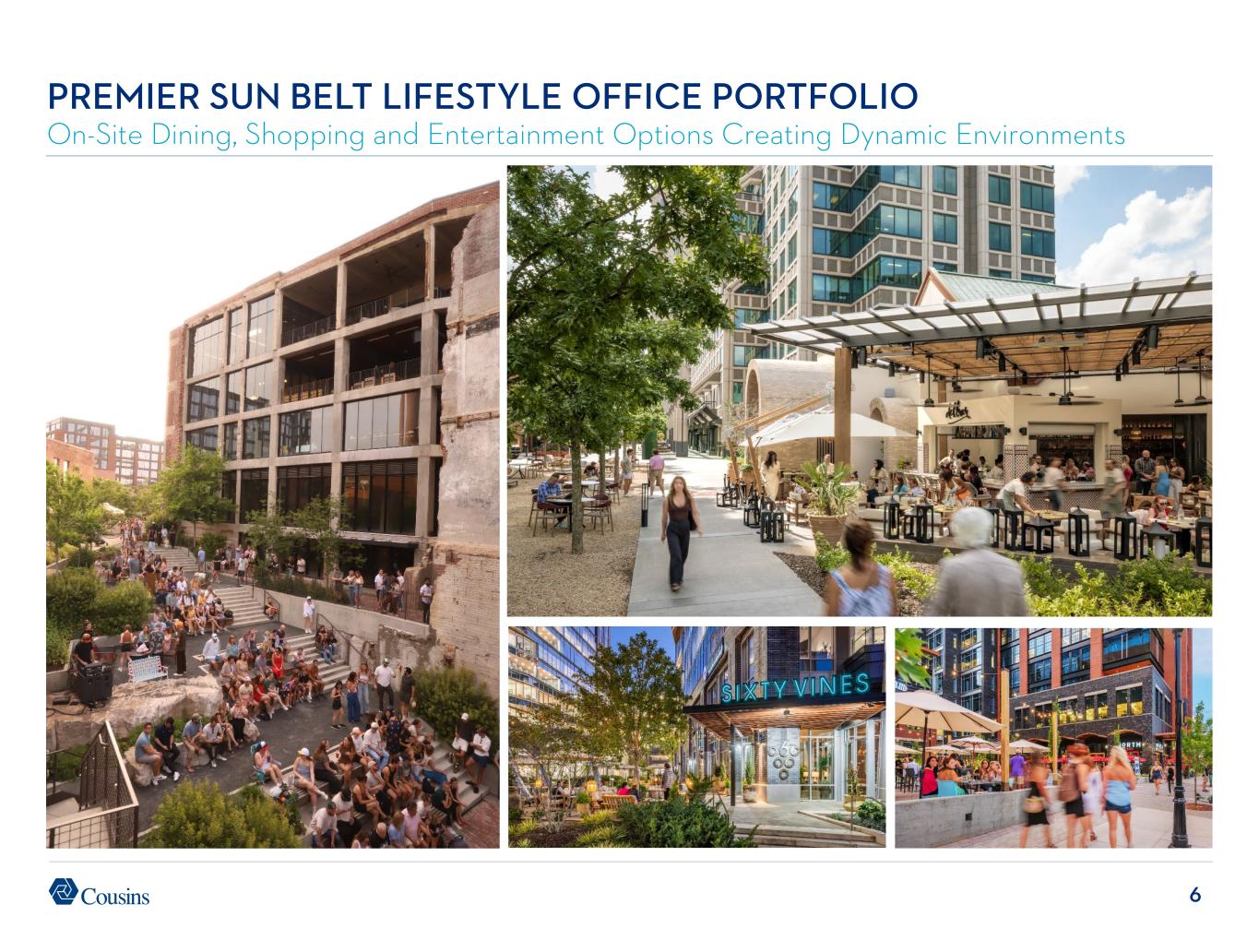 5 PREMIER SUN BELT LIFESTYLE OFFICE PORTFOLIO Amenity-Rich Trophy Assets in Leading Sun Belt Markets 725 PONCE Atlanta HEIGHTS UNION Tampa THE RAILYARD Charlotte 100 MILL Phoenix THE DOMAIN Austin PROMENADE CENTRAL Atlanta