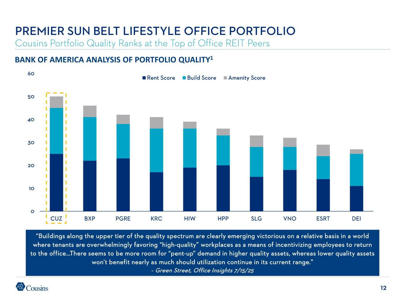 12 PREMIER SUN BELT LIFESTYLE OFFICE PORTFOLIO Cousins Portfolio Quality Ranks at the Top of Office REIT Peers 0 10 20 30 40 50 60 CUZ BXP PGRE KRC HIW HPP SLG VNO ESRT DEI Rent Score Build Score Amenity Score BANK OF AMERICA ANALYSIS OF PORTFOLIO QUALITY1 “Buildings along the upper tier of the quality spectrum are clearly emerging victorious on a relative basis in a world where tenants are overwhelmingly favoring “high-quality” workplaces as a means of incentivizing employees to return to the office...There seems to be more room for “pent-up” demand in higher quality assets, whereas lower quality assets won’t benefit nearly as much should utilization continue in its current range.” - Green Street, Office Insights 7/15/25