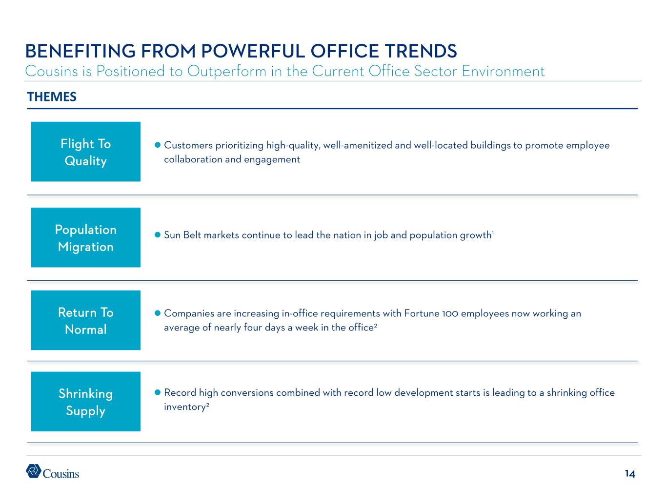 13 ATLANTA AUSTIN CHARLOTTE DALLAS PHOENIX TAMPA CLASS A ASKING RENT ($/SF)1,2 PREMIER SUN BELT LIFESTYLE OFFICE PORTFOLIO Command Premium Rents 31% Higher than Class A Average in Our Core Markets $35.86 $47.88 Total Market $36.88 $66.63 Total Market $33.53 $52.12 Total Market $37.56 $48.13 Total Market $52.43 $62.11 Total Market $40.86 $50.91 Total Market