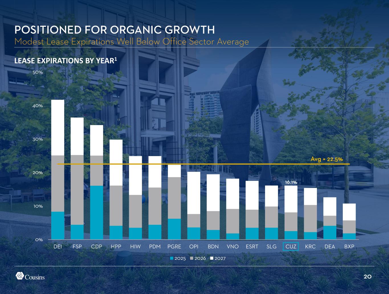 20 0% 10% 20% 30% 40% 50% DEI FSP CDP HPP HIW PDM PGRE OPI BDN VNO ESRT SLG CUZ KRC DEA BXP 2025 2026 2027 LEASE EXPIRATIONS BY YEAR1 POSITIONED FOR ORGANIC GROWTH Modest Lease Expirations Well Below Office Sector Average 16.1% Avg = 22.5%