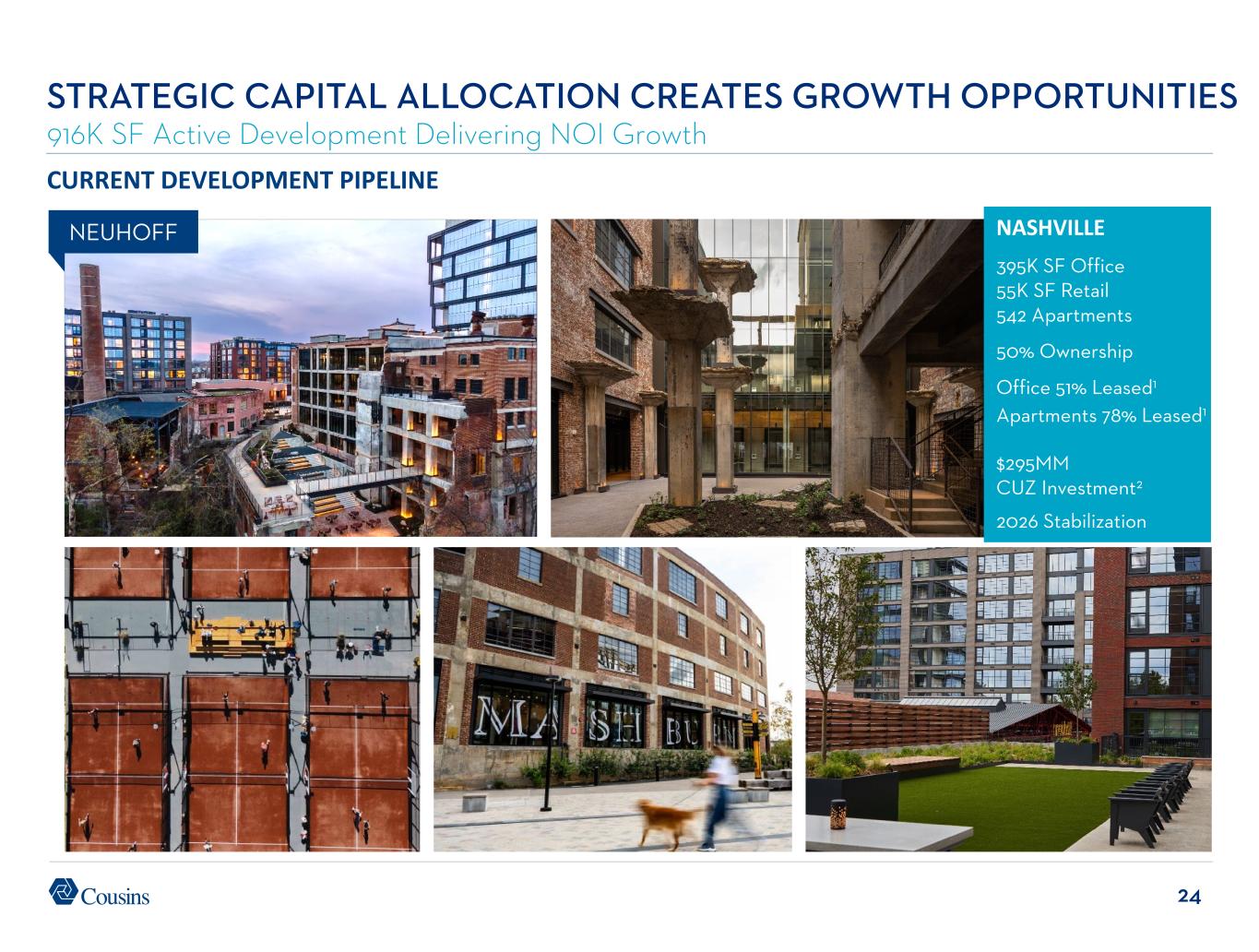 24 STRATEGIC CAPITAL ALLOCATION CREATES GROWTH OPPORTUNITIES 916K SF Active Development Delivering NOI Growth NEUHOFF CURRENT DEVELOPMENT PIPELINE NASHVILLE 395K SF Office 55K SF Retail 542 Apartments 50% Ownership Office 51% Leased1 Apartments 78% Leased1 $295MM CUZ Investment2 2026 Stabilization