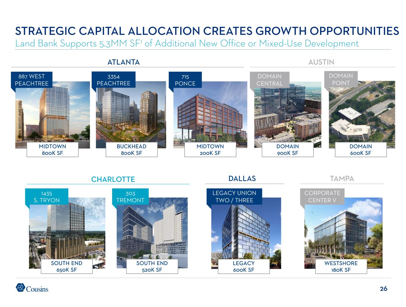25 STRATEGIC CAPITAL ALLOCATION CREATES GROWTH OPPORTUNITIES Sourced over $1 Billion of Compelling New Acquisitions in Core Sun Belt Markets Since 2024 RECENT ACQUISITIONS MIDTOWN Atlanta PROSCENIUM $16.7MM1 SOUTH END Charlotte VANTAGE $328.5MM UPTOWN Dallas THE LINK $218MM DOWNTOWN Austin SAIL TOWER $521.8MM
