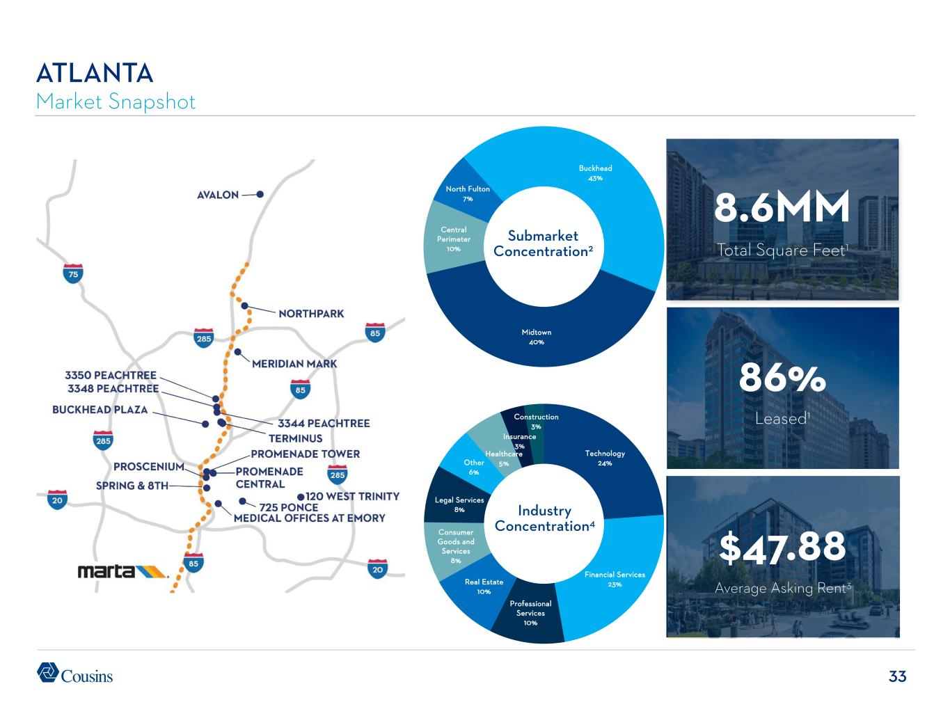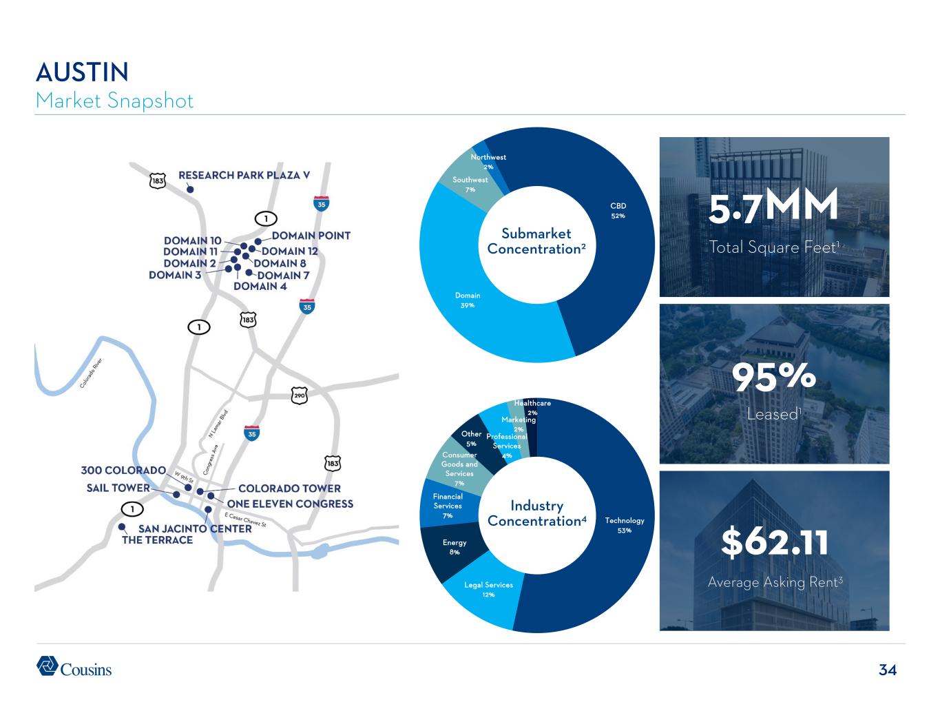 33 Submarket Concentration2 Industry Concentration4 ATLANTA Market Snapshot 8.6MM Total Square Feet1 86% Leased1 $47.88 Average Asking Rent3 Buckhead 43% Midtown 40% Central Perimeter 10% North Fulton 7% Technology 24% Financial Services 23% Professional Services 10% Real Estate 10% Consumer Goods and Services 8% Legal Services 8% Other 6% Healthcare 5% Insurance 3% Construction 3%