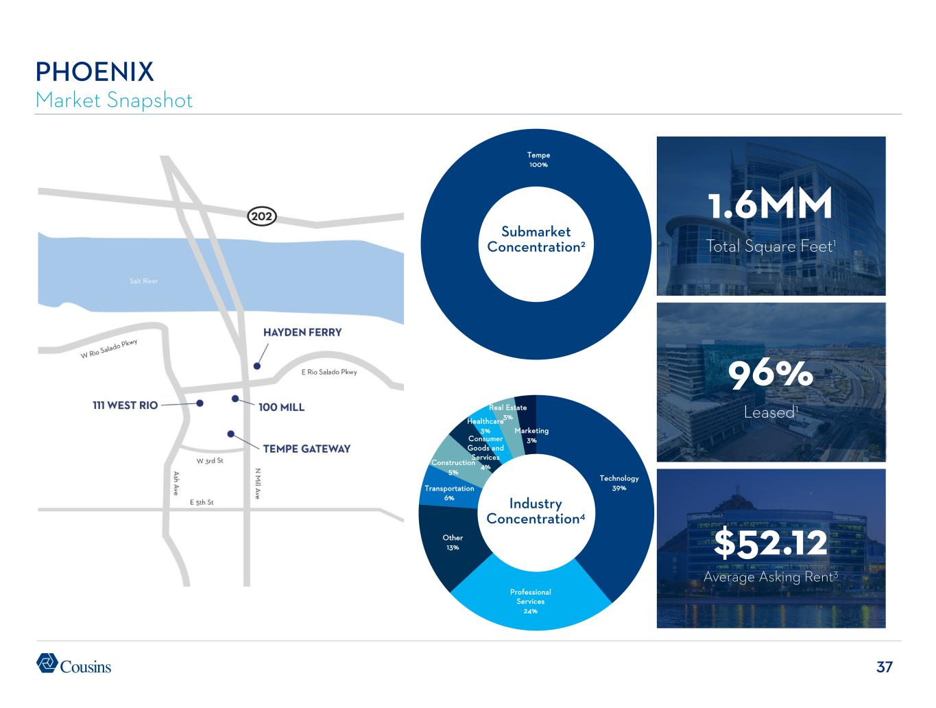 37 Tempe 100% PHOENIX Market Snapshot 96% Leased1 1.6MM Total Square Feet1 Submarket Concentration2 Industry Concentration4 $52.12 Average Asking Rent3 Technology 39% Professional Services 24% Other 13% Transportation 6% Construction 5% Consumer Goods and Services 4% Healthcare 3% Real Estate 3% Marketing 3%