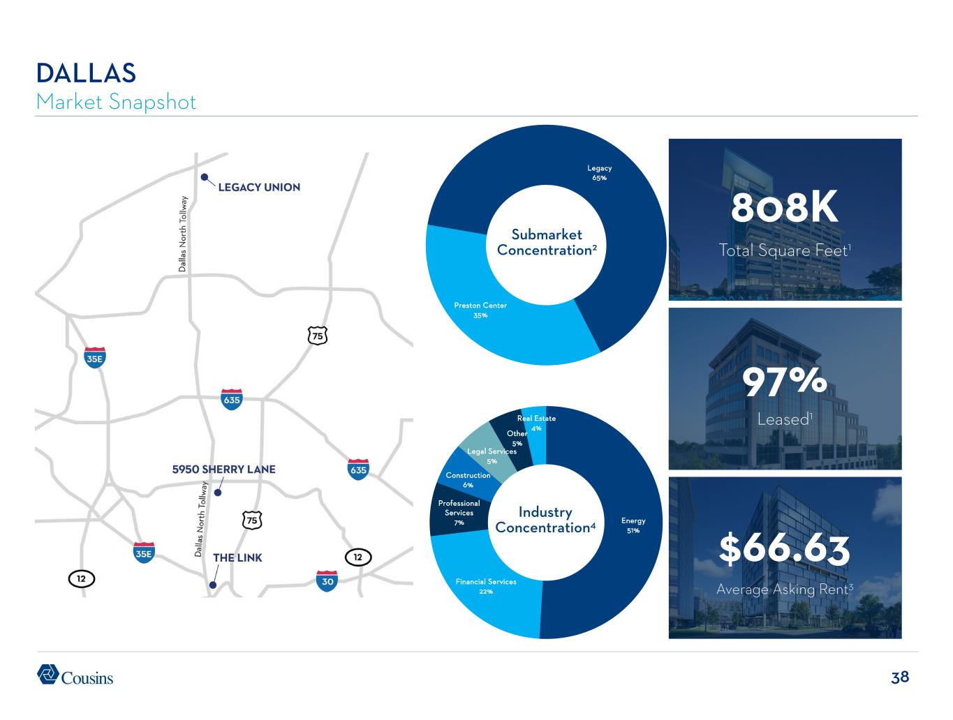 38 DALLAS Market Snapshot 97% Leased1 808K Total Square Feet1 $66.63 Average Asking Rent3 Submarket Concentration2 Industry Concentration4 Energy 51% Financial Services 22% Professional Services 7% Construction 6% Legal Services 5% Other 5% Real Estate 4% Preston Center 35% Legacy 65%