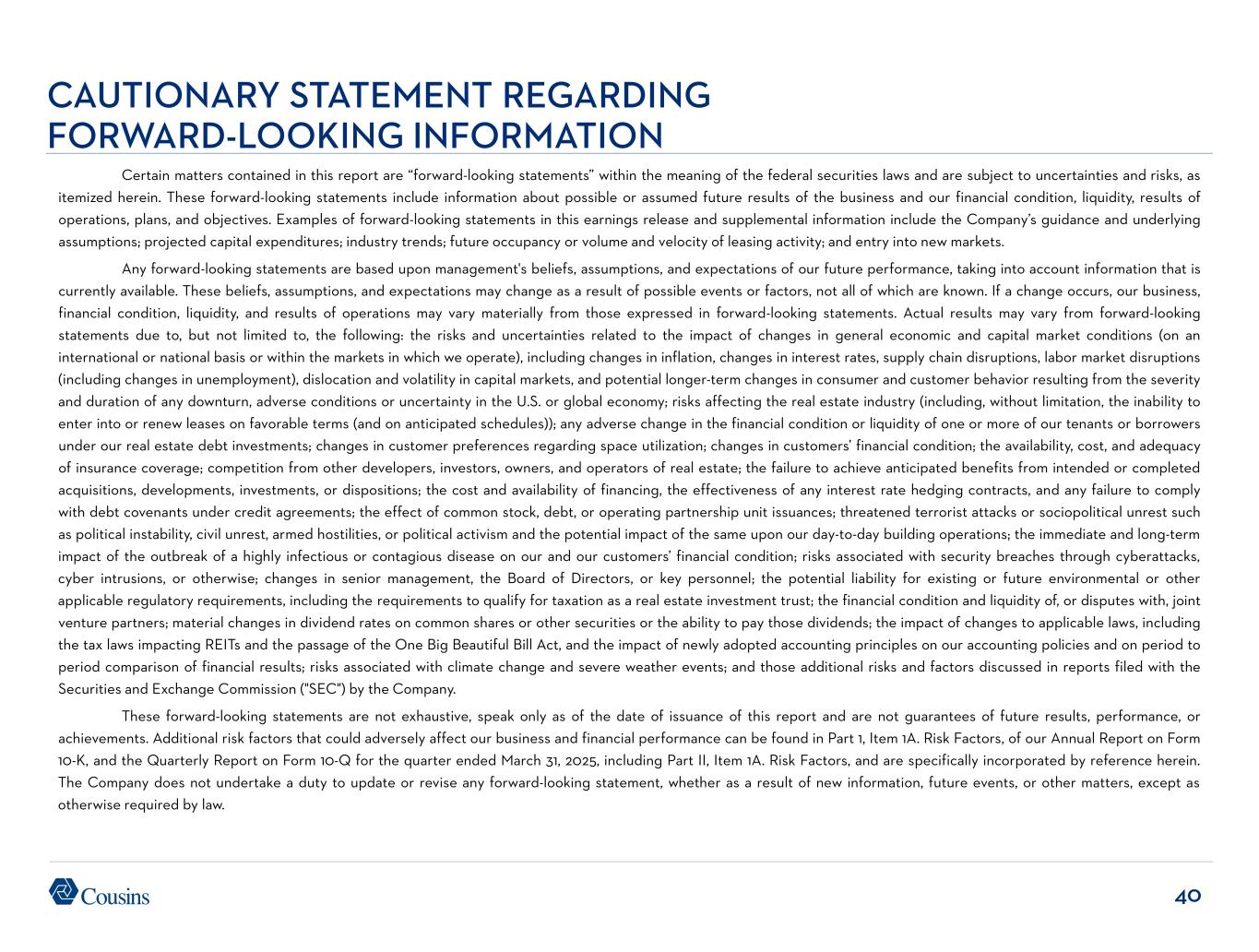 40 CAUTIONARY STATEMENT REGARDING FORWARD-LOOKING INFORMATION Certain matters contained in this report are “forward-looking statements” within the meaning of the federal securities laws and are subject to uncertainties and risks, as itemized herein. These forward-looking statements include information about possible or assumed future results of the business and our financial condition, liquidity, results of operations, plans, and objectives. Examples of forward-looking statements in this earnings release and supplemental information include the Company’s guidance and underlying assumptions; projected capital expenditures; industry trends; future occupancy or volume and velocity of leasing activity; and entry into new markets. Any forward-looking statements are based upon management's beliefs, assumptions, and expectations of our future performance, taking into account information that is currently available. These beliefs, assumptions, and expectations may change as a result of possible events or factors, not all of which are known. If a change occurs, our business, financial condition, liquidity, and results of operations may vary materially from those expressed in forward-looking statements. Actual results may vary from forward-looking statements due to, but not limited to, the following: the risks and uncertainties related to the impact of changes in general economic and capital market conditions (on an international or national basis or within the markets in which we operate), including changes in inflation, changes in interest rates, supply chain disruptions, labor market disruptions (including changes in unemployment), dislocation and volatility in capital markets, and potential longer-term changes in consumer and customer behavior resulting from the severity and duration of any downturn, adverse conditions or uncertainty in the U.S. or global economy; risks affecting the real estate industry (including, without limitation, the inability to enter into or renew leases on favorable terms (and on anticipated schedules)); any adverse change in the financial condition or liquidity of one or more of our tenants or borrowers under our real estate debt investments; changes in customer preferences regarding space utilization; changes in customers’ financial condition; the availability, cost, and adequacy of insurance coverage; competition from other developers, investors, owners, and operators of real estate; the failure to achieve anticipated benefits from intended or completed acquisitions, developments, investments, or dispositions; the cost and availability of financing, the effectiveness of any interest rate hedging contracts, and any failure to comply with debt covenants under credit agreements; the effect of common stock, debt, or operating partnership unit issuances; threatened terrorist attacks or sociopolitical unrest such as political instability, civil unrest, armed hostilities, or political activism and the potential impact of the same upon our day-to-day building operations; the immediate and long-term impact of the outbreak of a highly infectious or contagious disease on our and our customers’ financial condition; risks associated with security breaches through cyberattacks, cyber intrusions, or otherwise; changes in senior management, the Board of Directors, or key personnel; the potential liability for existing or future environmental or other applicable regulatory requirements, including the requirements to qualify for taxation as a real estate investment trust; the financial condition and liquidity of, or disputes with, joint venture partners; material changes in dividend rates on common shares or other securities or the ability to pay those dividends; the impact of changes to applicable laws, including the tax laws impacting REITs and the passage of the One Big Beautiful Bill Act, and the impact of newly adopted accounting principles on our accounting policies and on period to period comparison of financial results; risks associated with climate change and severe weather events; and those additional risks and factors discussed in reports filed with the Securities and Exchange Commission ("SEC") by the Company. These forward-looking statements are not exhaustive, speak only as of the date of issuance of this report and are not guarantees of future results, performance, or achievements. Additional risk factors that could adversely affect our business and financial performance can be found in Part 1, Item 1A. Risk Factors, of our Annual Report on Form 10-K, and the Quarterly Report on Form 10-Q for the quarter ended March 31, 2025, including Part II, Item 1A. Risk Factors, and are specifically incorporated by reference herein. The Company does not undertake a duty to update or revise any forward-looking statement, whether as a result of new information, future events, or other matters, except as otherwise required by law.