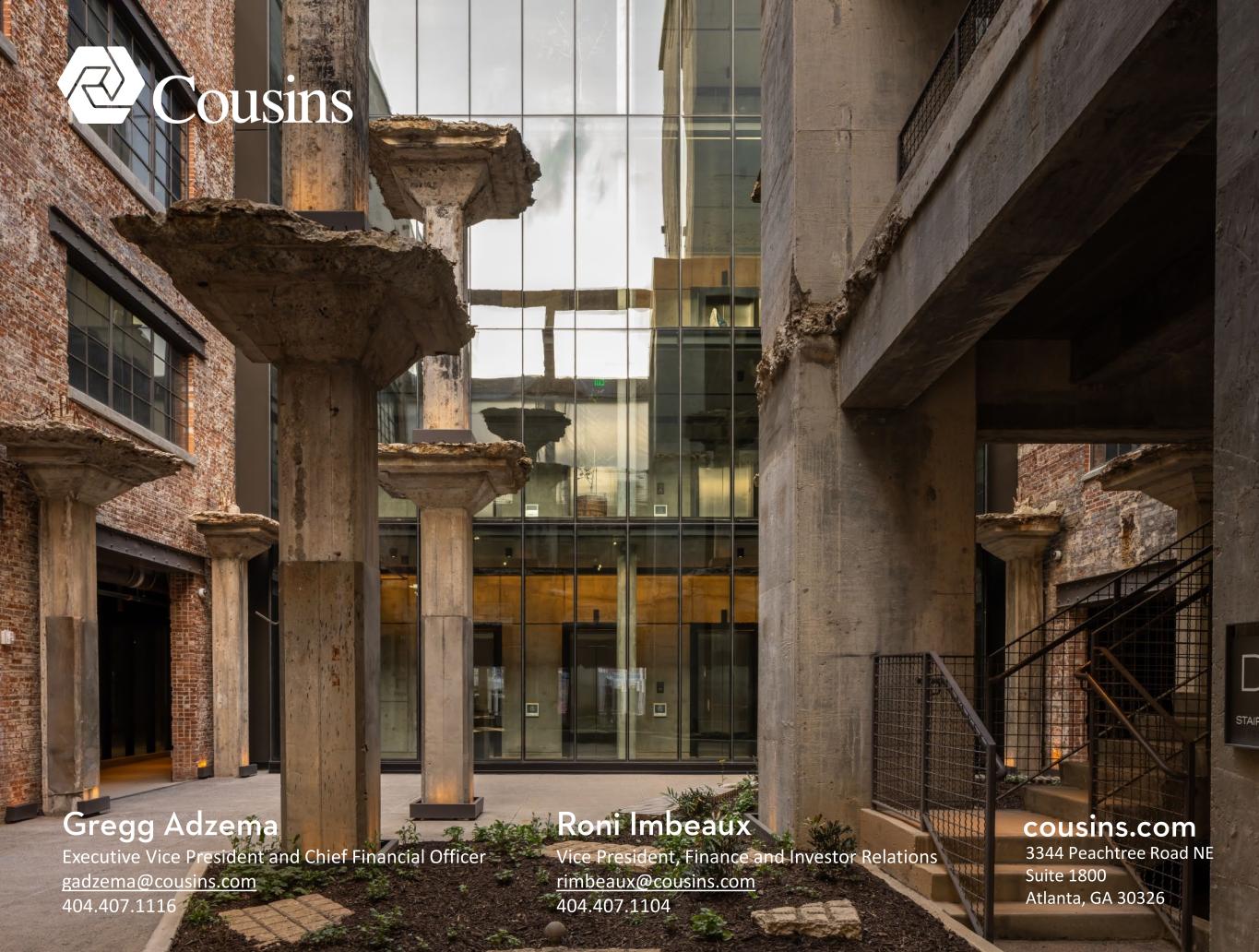 3344 Peachtree Road NE Suite 1800 Atlanta, GA 30326 cousins.comGregg Adzema Executive Vice President and Chief Financial Officer gadzema@cousins.com 404.407.1116 Roni Imbeaux Vice President, Finance and Investor Relations rimbeaux@cousins.com 404.407.1104