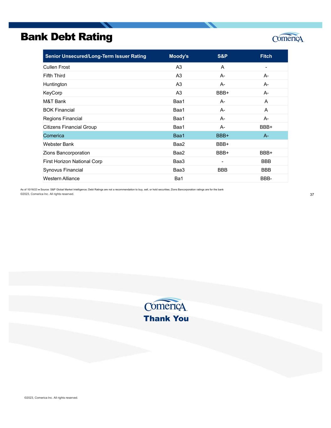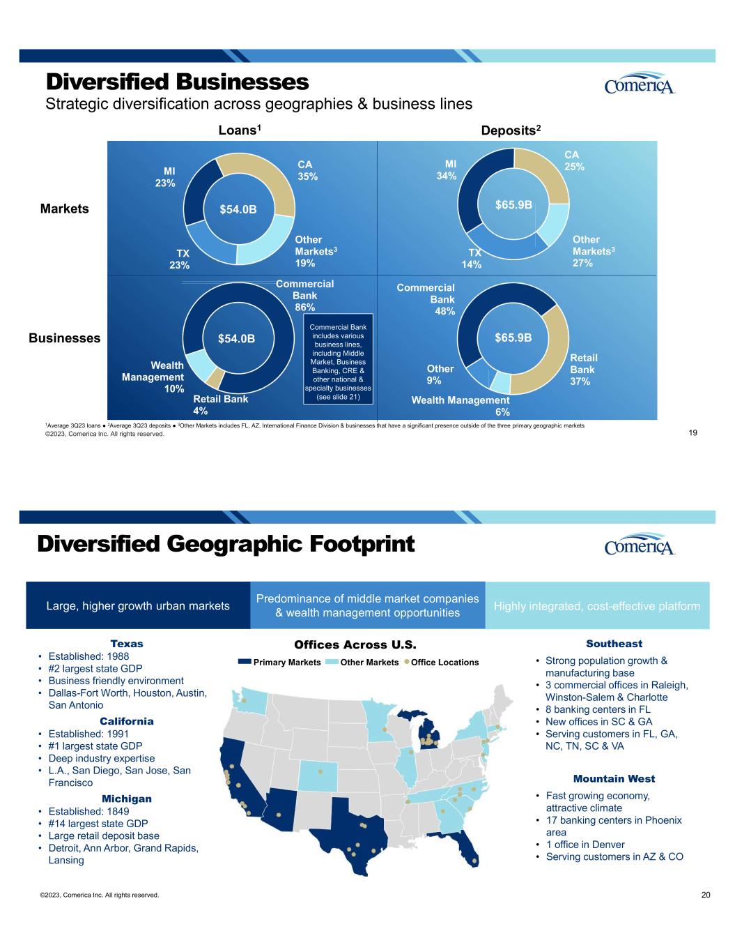 コメリカの事業は戦略的に、コマーシャル・バンク、リテール・バンク、ウェルス・マネジメン トの3つの主要事業セグメントに分類されている。金融部門もセグメントとして報告されています。事業セグメントの四半期業績の概要については、本プレスリリースの後半に掲載されている「事業セグメントの業績」の表をご参照ください。時折、コメリカは経営陣のセグメントに対する現在の見解を反映するため、セグメント間の再分類を行うことがあり、また管理会計システムの強化や組織構造および/または商品ラインに変更が生じた場合、方法論が修正されることがあります。財務情報は、2023年9月30日現在有効なコメリカの内部事業部門構造および方法論に基づいている。ビジネス・セグメントの累計業績に関する議論は、コメリカの 2023 年第 3 四半期 Form 10-Q に記載される予定である。