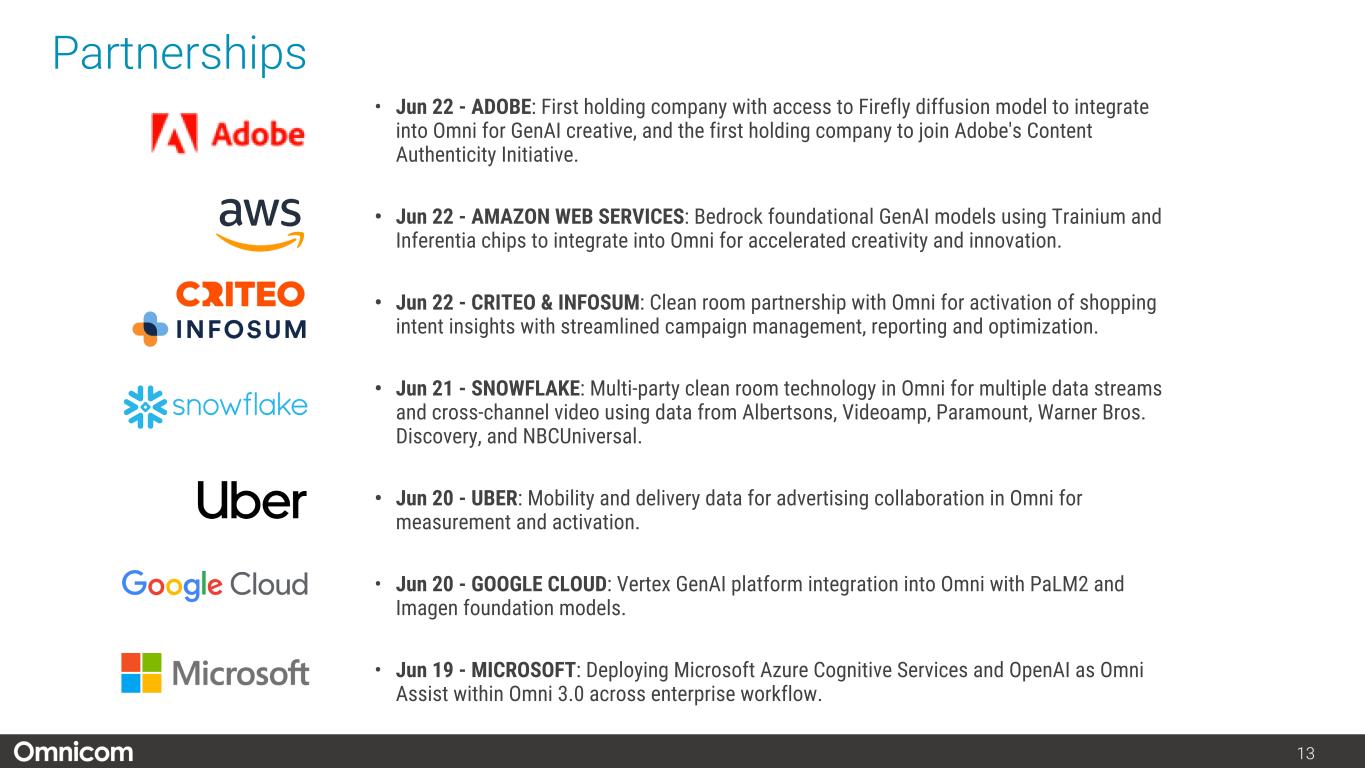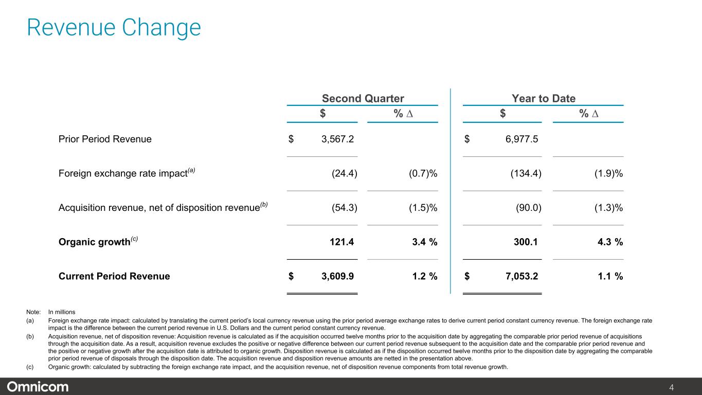"Organic revenue grew 3.4% in the second quarter and 4.3% year-to-date, placing us comfortably within our expected range and driving strong growth in earnings per share,” said John Wren, Chairman and Chief Executive Officer of Omnicom. “While the balance of the year will continue to see economic uncertainty, we are entering a dynamic and exciting new era for our company.” Wren added, “Omnicom has secured leading positions in generative AI technologies and partnerships to deliver on our promise to achieve the best outcomes for our clients and increase the operational efficiency of our company."