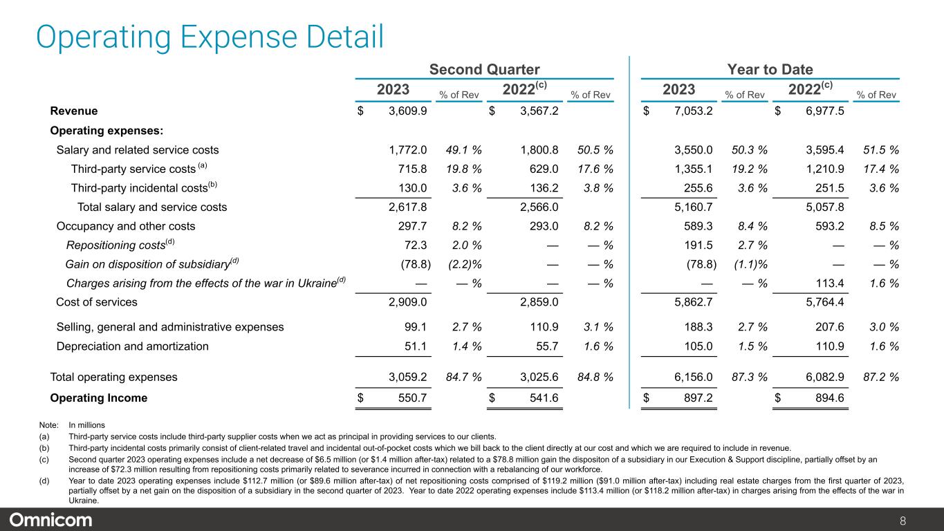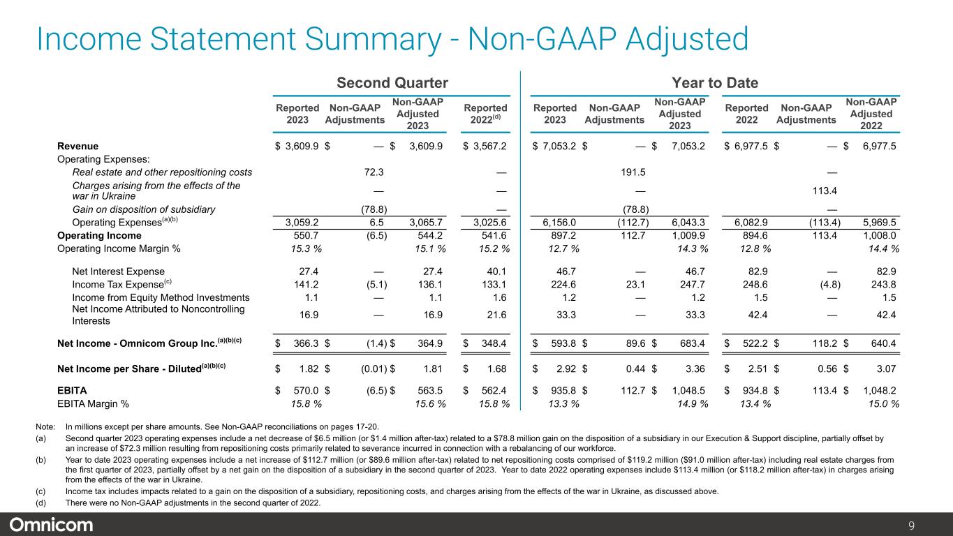 Notes: 1) Net Income and Net Income per Share for Omnicom Group Inc.; 2) Second quarter 2023 operating income includes a net increase of $6.5 million (and an increase in net income of $1.4 million) related to a gain on the disposition of a subsidiary of $78.8 million ($55.9 million net of tax) in our Execution and Support discipline, partially offset by a decrease of $72.3 million ($54.5 million net of tax) resulting from repositioning costs primarily related to severance. Please refer to non-GAAP adjusted reconciliations starting on page