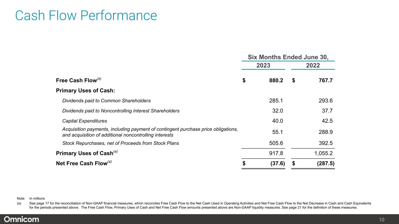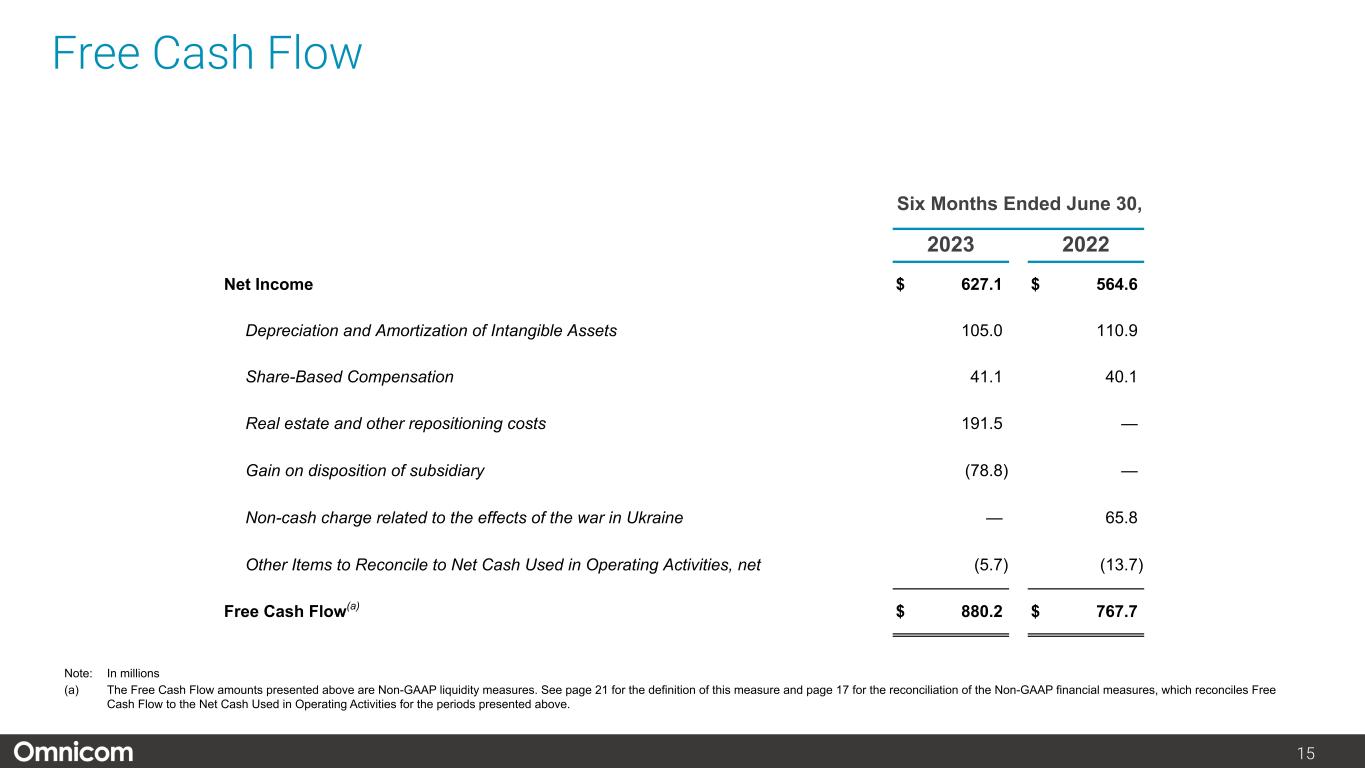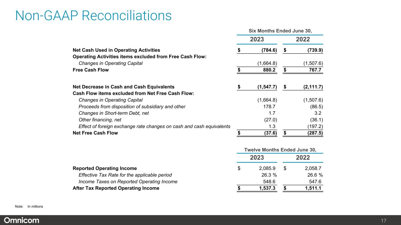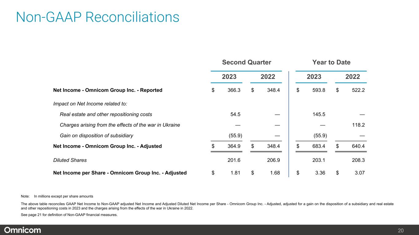 Net income - Omnicom Group Inc. for the second quarter of 2023 increased $17.9 million, or 5.1%, to $366.3 million compared to the second quarter of 2022. The net impact of the gain on the disposition of a subsidiary, offset by repositioning costs, increased Net income - Omnicom Group Inc. by $1.4 million. Diluted shares outstanding decreased to 201.6 million, or 2.6%, from 206.9 million in the second quarter of 2022 as a result of net share repurchases. Diluted net income per share of $1.82 increased $0.14, or 8.3%, from $1.68 per share. Excluding the net effect of a gain on the disposition of a subsidiary, offset by repositioning costs, non-GAAP adjusted diluted earnings per share for the second quarter of 2023 was $1.81.