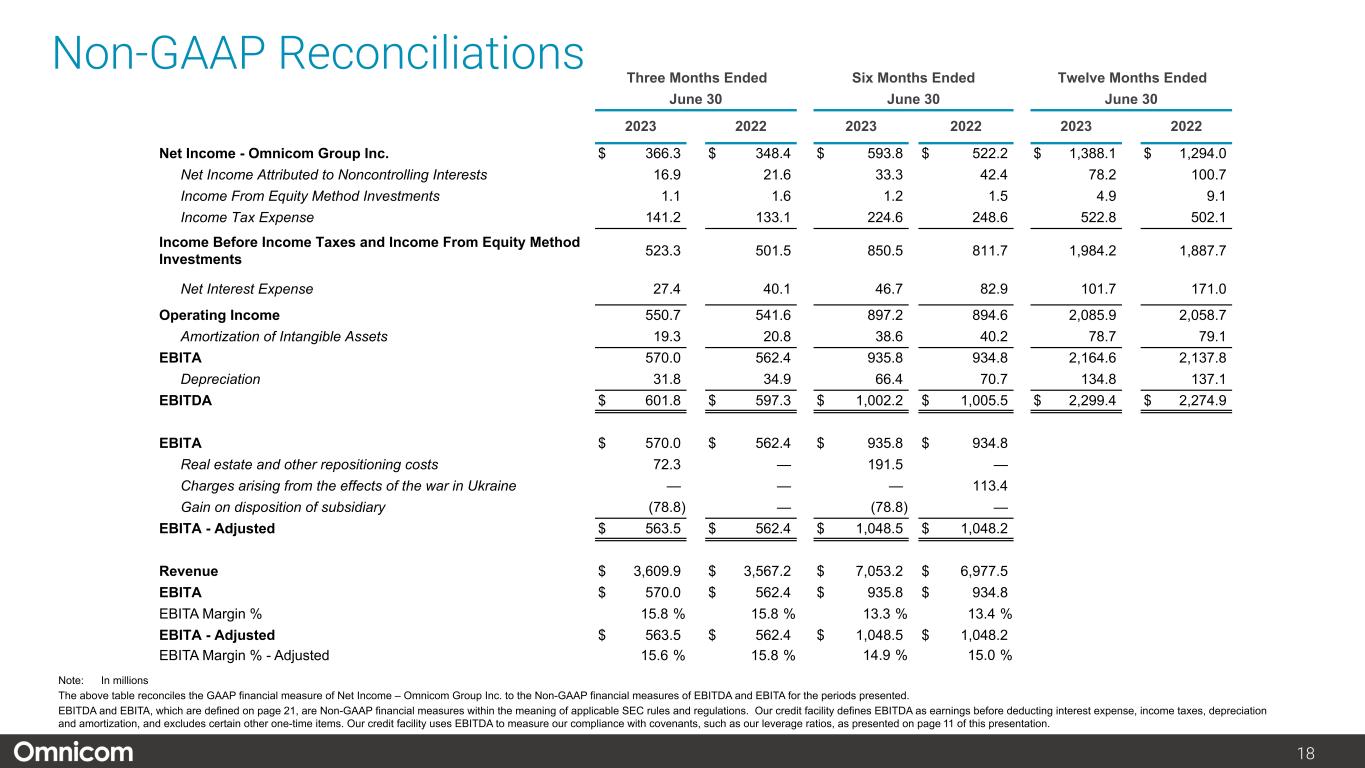 The above table reconciles the U.S. GAAP financial measure of Net Income - Omnicom Group Inc. to EBITA (defined as earnings before interest, taxes and amortization of intangible assets) and EBITA Margin (defined as EBITA divided by revenue) for the periods presented. The above table also presents non-GAAP adjustments to EBITA to present EBITA- Adjusted for the periods presented. We use EBITA and EBITA Margin as additional operating performance measures, which exclude the non-cash amortization expense of intangible assets (primarily consisting of amortization of intangible assets arising from acquisitions). Accordingly, we believe EBITA and EBITA Margin are useful measures for investors to evaluate the performance of our business.