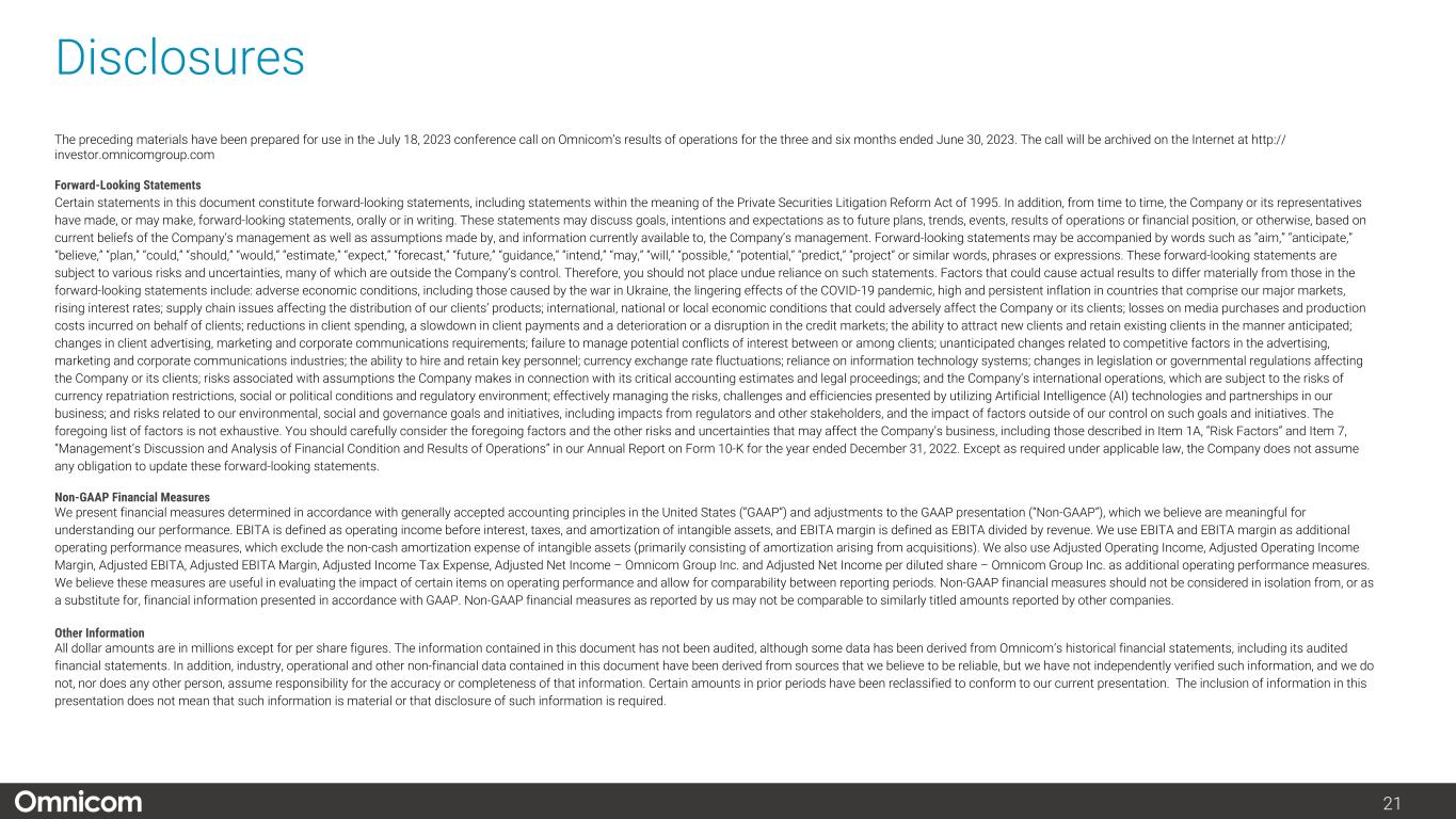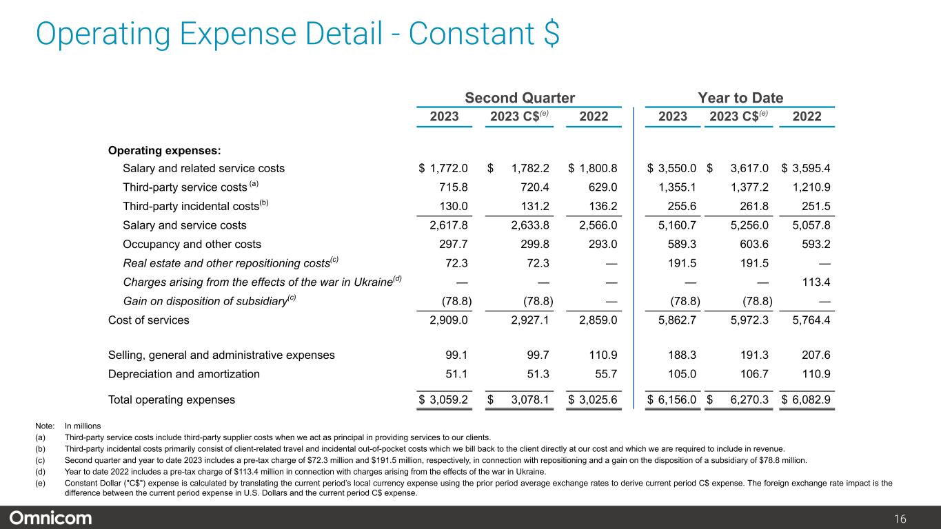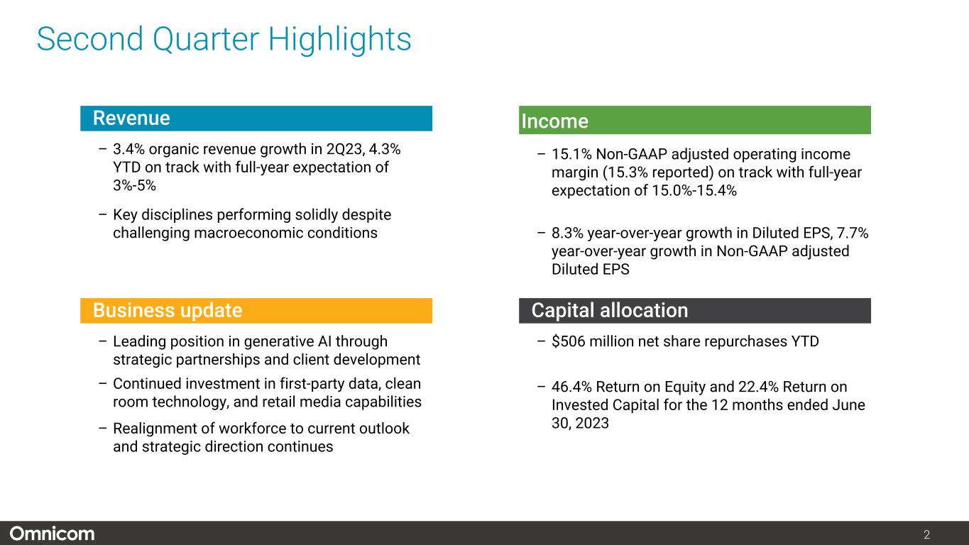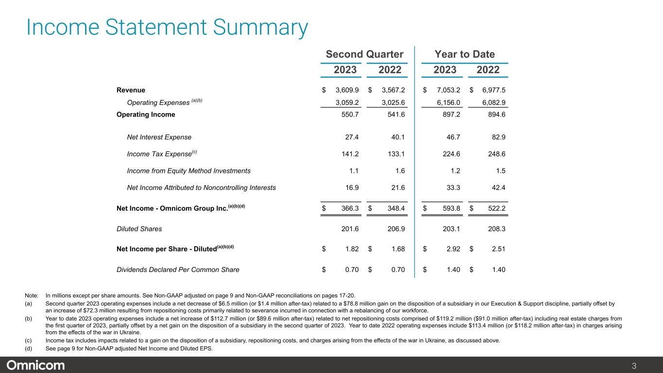 注1) オムニコム・グループ Inc.の純利益および1株当たり純利益、2) 2023年度第2四半期の営業利益には、エグゼキューション&サポート部門の子会社売却益7,880万ドル(税引き後5,590万ドル)に関連する純増650万ドル(および純利益140万ドルの増加)が含まれますが、主に退職に関連する再配置費用による7,230万ドル(税引き後5,450万ドル)の減少により一部相殺されました。8ページ以降の非GAAP調整後調整表をご参照ください。