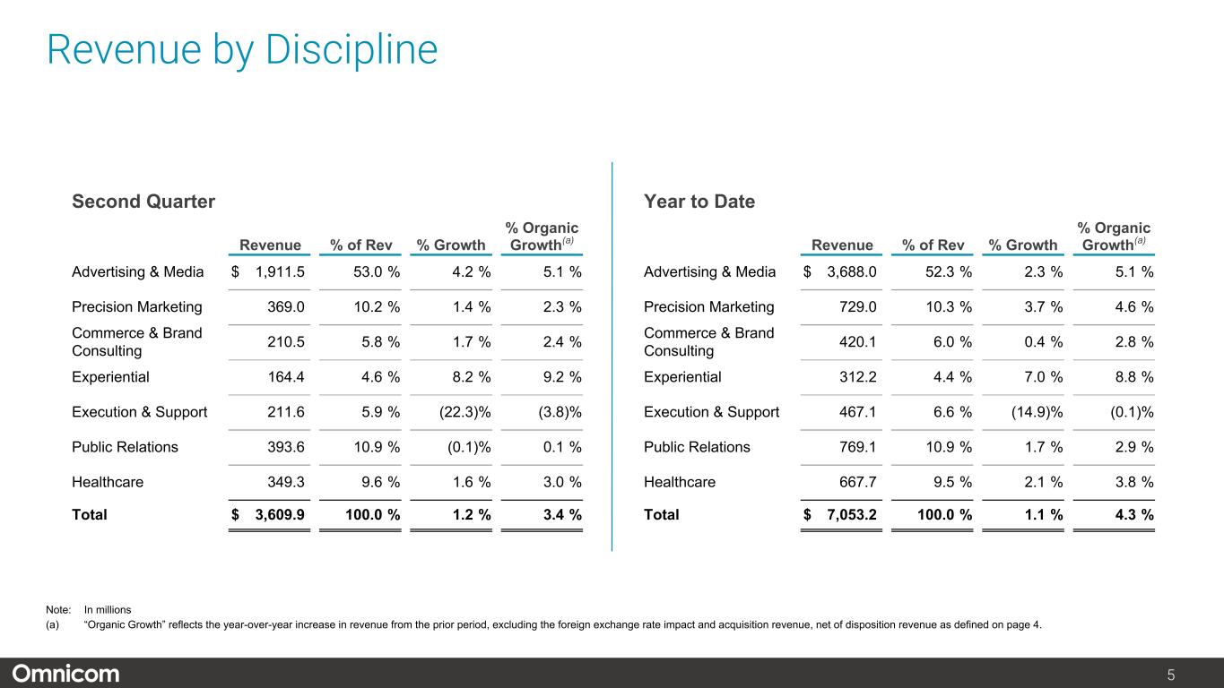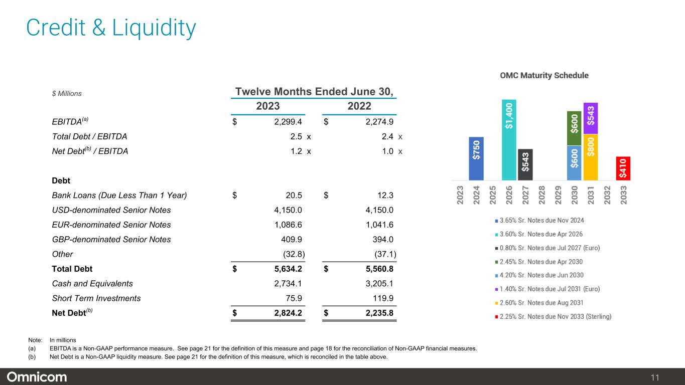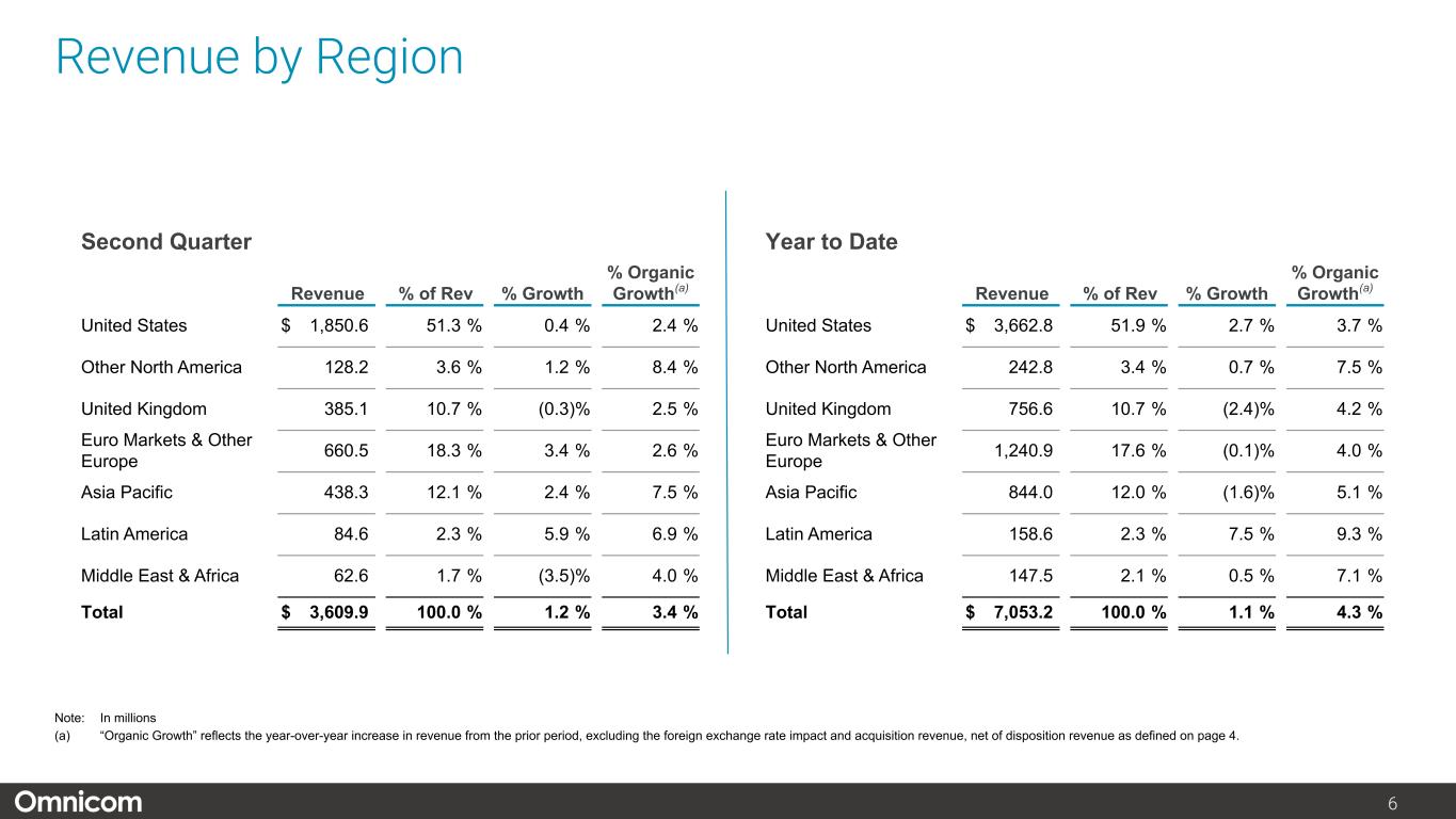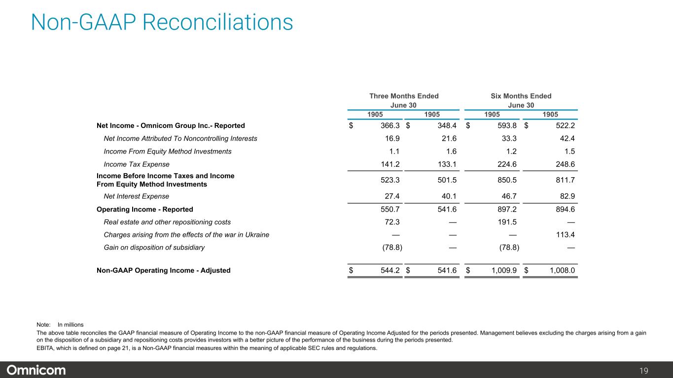 注1) オムニコム・グループ Inc.の純利益および1株当たり純利益、2) 2023年度第2四半期の営業利益には、エグゼキューション&サポート部門の子会社売却益7,880万ドル(税引き後5,590万ドル)に関連する純増650万ドル(および純利益140万ドルの増加)が含まれますが、主に退職に関連する再配置費用による7,230万ドル(税引き後5,450万ドル)の減少により一部相殺されました。8ページ以降の非GAAP調整後調整表をご参照ください。