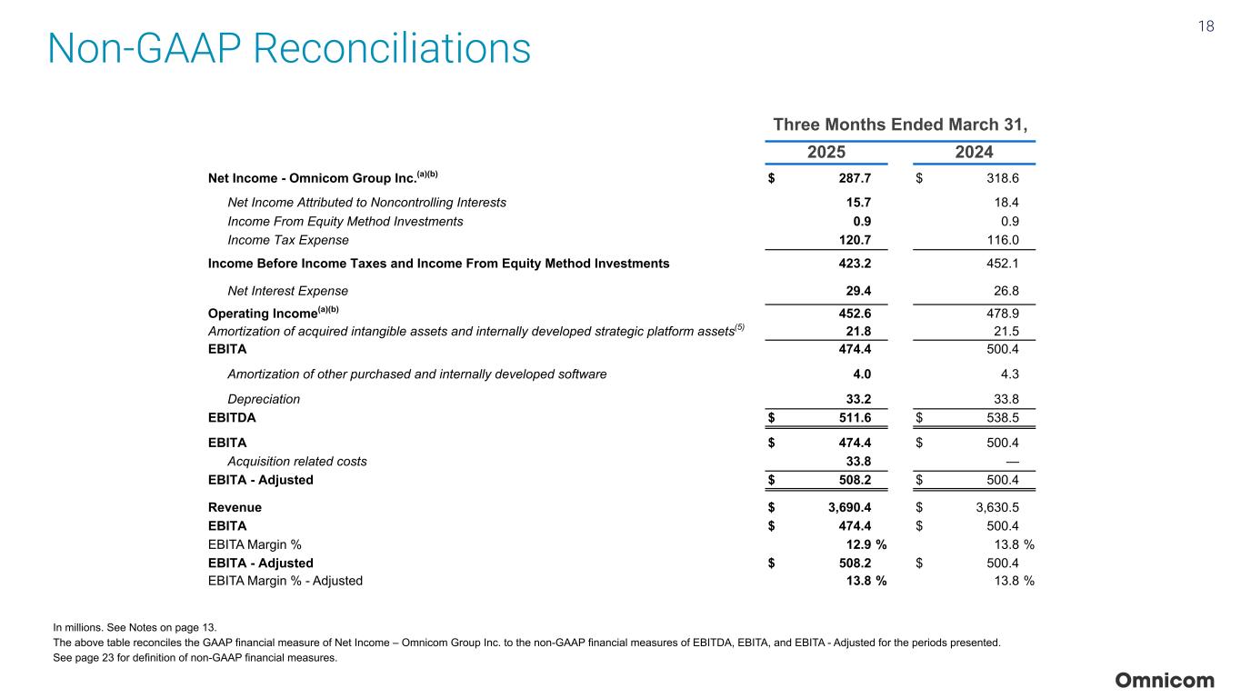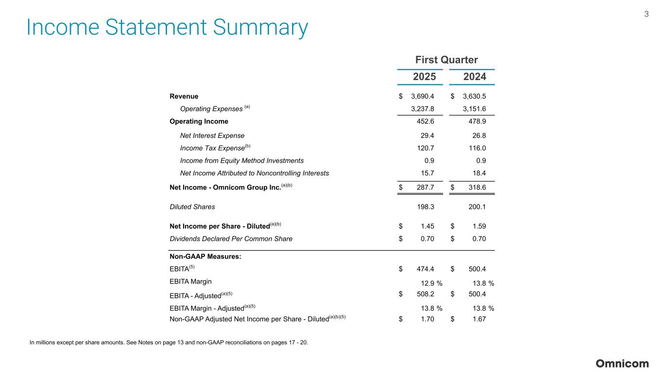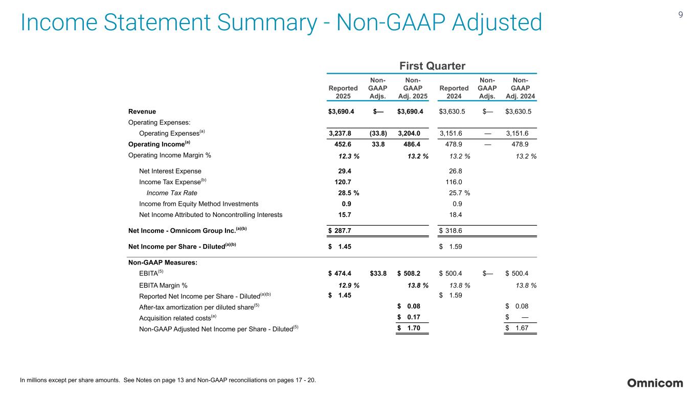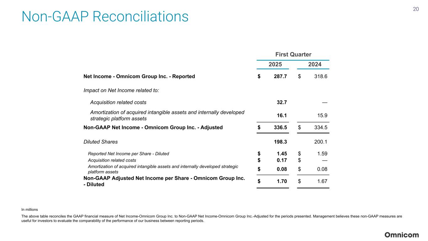 3) Weighted-average diluted shares for the three months ended March 31, 2025 and 2024 were 198.3 million and 200.1 million, respectively. The above tables reconcile the GAAP financial measures of Operating Income, Net Income - Omnicom Group Inc., and Net Income per Share - Diluted to adjusted Non-GAAP financial measures of Non-GAAP Operating Income - Adjusted, Non-GAAP Net Income-Omnicom Group Inc. - Adjusted and Non-GAAP Adjusted Net Income per Share - Diluted. Management believes these Non-GAAP measures are useful for investors to evaluate the comparability of the performance of our business year to year.