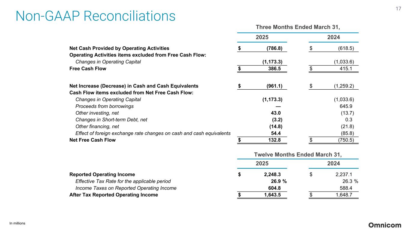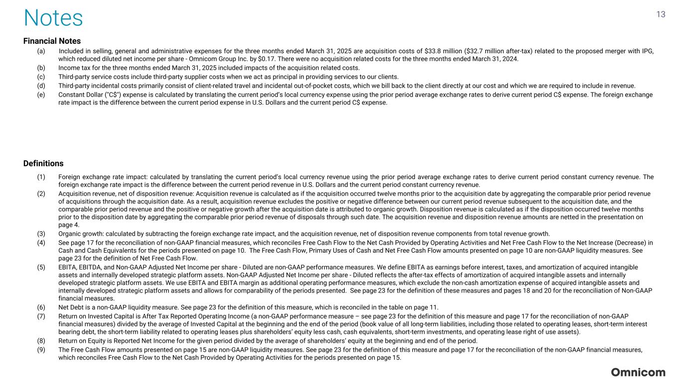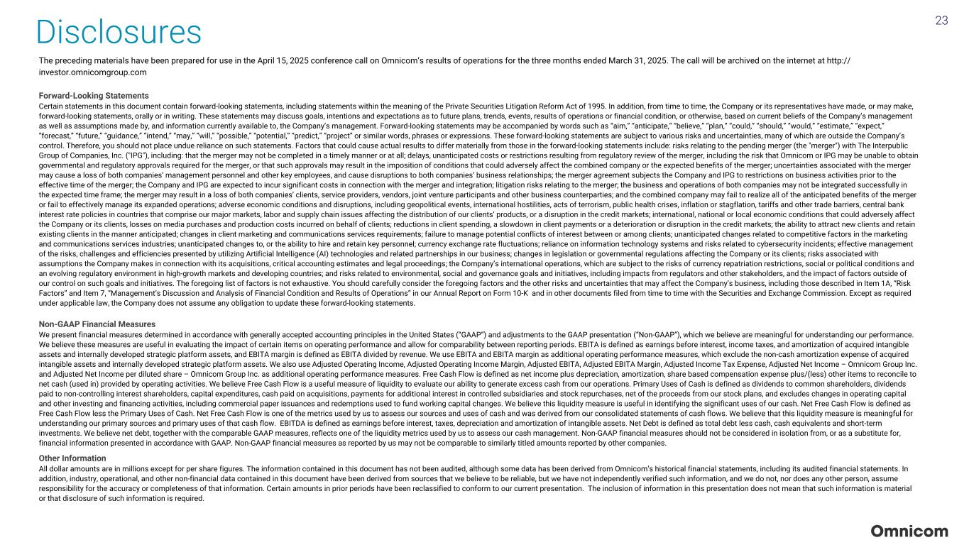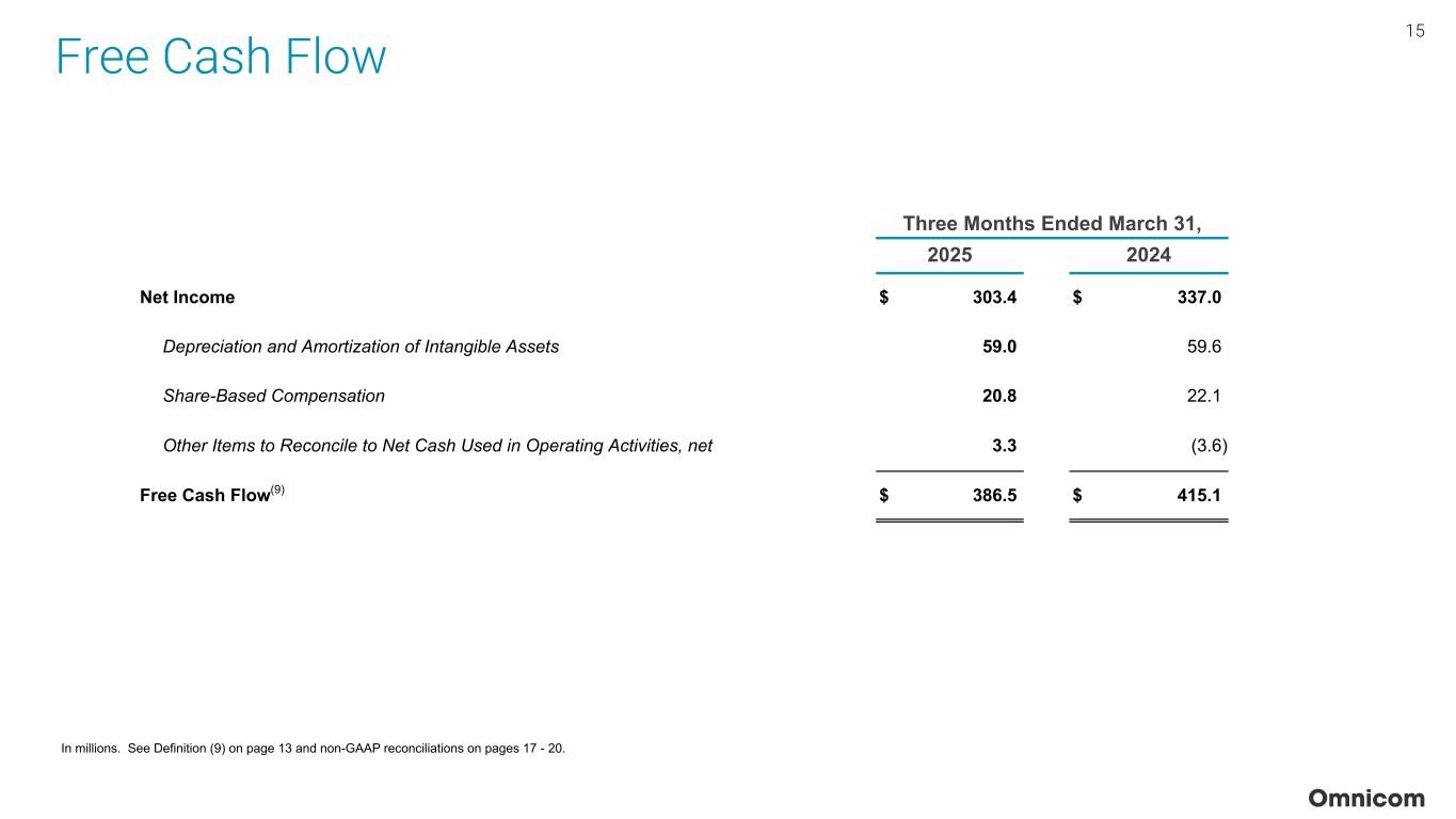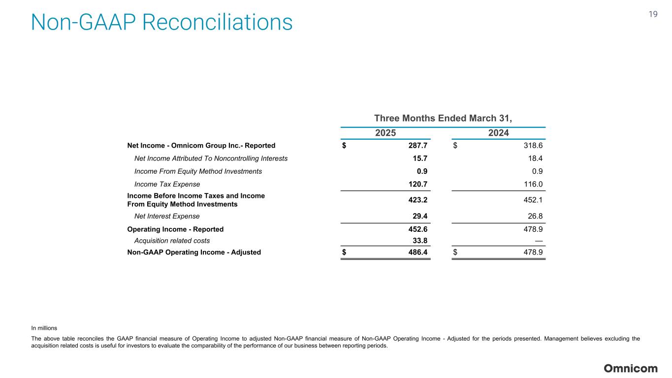 3) Weighted-average diluted shares for the three months ended March 31, 2025 and 2024 were 198.3 million and 200.1 million, respectively. The above tables reconcile the GAAP financial measures of Operating Income, Net Income - Omnicom Group Inc., and Net Income per Share - Diluted to adjusted Non-GAAP financial measures of Non-GAAP Operating Income - Adjusted, Non-GAAP Net Income-Omnicom Group Inc. - Adjusted and Non-GAAP Adjusted Net Income per Share - Diluted. Management believes these Non-GAAP measures are useful for investors to evaluate the comparability of the performance of our business year to year.