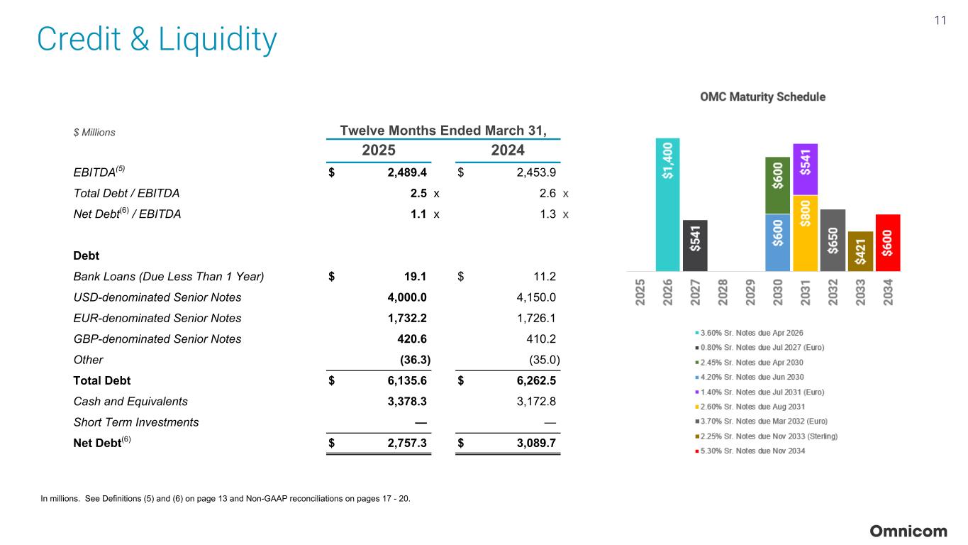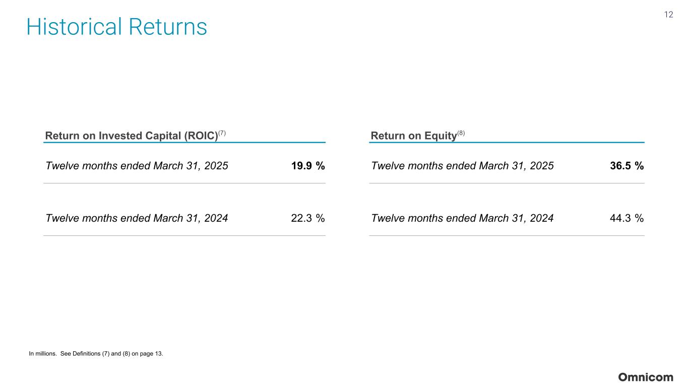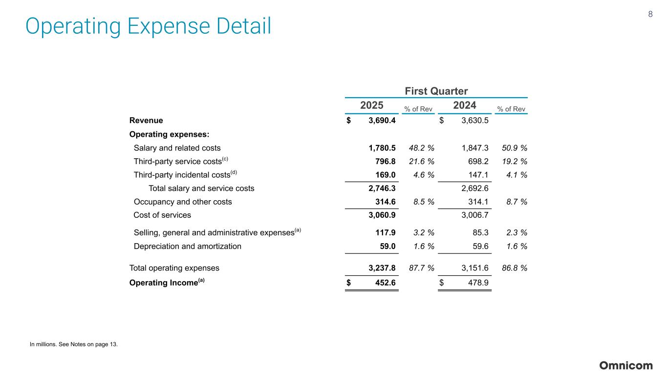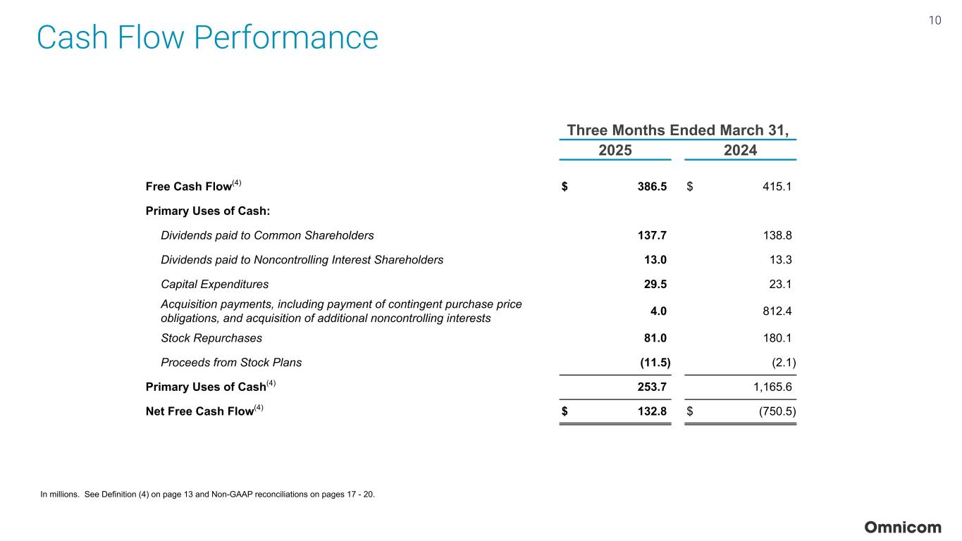 3) Weighted-average diluted shares for the three months ended March 31, 2025 and 2024 were 198.3 million and 200.1 million, respectively. The above tables reconcile the GAAP financial measures of Operating Income, Net Income - Omnicom Group Inc., and Net Income per Share - Diluted to adjusted Non-GAAP financial measures of Non-GAAP Operating Income - Adjusted, Non-GAAP Net Income-Omnicom Group Inc. - Adjusted and Non-GAAP Adjusted Net Income per Share - Diluted. Management believes these Non-GAAP measures are useful for investors to evaluate the comparability of the performance of our business year to year.