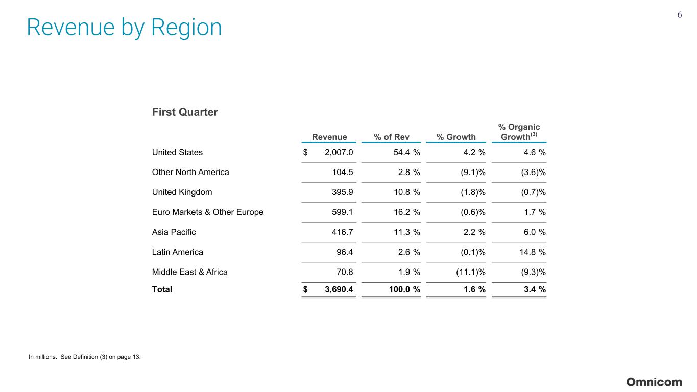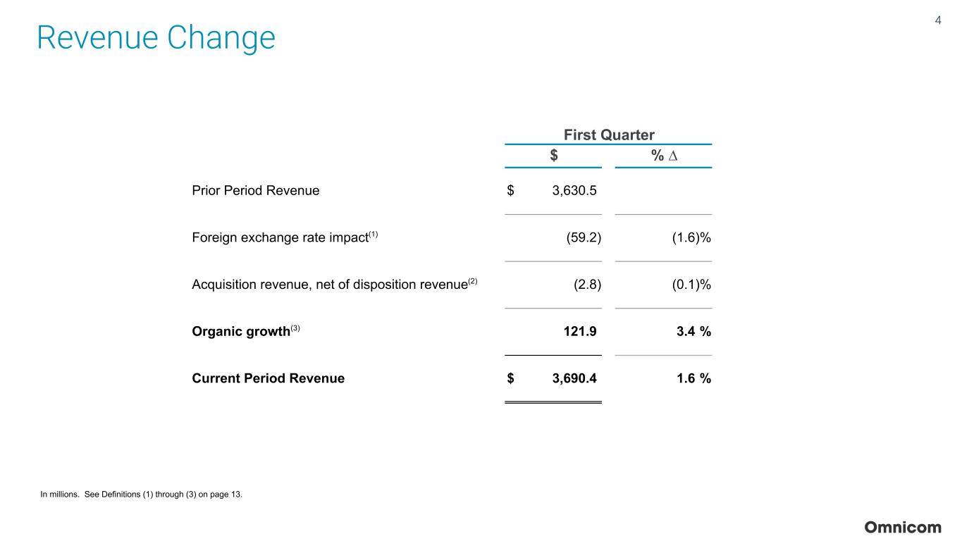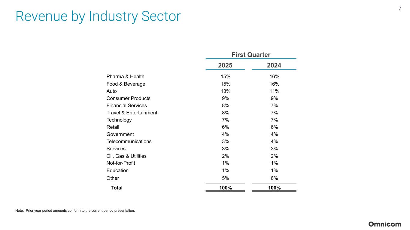 "Organic revenue growth for the first quarter was 3.4%. We are assessing the implications of economic and market events to determine how they will affect our clients and business for the remainder of 2025. While uncertainty has increased, one thing hasn’t changed and will always be true – Omnicom is a trusted partner for our clients, offering strategic advice to grow their sales while delivering flexibility, value and performance,” said John Wren, Chairman and Chief Executive Officer of Omnicom. “I am confident that our diversified portfolio and strong balance sheet, together with our experienced leadership teams, will allow us to navigate this challenging economic environment. We are also very excited about the expected closing of the Interpublic acquisition in the second half of this year. It will give the combined company substantial opportunities for revenue growth and distinctive cost synergy potential to drive increased profitability, EPS growth, and free cash flow."