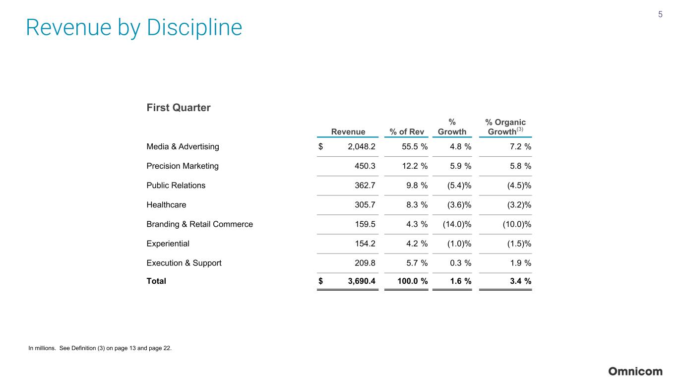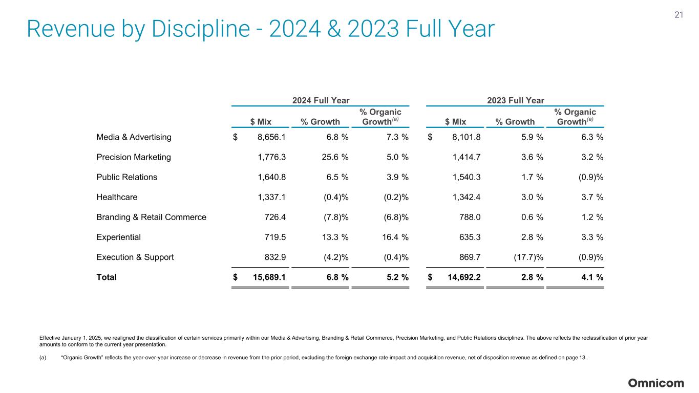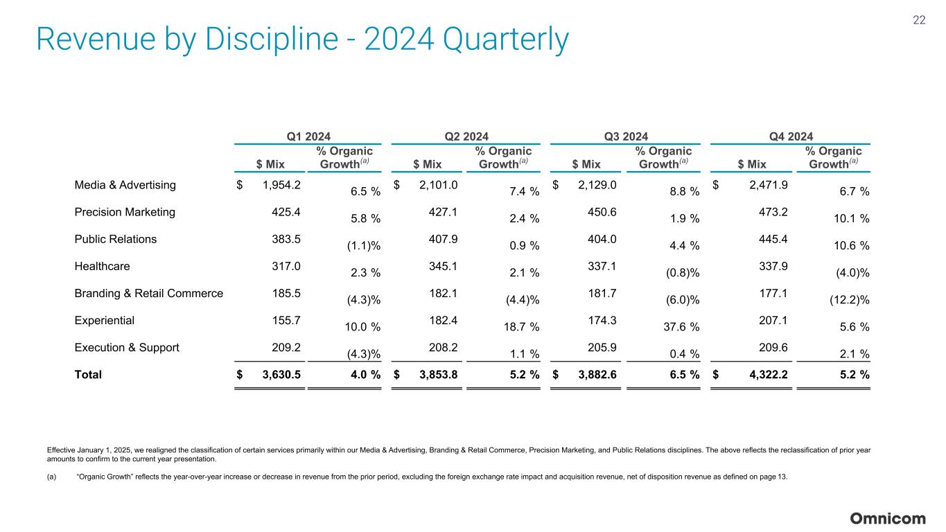 Organic growth by discipline in the first quarter of 2025 compared to the first quarter of 2024 was as follows: 7.2% for Media & Advertising, 5.8% for Precision Marketing, and 1.9% for Execution & Support, partially offset by declines of 4.5% for Public Relations, 3.2% for Healthcare, 1.5% for Experiential, and 10.0% for Branding & Retail Commerce. In the first quarter of 2025, we realigned the classification of certain services, primarily within our Media & Advertising, Branding & Retail Commerce, Precision Marketing, and Public Relations disciplines. As a result, we reclassified the prior year periods to be consistent with the revised classifications.