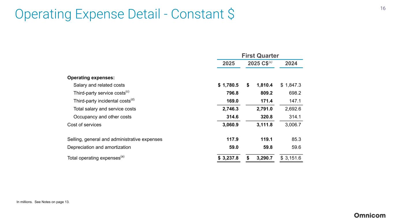 Operating expenses increased $86.2 million, or 2.7%, to $3,237.8 million in the first quarter of 2025 compared to the first quarter of 2024. Included in operating expenses in the first quarter of 2025 are $33.8 million of costs related to the pending acquisition of The Interpublic Group of Companies, Inc. ("IPG").