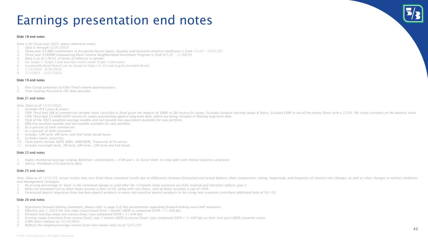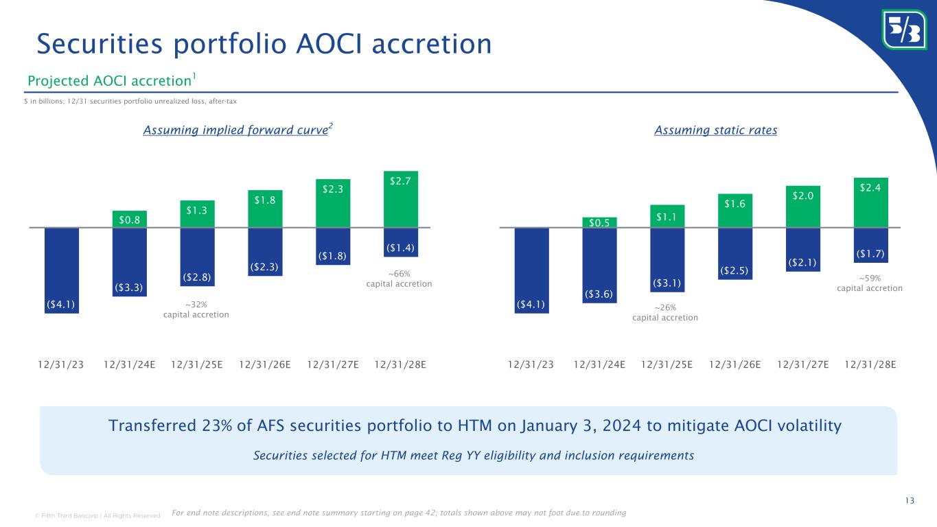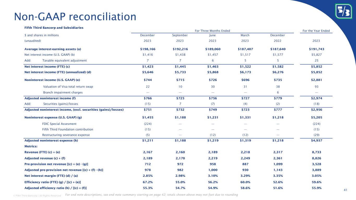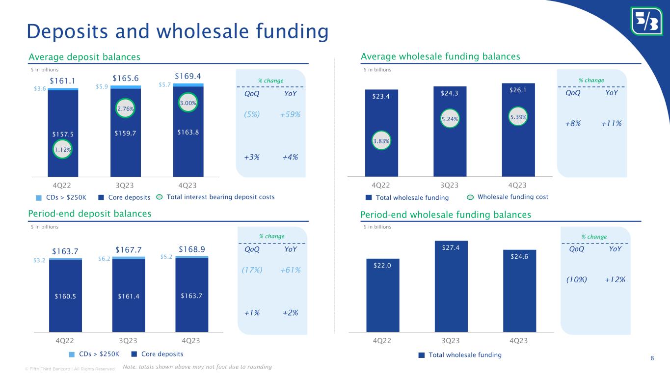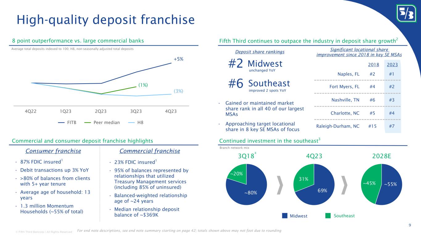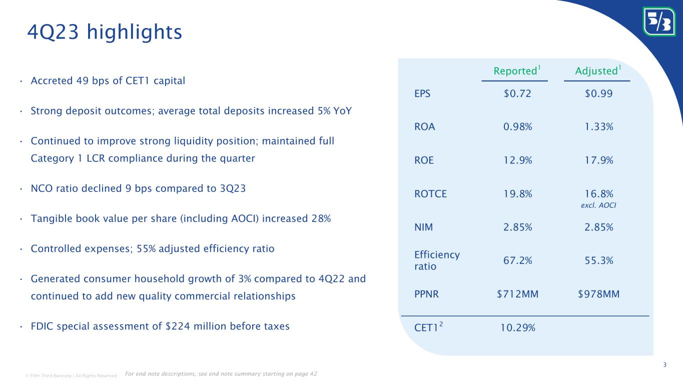 Stability: -平均預金残高は 23 年第 3 四半期比 2%増、22 年第 4 四半期比では 5%増となった。 -当四半期中、カテゴリー1 LCRへの完全準拠を維持し、預貸率は72%を達成した。 -有価証券ポートフォリオの23%を2024年1月3日にHTMに移管 -CET1資本は、力強い収益力とバランスシートの最適化努力を反映し、前四半期比49bps増の10.29%となった。 -NCOレシオは23年第3四半期比9bps低下 Profitability: Compared to 3Q23 -AOCI(a) 調整後の ROTCE は 16.8%であった。AOCI(a)は16.8%で90ベーシス・ポイント増加した。 -調整後効率性比率(a) 55.3 -1株当たり有形純資産(AOCIを含む)は28%増加した。 Growth: -消費者世帯の成長率は22年第4四半期比で3%増 -当四半期中に 19 支店を開設、うち 18 支店は高成長の南東部市場にある。 |