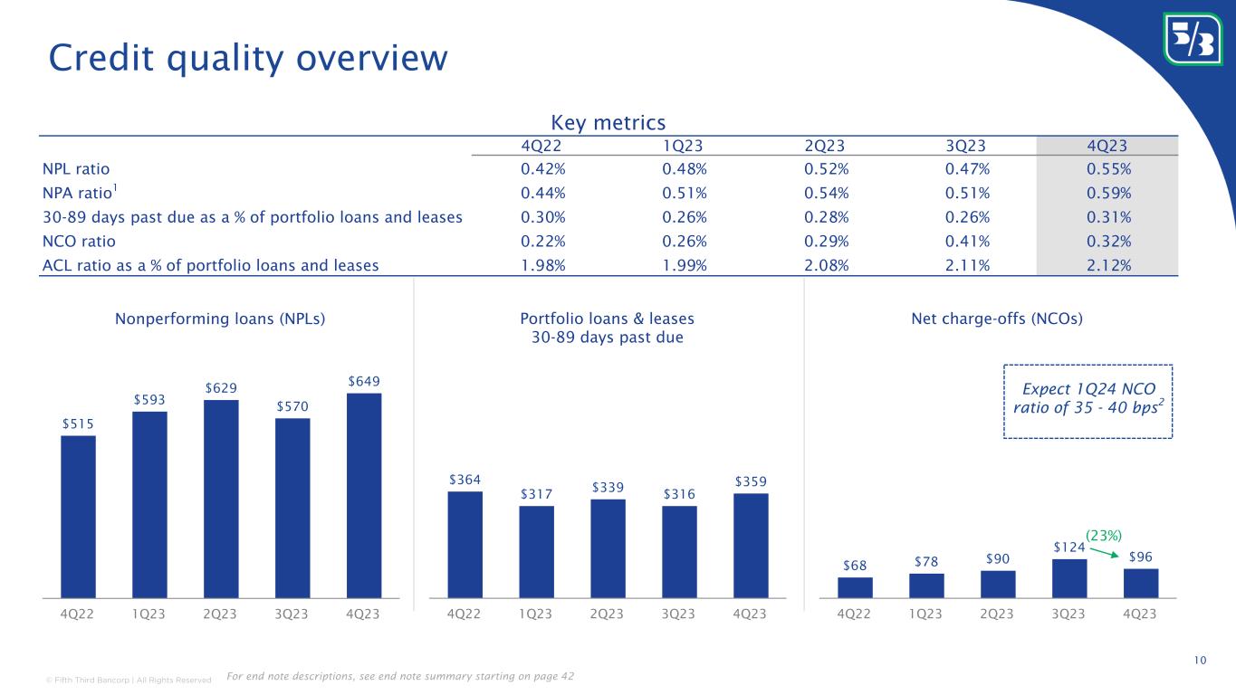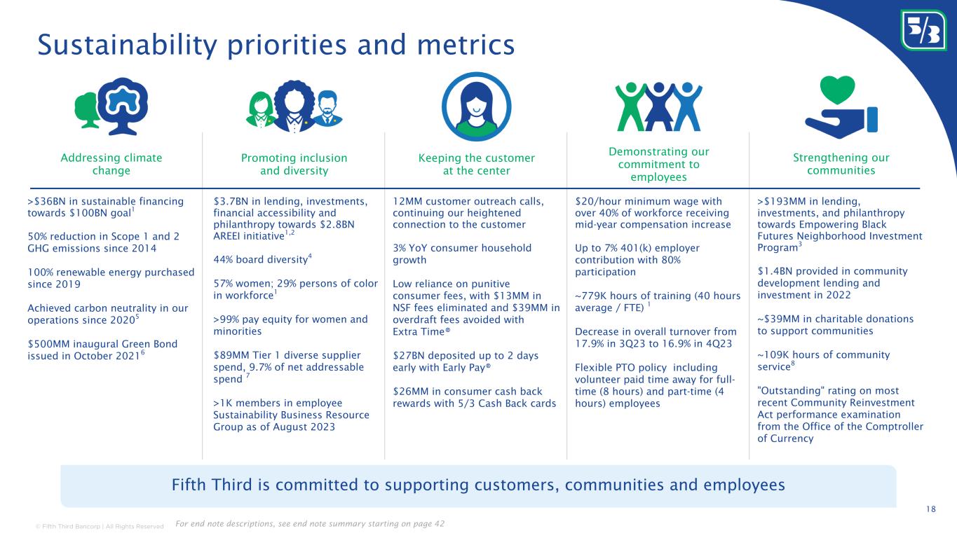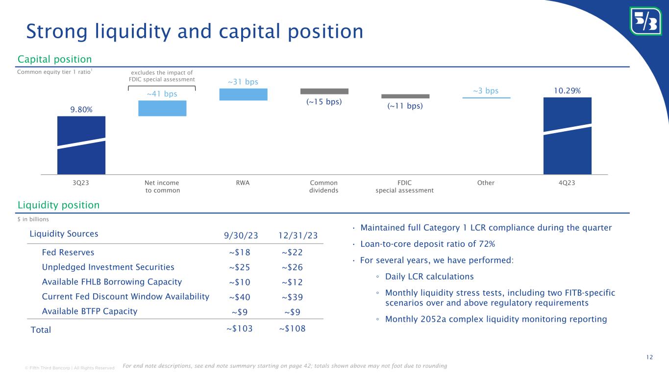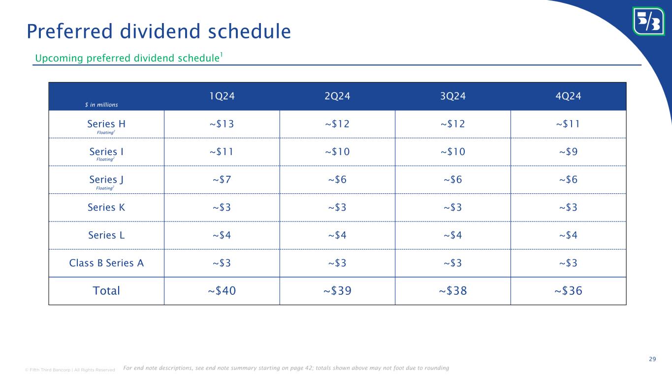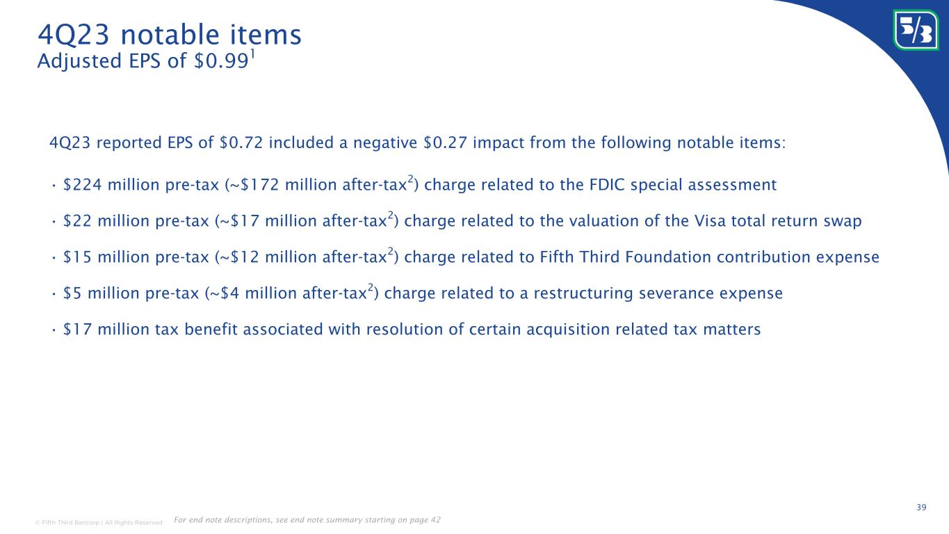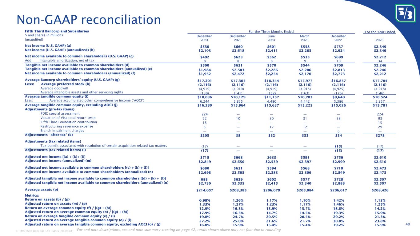 Stability: -平均預金残高は 23 年第 3 四半期比 2%増、22 年第 4 四半期比では 5%増となった。 -当四半期中、カテゴリー1 LCRへの完全準拠を維持し、預貸率は72%を達成した。 -有価証券ポートフォリオの23%を2024年1月3日にHTMに移管 -CET1資本は、力強い収益力とバランスシートの最適化努力を反映し、前四半期比49bps増の10.29%となった。 -NCOレシオは23年第3四半期比9bps低下 Profitability: Compared to 3Q23 -AOCI(a) 調整後の ROTCE は 16.8%であった。AOCI(a)は16.8%で90ベーシス・ポイント増加した。 -調整後効率性比率(a) 55.3 -1株当たり有形純資産(AOCIを含む)は28%増加した。 Growth: -消費者世帯の成長率は22年第4四半期比で3%増 -当四半期中に 19 支店を開設、うち 18 支店は高成長の南東部市場にある。 |
