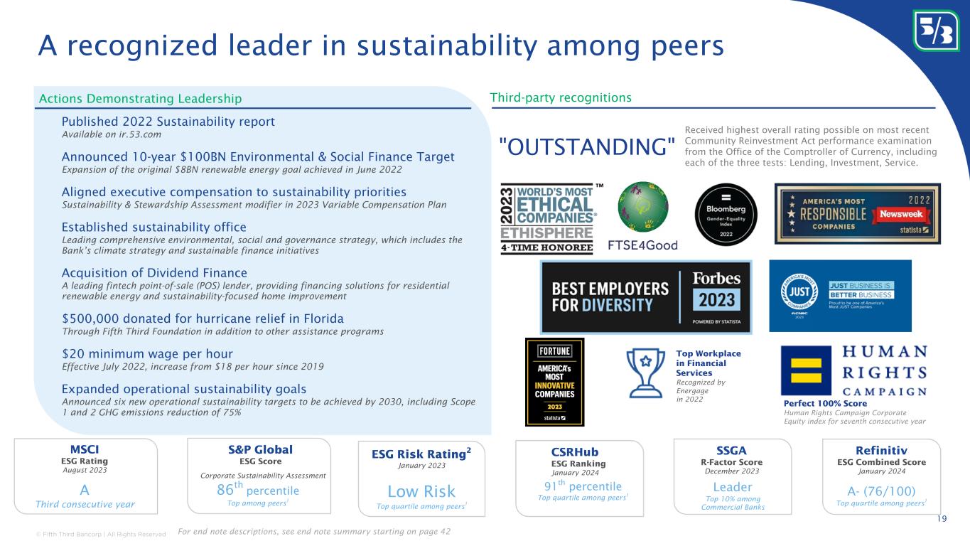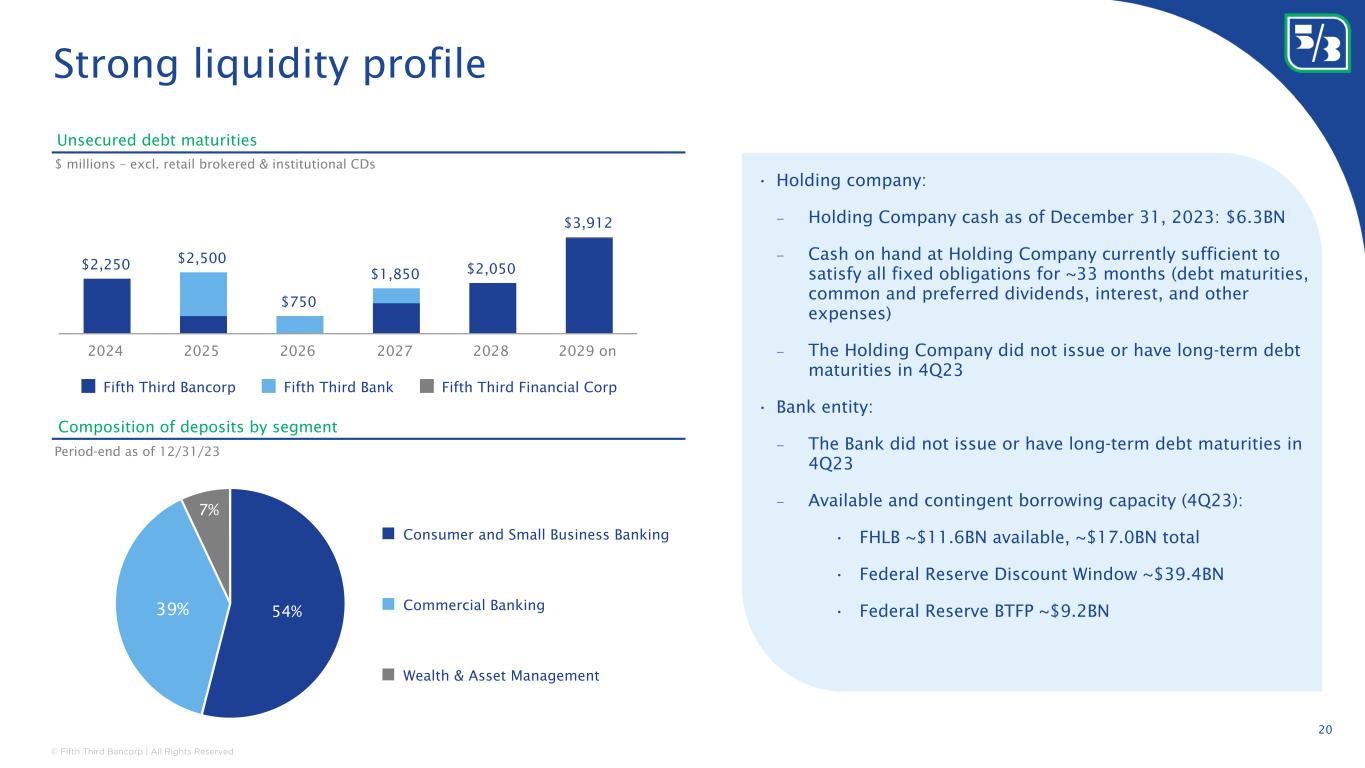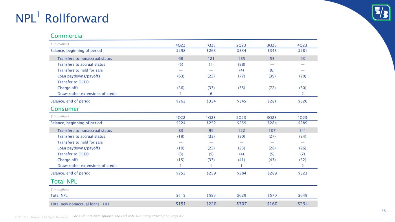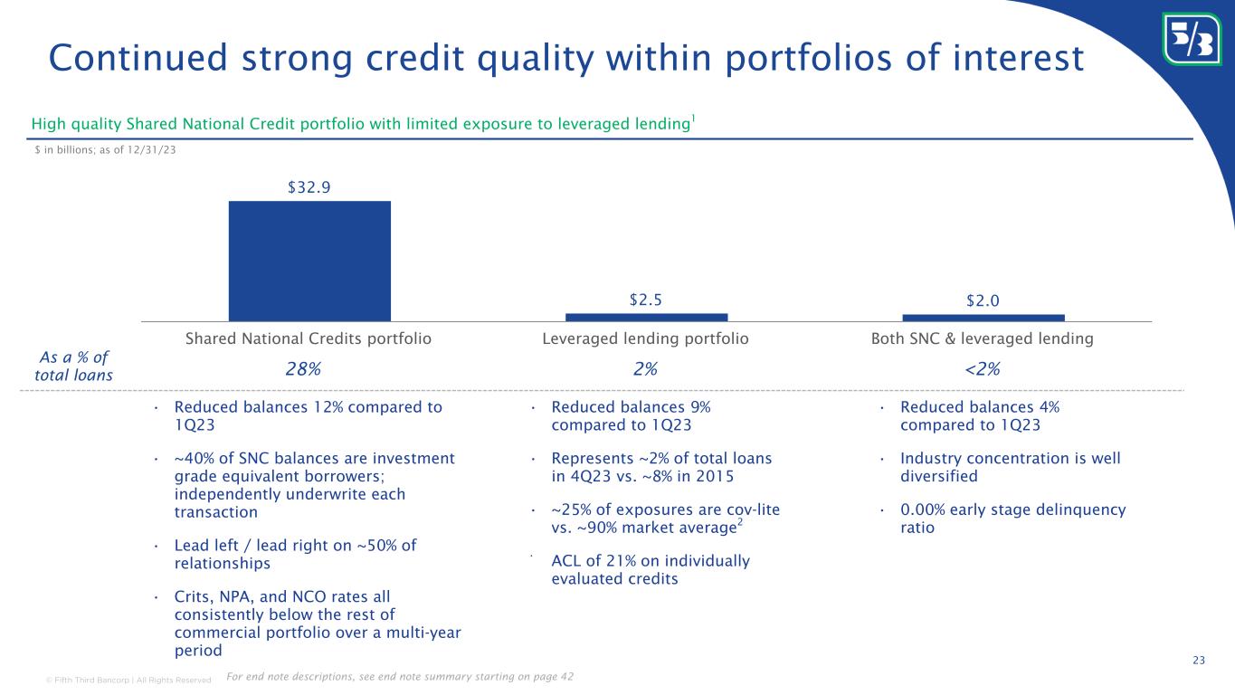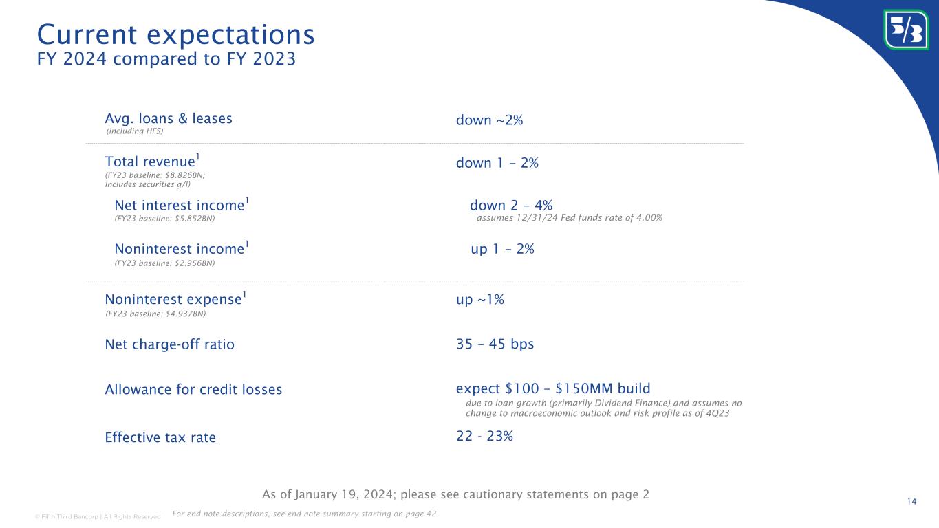 Stability: -平均預金残高は 23 年第 3 四半期比 2%増、22 年第 4 四半期比では 5%増となった。 -当四半期中、カテゴリー1 LCRへの完全準拠を維持し、預貸率は72%を達成した。 -有価証券ポートフォリオの23%を2024年1月3日にHTMに移管 -CET1資本は、力強い収益力とバランスシートの最適化努力を反映し、前四半期比49bps増の10.29%となった。 -NCOレシオは23年第3四半期比9bps低下 Profitability: Compared to 3Q23 -AOCI(a) 調整後の ROTCE は 16.8%であった。AOCI(a)は16.8%で90ベーシス・ポイント増加した。 -調整後効率性比率(a) 55.3 -1株当たり有形純資産(AOCIを含む)は28%増加した。 Growth: -消費者世帯の成長率は22年第4四半期比で3%増 -当四半期中に 19 支店を開設、うち 18 支店は高成長の南東部市場にある。 |