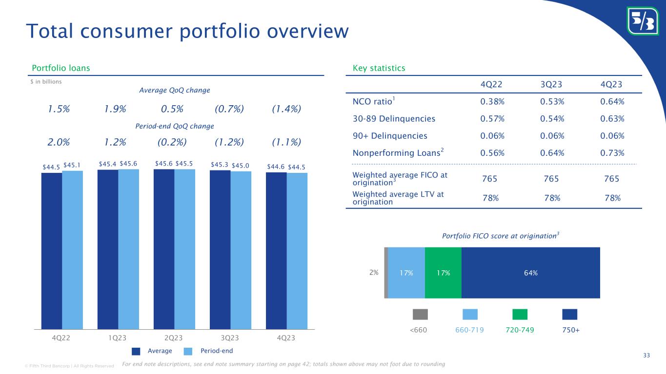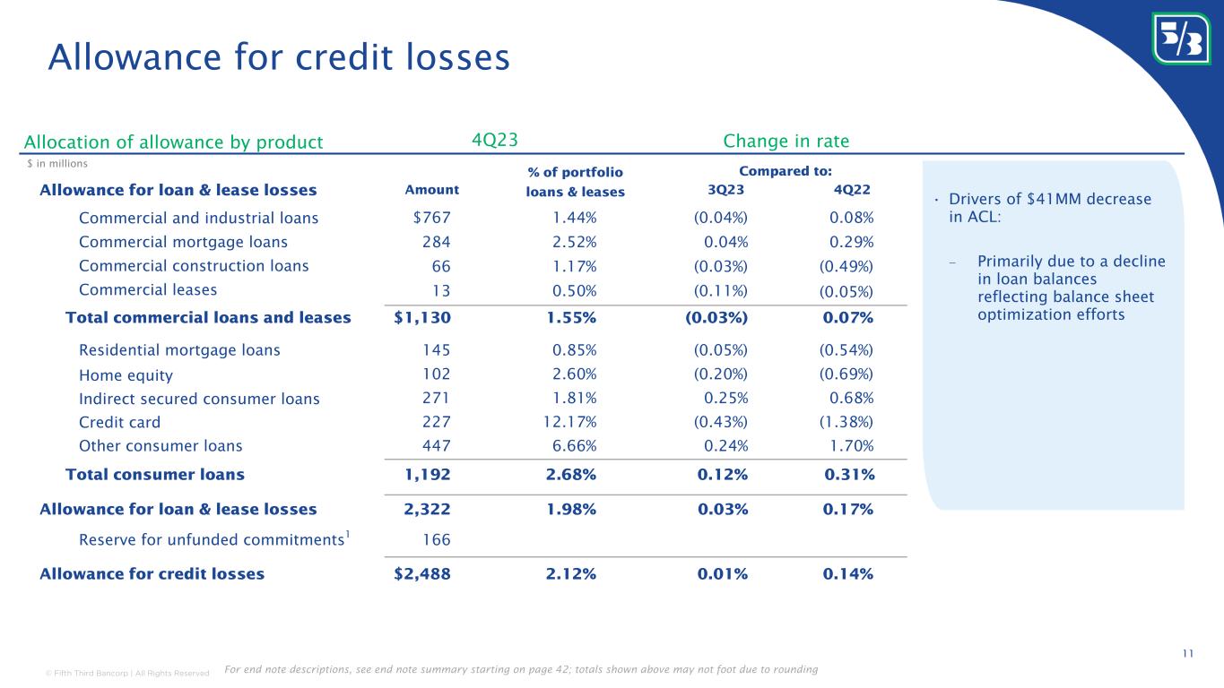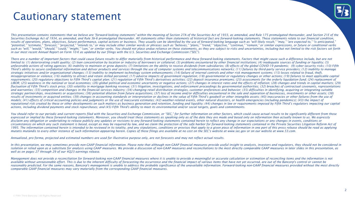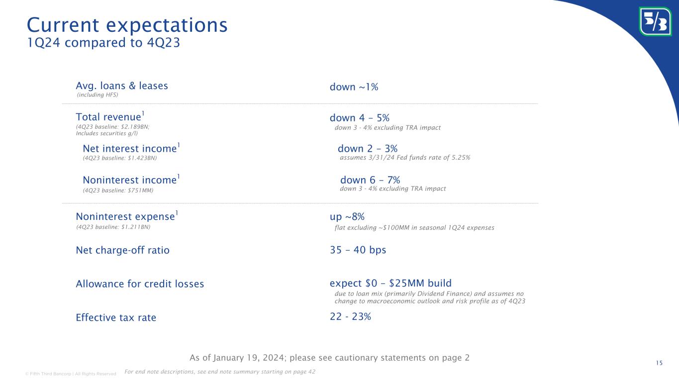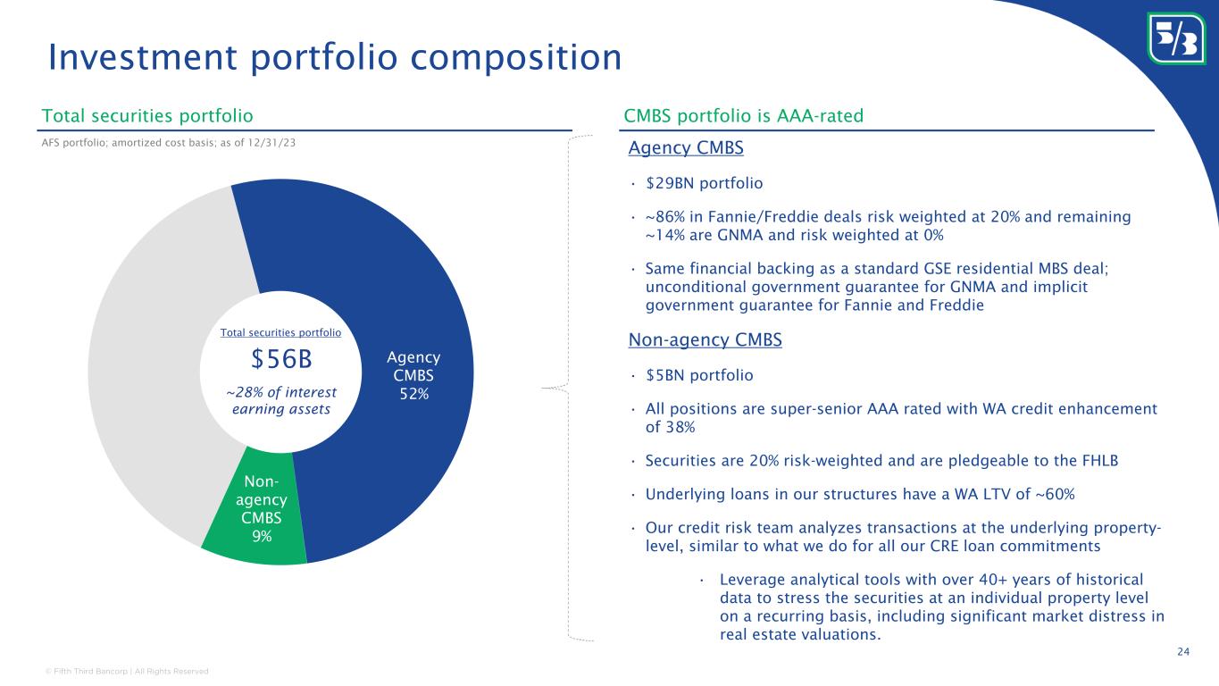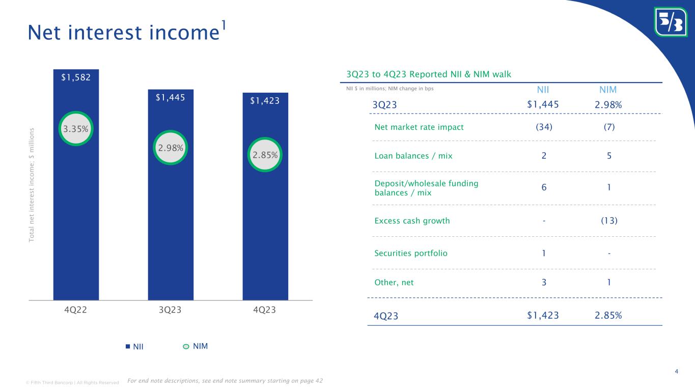 Stability: -平均預金残高は 23 年第 3 四半期比 2%増、22 年第 4 四半期比では 5%増となった。 -当四半期中、カテゴリー1 LCRへの完全準拠を維持し、預貸率は72%を達成した。 -有価証券ポートフォリオの23%を2024年1月3日にHTMに移管 -CET1資本は、力強い収益力とバランスシートの最適化努力を反映し、前四半期比49bps増の10.29%となった。 -NCOレシオは23年第3四半期比9bps低下 Profitability: Compared to 3Q23 -AOCI(a) 調整後の ROTCE は 16.8%であった。AOCI(a)は16.8%で90ベーシス・ポイント増加した。 -調整後効率性比率(a) 55.3 -1株当たり有形純資産(AOCIを含む)は28%増加した。 Growth: -消費者世帯の成長率は22年第4四半期比で3%増 -当四半期中に 19 支店を開設、うち 18 支店は高成長の南東部市場にある。 |