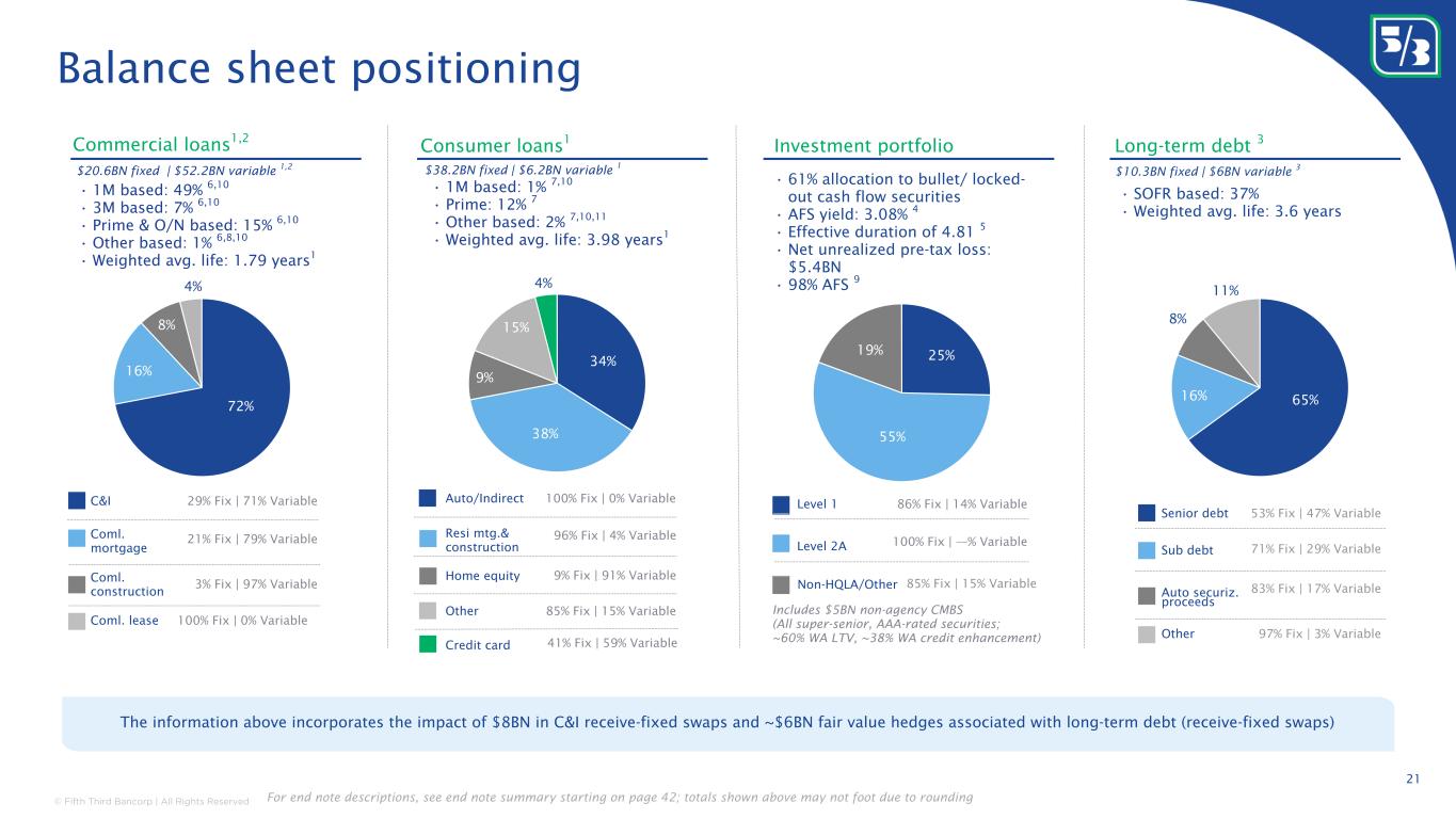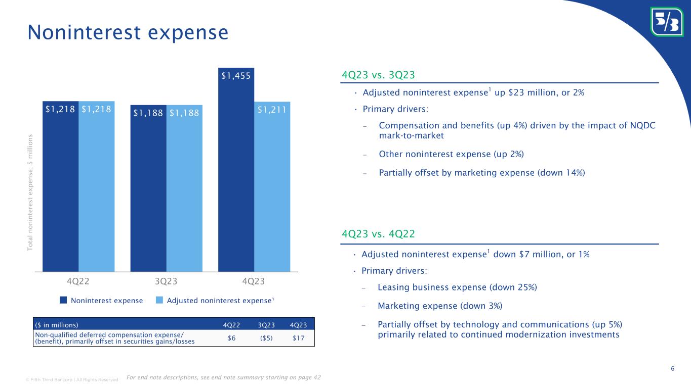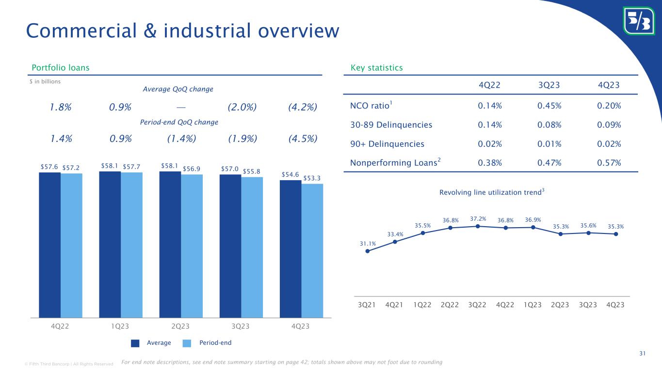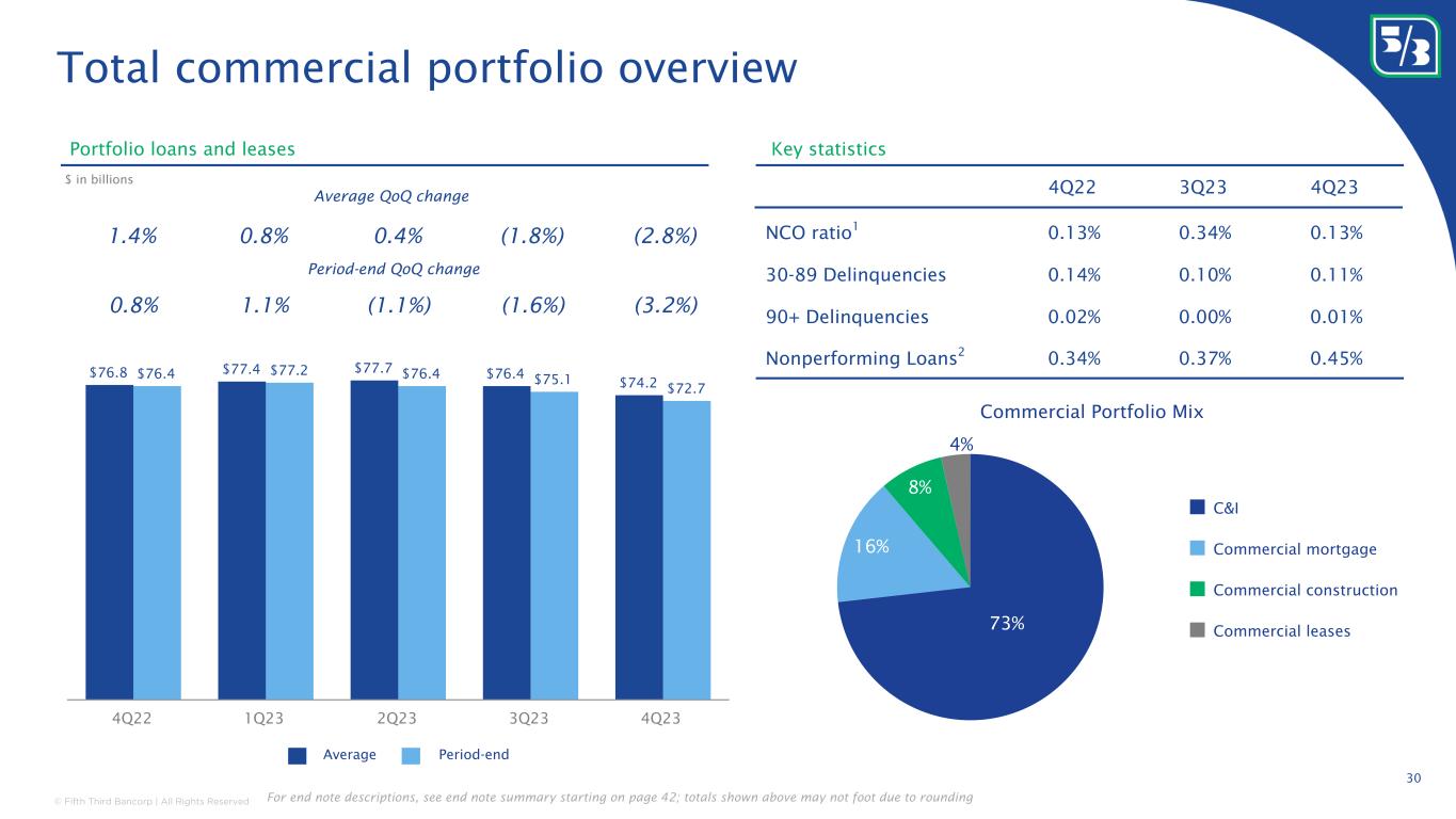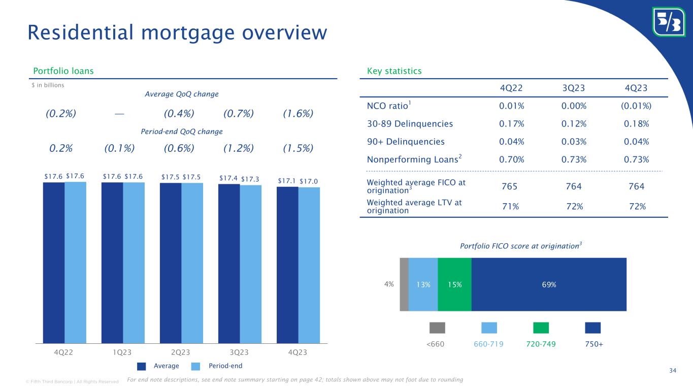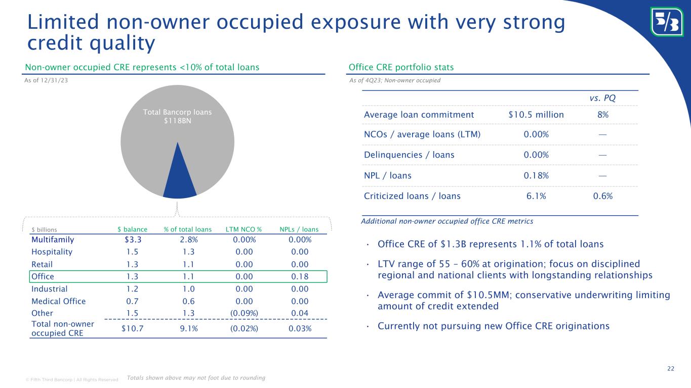 Stability: -平均預金残高は 23 年第 3 四半期比 2%増、22 年第 4 四半期比では 5%増となった。 -当四半期中、カテゴリー1 LCRへの完全準拠を維持し、預貸率は72%を達成した。 -有価証券ポートフォリオの23%を2024年1月3日にHTMに移管 -CET1資本は、力強い収益力とバランスシートの最適化努力を反映し、前四半期比49bps増の10.29%となった。 -NCOレシオは23年第3四半期比9bps低下 Profitability: Compared to 3Q23 -AOCI(a) 調整後の ROTCE は 16.8%であった。AOCI(a)は16.8%で90ベーシス・ポイント増加した。 -調整後効率性比率(a) 55.3 -1株当たり有形純資産(AOCIを含む)は28%増加した。 Growth: -消費者世帯の成長率は22年第4四半期比で3%増 -当四半期中に 19 支店を開設、うち 18 支店は高成長の南東部市場にある。 |
