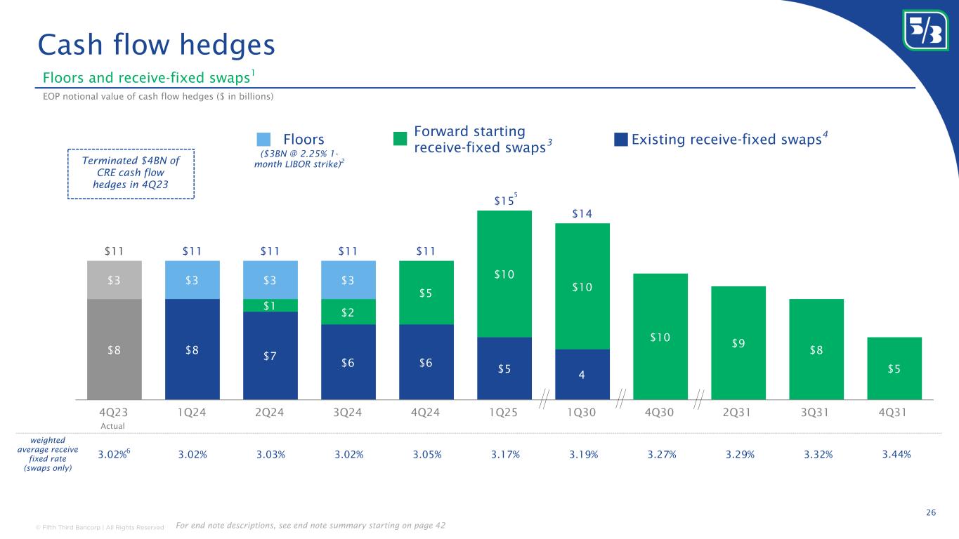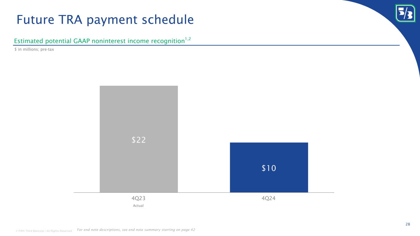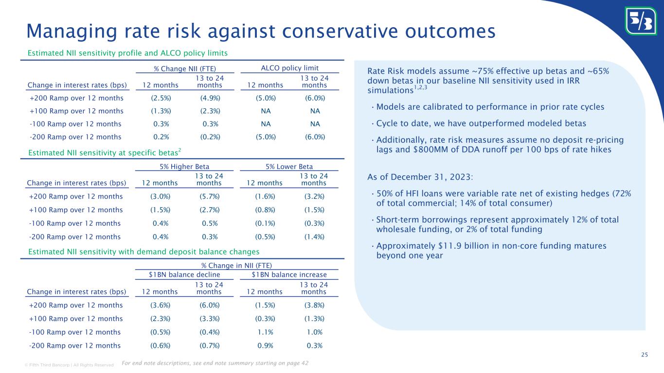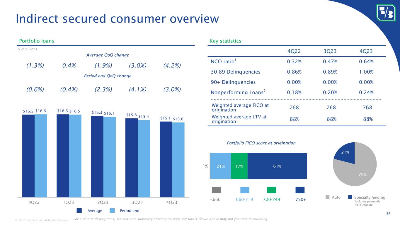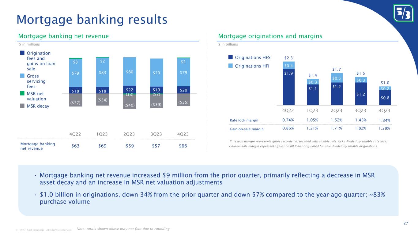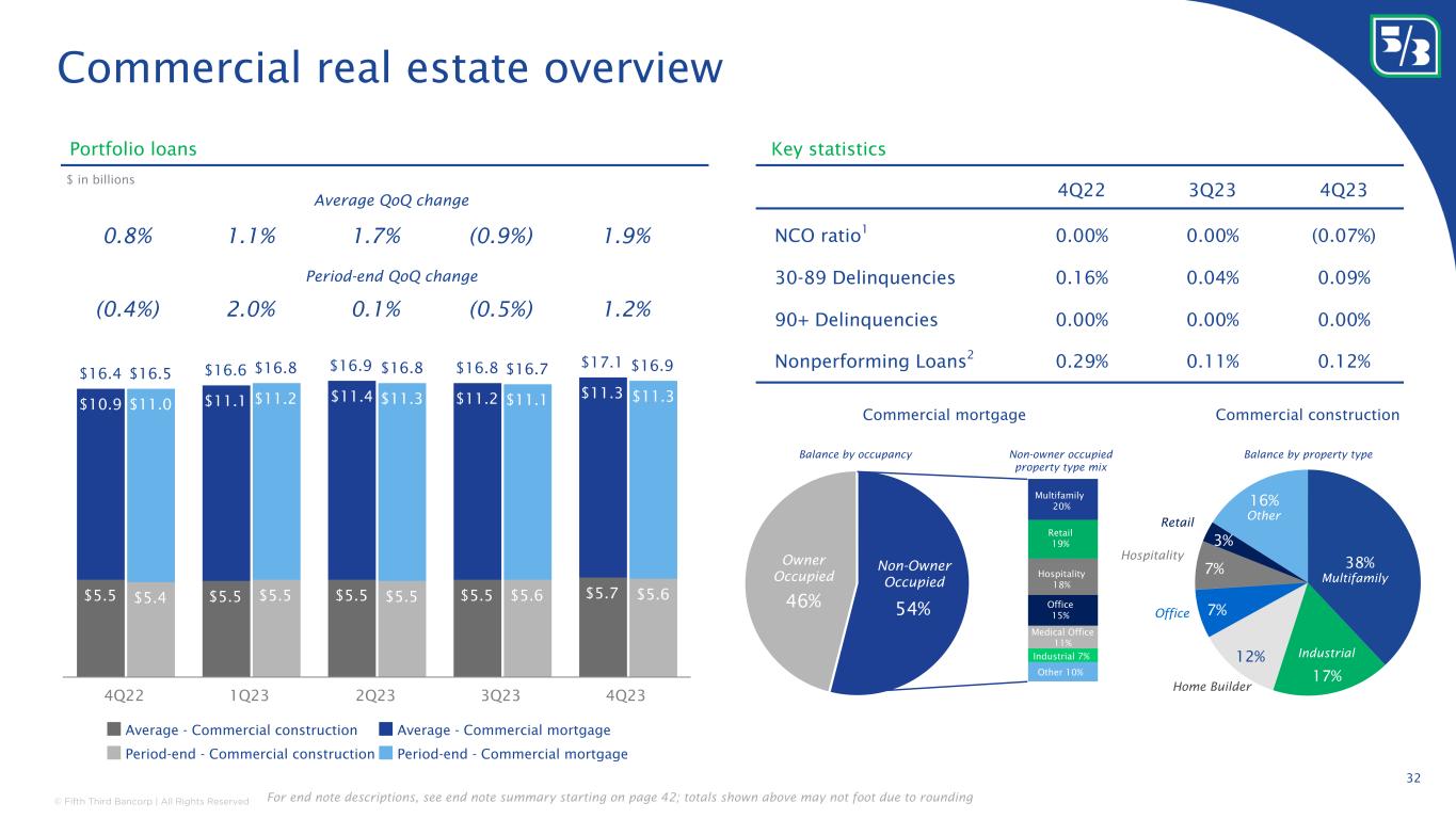 Stability: -平均預金残高は 23 年第 3 四半期比 2%増、22 年第 4 四半期比では 5%増となった。 -当四半期中、カテゴリー1 LCRへの完全準拠を維持し、預貸率は72%を達成した。 -有価証券ポートフォリオの23%を2024年1月3日にHTMに移管 -CET1資本は、力強い収益力とバランスシートの最適化努力を反映し、前四半期比49bps増の10.29%となった。 -NCOレシオは23年第3四半期比9bps低下 Profitability: Compared to 3Q23 -AOCI(a) 調整後の ROTCE は 16.8%であった。AOCI(a)は16.8%で90ベーシス・ポイント増加した。 -調整後効率性比率(a) 55.3 -1株当たり有形純資産(AOCIを含む)は28%増加した。 Growth: -消費者世帯の成長率は22年第4四半期比で3%増 -当四半期中に 19 支店を開設、うち 18 支店は高成長の南東部市場にある。 |