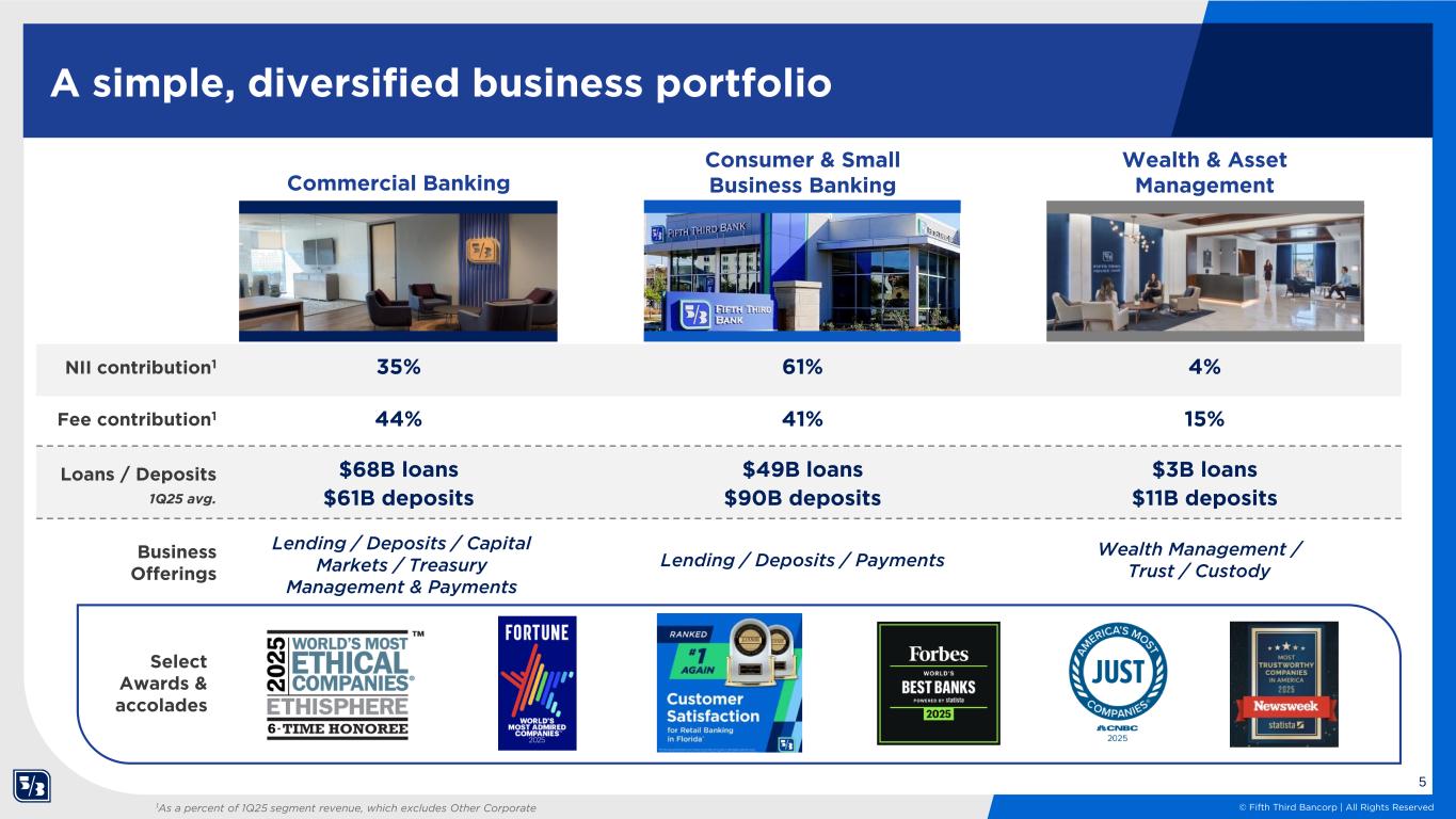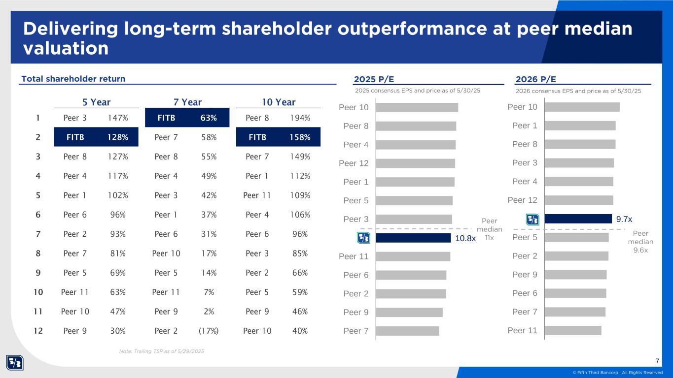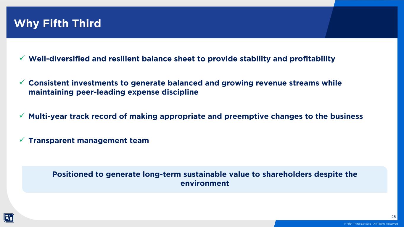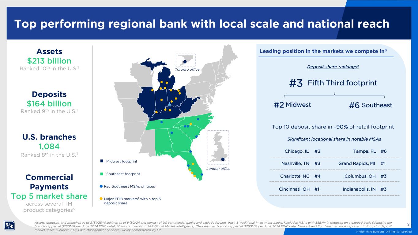 2 © Fifth Third Bancorp | All Rights Reserved Cautionary Statement This presentation contains statements that we believe are “forward-looking statements” within the meaning of Section 27A of the Securities Act of 1933, as amended, and Rule 175 promulgated thereunder, and Section 21E of the Securities Exchange Act of 1934, as amended, and Rule 3b-6 promulgated thereunder. All statements other than statements of historical fact are forward-looking statements. These statements relate to our financial condition, results of operations, plans, objectives, future performance, capital actions or business. They usually can be identified by the use of forward-looking language such as “will likely result,” “may,” “are expected to,” “is anticipated,” “potential,” “estimate,” “forecast,” “projected,” “intends to,” or may include other similar words or phrases such as “believes,” “plans,” “trend,” “objective,” “continue,” “remain,” or similar expressions, or future or conditional verbs such as “will,” “would,” “should,” “could,” “might,” “can,” or similar verbs. You should not place undue reliance on these statements, as they are subject to risks and uncertainties, including but not limited to the risk factors set forth in our most recent Annual Report on Form 10-K as updated by our filings with the U.S. Securities and Exchange Commission (“SEC”). There are a number of important factors that could cause future results to differ materially from historical performance and these forward-looking statements. Factors that might cause such a difference include, but are not limited to: (1) deteriorating credit quality; (2) loan concentration by location or industry of borrowers or collateral; (3) problems encountered by other financial institutions; (4) inadequate sources of funding or liquidity; (5) unfavorable actions of rating agencies; (6) inability to maintain or grow deposits; (7) limitations on the ability to receive dividends from subsidiaries; (8) cyber-security risks; (9) Fifth Third’s ability to secure confidential information and deliver products and services through the use of computer systems and telecommunications networks; (10) failures by third-party service providers; (11) inability to manage strategic initiatives and/or organizational changes; (12) inability to implement technology system enhancements, including the use of artificial intelligence; (13) failure of internal controls and other risk management programs; (14) losses related to fraud, theft, misappropriation or violence; (15) inability to attract and retain skilled personnel; (16) adverse impacts of government regulation; (17) governmental or regulatory changes or other actions; (18) failures to meet applicable capital requirements; (19) regulatory objections to Fifth Third’s capital plan; (20) regulation of Fifth Third’s derivatives activities; (21) deposit insurance premiums; (22) assessments for the orderly liquidation fund; (23) weakness in the national or local economies; (24) global political and economic uncertainty or negative actions; (25) changes in interest rates and the effects of inflation; (26) changes in U.S. trade policies, including the imposition of tariffs and retaliatory tariffs; (27) changes and trends in capital markets; (28) fluctuation of Fifth Third’s stock price; (29) volatility in mortgage banking revenue; (30) litigation, investigations, and enforcement proceedings; (31) breaches of contractual covenants, representations and warranties; (32) competition and changes in the financial services industry; (33) potential impacts of the adoption of real-time payment networks; (34) changing retail distribution strategies, customer preferences and behavior; (35) difficulties in identifying, acquiring or integrating suitable strategic partnerships, investments or acquisitions; (36) potential dilution from future acquisitions; (37) loss of income and/or difficulties encountered in the sale and separation of businesses, investments or other assets; (38) results of investments or acquired entities; (39) changes in accounting standards or interpretation or declines in the value of Fifth Third’s goodwill or other intangible assets; (40) inaccuracies or other failures from the use of models; (41) effects of critical accounting policies and judgments or the use of inaccurate estimates; (42) weather-related events, other natural disasters, or health emergencies (including pandemics); (43) the impact of reputational risk created by these or other developments on such matters as business generation and retention, funding and liquidity; (44) changes in law or requirements imposed by Fifth Third’s regulators impacting our capital actions, including dividend payments and stock repurchases; and (45) Fifth Third's ability to meet its environmental and/or social targets, goals and commitments. You should refer to our periodic and current reports filed with the Securities and Exchange Commission, or “SEC,” for further information on other factors, which could cause actual results to be significantly different from those expressed or implied by these forward-looking statements. Moreover, you should treat these statements as speaking only as of the date they are made and based only on information then actually known to us. We expressly disclaim any obligation or undertaking to release publicly any updates or revisions to any forward-looking statements contained herein to reflect any change in our expectations or any changes in events, conditions or circumstances on which any such statement is based, except as may be required by law, and we claim the protection of the safe harbor for forward-looking statements contained in the Private Securities Litigation Reform Act of 1995. The information contained herein is intended to be reviewed in its totality, and any stipulations, conditions or provisos that apply to a given piece o