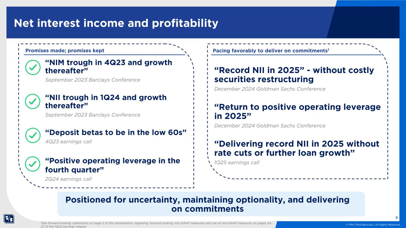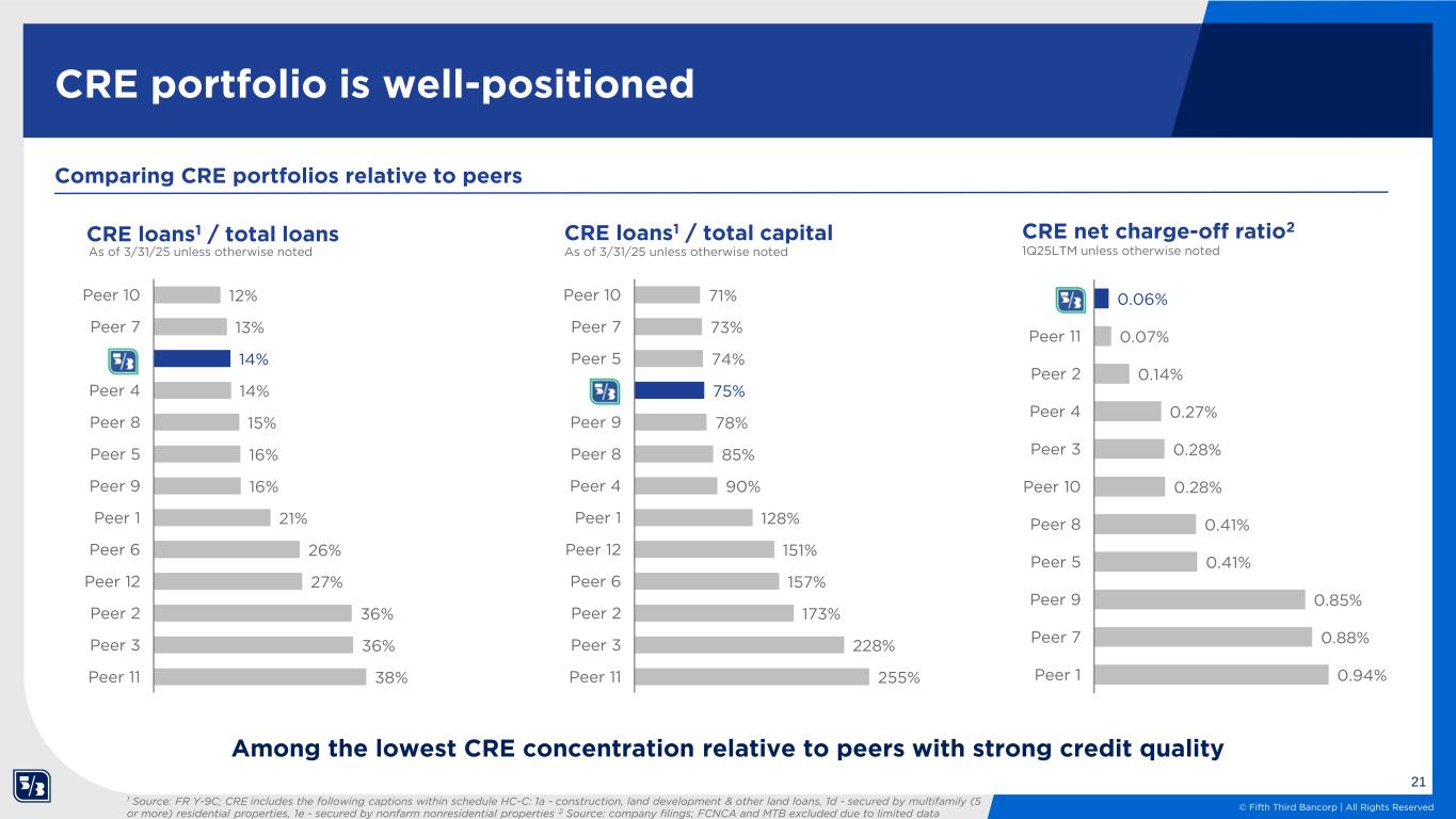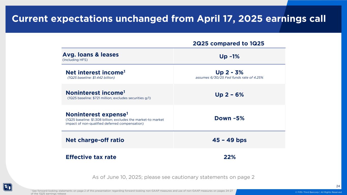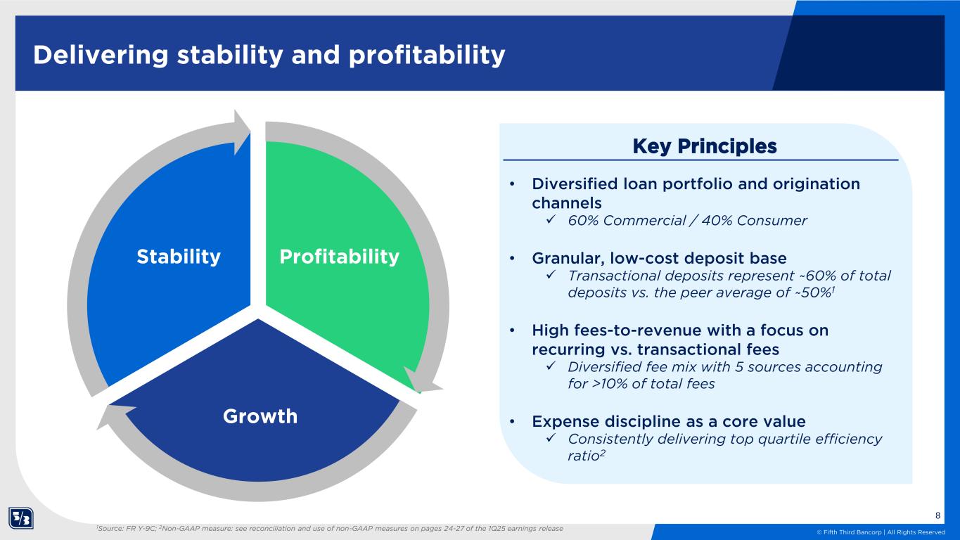 2 © Fifth Third Bancorp | All Rights Reserved Cautionary Statement This presentation contains statements that we believe are “forward-looking statements” within the meaning of Section 27A of the Securities Act of 1933, as amended, and Rule 175 promulgated thereunder, and Section 21E of the Securities Exchange Act of 1934, as amended, and Rule 3b-6 promulgated thereunder. All statements other than statements of historical fact are forward-looking statements. These statements relate to our financial condition, results of operations, plans, objectives, future performance, capital actions or business. They usually can be identified by the use of forward-looking language such as “will likely result,” “may,” “are expected to,” “is anticipated,” “potential,” “estimate,” “forecast,” “projected,” “intends to,” or may include other similar words or phrases such as “believes,” “plans,” “trend,” “objective,” “continue,” “remain,” or similar expressions, or future or conditional verbs such as “will,” “would,” “should,” “could,” “might,” “can,” or similar verbs. You should not place undue reliance on these statements, as they are subject to risks and uncertainties, including but not limited to the risk factors set forth in our most recent Annual Report on Form 10-K as updated by our filings with the U.S. Securities and Exchange Commission (“SEC”). There are a number of important factors that could cause future results to differ materially from historical performance and these forward-looking statements. Factors that might cause such a difference include, but are not limited to: (1) deteriorating credit quality; (2) loan concentration by location or industry of borrowers or collateral; (3) problems encountered by other financial institutions; (4) inadequate sources of funding or liquidity; (5) unfavorable actions of rating agencies; (6) inability to maintain or grow deposits; (7) limitations on the ability to receive dividends from subsidiaries; (8) cyber-security risks; (9) Fifth Third’s ability to secure confidential information and deliver products and services through the use of computer systems and telecommunications networks; (10) failures by third-party service providers; (11) inability to manage strategic initiatives and/or organizational changes; (12) inability to implement technology system enhancements, including the use of artificial intelligence; (13) failure of internal controls and other risk management programs; (14) losses related to fraud, theft, misappropriation or violence; (15) inability to attract and retain skilled personnel; (16) adverse impacts of government regulation; (17) governmental or regulatory changes or other actions; (18) failures to meet applicable capital requirements; (19) regulatory objections to Fifth Third’s capital plan; (20) regulation of Fifth Third’s derivatives activities; (21) deposit insurance premiums; (22) assessments for the orderly liquidation fund; (23) weakness in the national or local economies; (24) global political and economic uncertainty or negative actions; (25) changes in interest rates and the effects of inflation; (26) changes in U.S. trade policies, including the imposition of tariffs and retaliatory tariffs; (27) changes and trends in capital markets; (28) fluctuation of Fifth Third’s stock price; (29) volatility in mortgage banking revenue; (30) litigation, investigations, and enforcement proceedings; (31) breaches of contractual covenants, representations and warranties; (32) competition and changes in the financial services industry; (33) potential impacts of the adoption of real-time payment networks; (34) changing retail distribution strategies, customer preferences and behavior; (35) difficulties in identifying, acquiring or integrating suitable strategic partnerships, investments or acquisitions; (36) potential dilution from future acquisitions; (37) loss of income and/or difficulties encountered in the sale and separation of businesses, investments or other assets; (38) results of investments or acquired entities; (39) changes in accounting standards or interpretation or declines in the value of Fifth Third’s goodwill or other intangible assets; (40) inaccuracies or other failures from the use of models; (41) effects of critical accounting policies and judgments or the use of inaccurate estimates; (42) weather-related events, other natural disasters, or health emergencies (including pandemics); (43) the impact of reputational risk created by these or other developments on such matters as business generation and retention, funding and liquidity; (44) changes in law or requirements imposed by Fifth Third’s regulators impacting our capital actions, including dividend payments and stock repurchases; and (45) Fifth Third's ability to meet its environmental and/or social targets, goals and commitments. You should refer to our periodic and current reports filed with the Securities and Exchange Commission, or “SEC,” for further information on other factors, which could cause actual results to be significantly different from those expressed or implied by these forward-looking statements. Moreover, you should treat these statements as speaking only as of the date they are made and based only on information then actually known to us. We expressly disclaim any obligation or undertaking to release publicly any updates or revisions to any forward-looking statements contained herein to reflect any change in our expectations or any changes in events, conditions or circumstances on which any such statement is based, except as may be required by law, and we claim the protection of the safe harbor for forward-looking statements contained in the Private Securities Litigation Reform Act of 1995. The information contained herein is intended to be reviewed in its totality, and any stipulations, conditions or provisos that apply to a given piece o