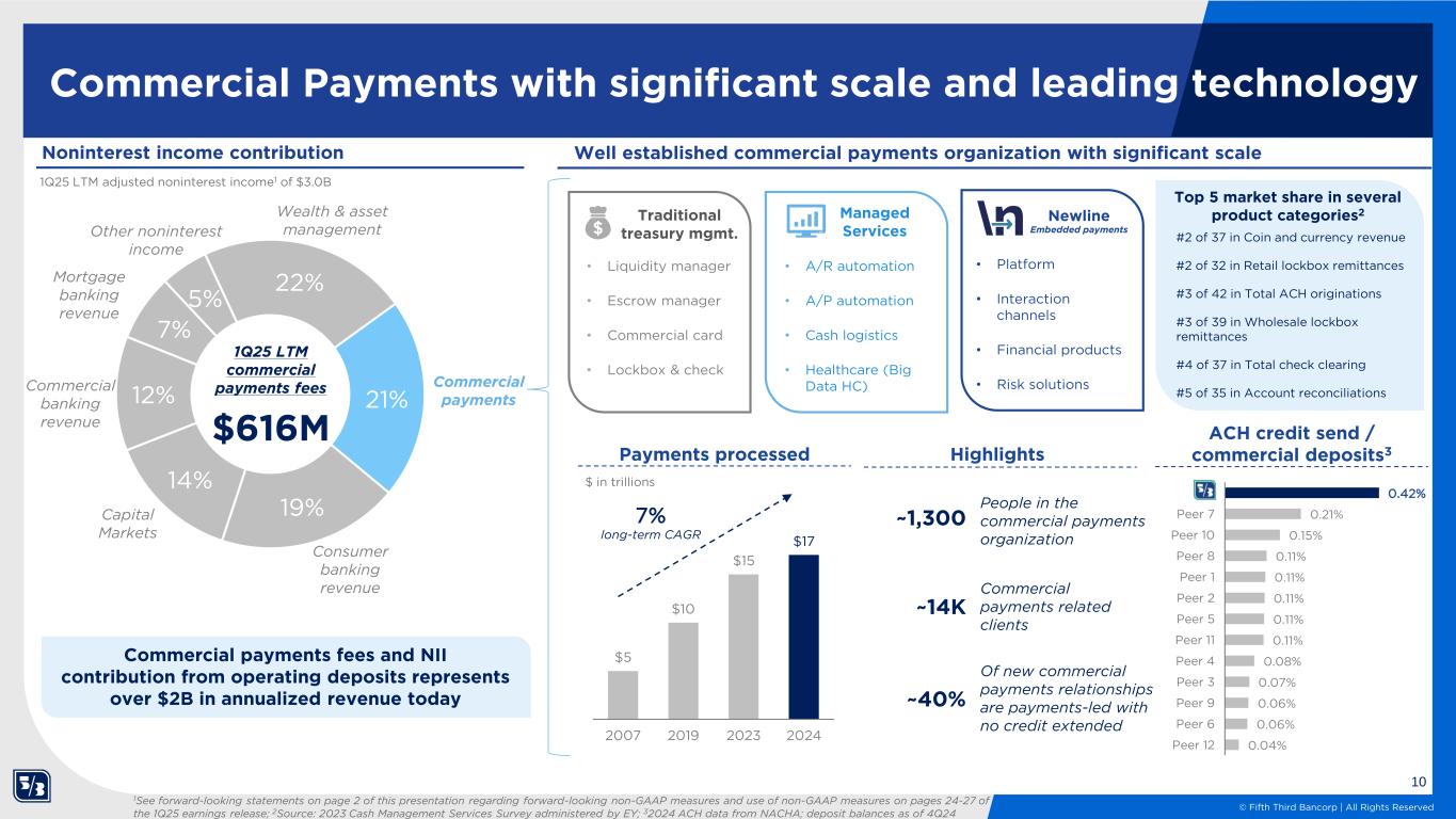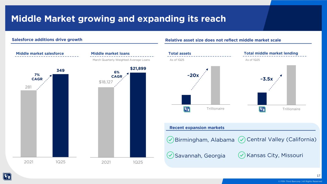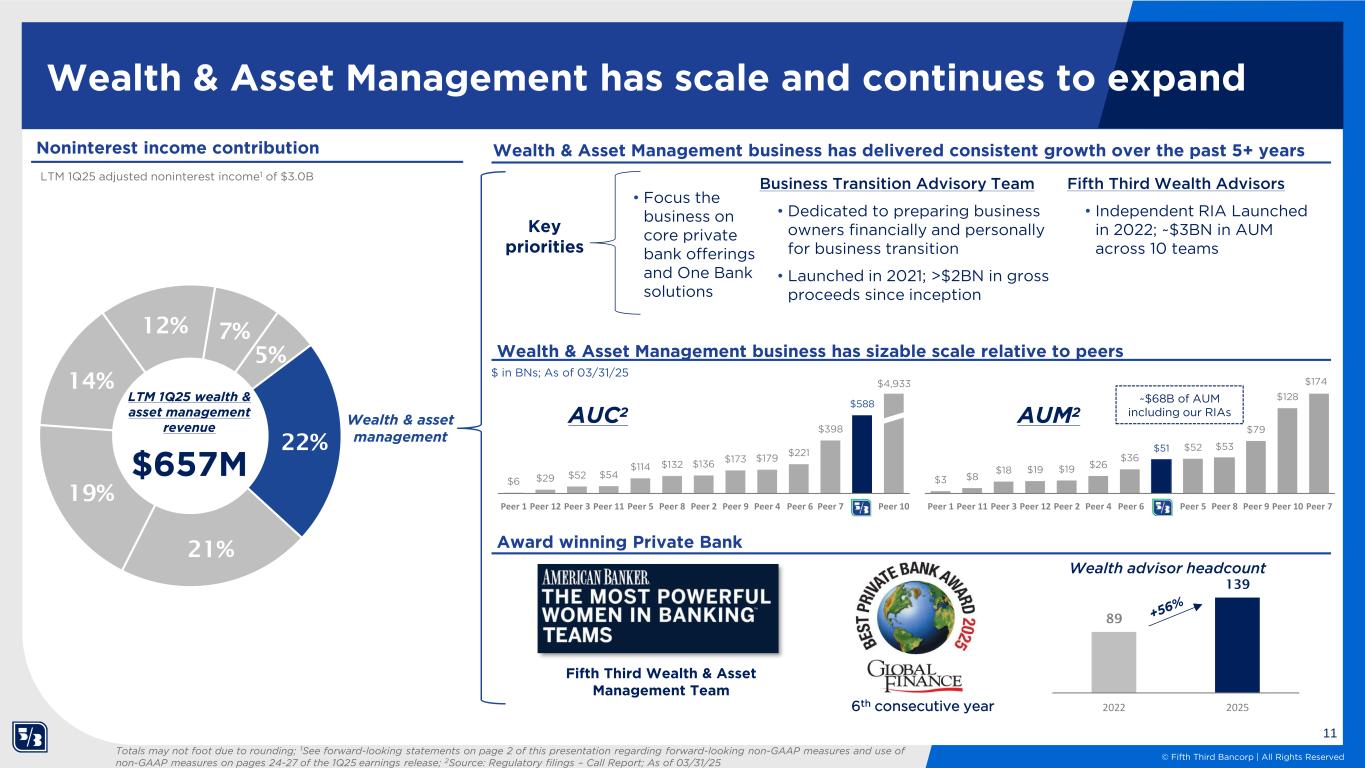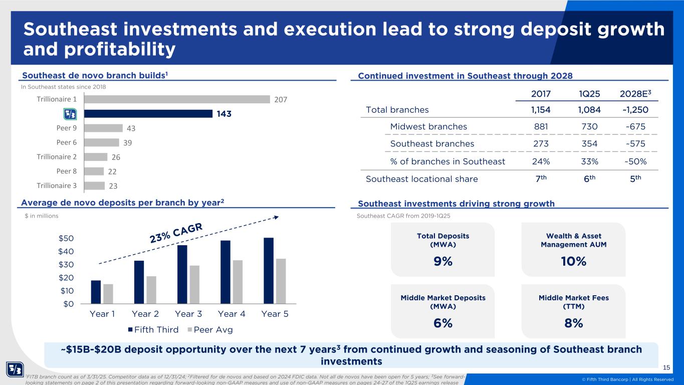 2 © Fifth Third Bancorp | All Rights Reserved Cautionary Statement This presentation contains statements that we believe are “forward-looking statements” within the meaning of Section 27A of the Securities Act of 1933, as amended, and Rule 175 promulgated thereunder, and Section 21E of the Securities Exchange Act of 1934, as amended, and Rule 3b-6 promulgated thereunder. All statements other than statements of historical fact are forward-looking statements. These statements relate to our financial condition, results of operations, plans, objectives, future performance, capital actions or business. They usually can be identified by the use of forward-looking language such as “will likely result,” “may,” “are expected to,” “is anticipated,” “potential,” “estimate,” “forecast,” “projected,” “intends to,” or may include other similar words or phrases such as “believes,” “plans,” “trend,” “objective,” “continue,” “remain,” or similar expressions, or future or conditional verbs such as “will,” “would,” “should,” “could,” “might,” “can,” or similar verbs. You should not place undue reliance on these statements, as they are subject to risks and uncertainties, including but not limited to the risk factors set forth in our most recent Annual Report on Form 10-K as updated by our filings with the U.S. Securities and Exchange Commission (“SEC”). There are a number of important factors that could cause future results to differ materially from historical performance and these forward-looking statements. Factors that might cause such a difference include, but are not limited to: (1) deteriorating credit quality; (2) loan concentration by location or industry of borrowers or collateral; (3) problems encountered by other financial institutions; (4) inadequate sources of funding or liquidity; (5) unfavorable actions of rating agencies; (6) inability to maintain or grow deposits; (7) limitations on the ability to receive dividends from subsidiaries; (8) cyber-security risks; (9) Fifth Third’s ability to secure confidential information and deliver products and services through the use of computer systems and telecommunications networks; (10) failures by third-party service providers; (11) inability to manage strategic initiatives and/or organizational changes; (12) inability to implement technology system enhancements, including the use of artificial intelligence; (13) failure of internal controls and other risk management programs; (14) losses related to fraud, theft, misappropriation or violence; (15) inability to attract and retain skilled personnel; (16) adverse impacts of government regulation; (17) governmental or regulatory changes or other actions; (18) failures to meet applicable capital requirements; (19) regulatory objections to Fifth Third’s capital plan; (20) regulation of Fifth Third’s derivatives activities; (21) deposit insurance premiums; (22) assessments for the orderly liquidation fund; (23) weakness in the national or local economies; (24) global political and economic uncertainty or negative actions; (25) changes in interest rates and the effects of inflation; (26) changes in U.S. trade policies, including the imposition of tariffs and retaliatory tariffs; (27) changes and trends in capital markets; (28) fluctuation of Fifth Third’s stock price; (29) volatility in mortgage banking revenue; (30) litigation, investigations, and enforcement proceedings; (31) breaches of contractual covenants, representations and warranties; (32) competition and changes in the financial services industry; (33) potential impacts of the adoption of real-time payment networks; (34) changing retail distribution strategies, customer preferences and behavior; (35) difficulties in identifying, acquiring or integrating suitable strategic partnerships, investments or acquisitions; (36) potential dilution from future acquisitions; (37) loss of income and/or difficulties encountered in the sale and separation of businesses, investments or other assets; (38) results of investments or acquired entities; (39) changes in accounting standards or interpretation or declines in the value of Fifth Third’s goodwill or other intangible assets; (40) inaccuracies or other failures from the use of models; (41) effects of critical accounting policies and judgments or the use of inaccurate estimates; (42) weather-related events, other natural disasters, or health emergencies (including pandemics); (43) the impact of reputational risk created by these or other developments on such matters as business generation and retention, funding and liquidity; (44) changes in law or requirements imposed by Fifth Third’s regulators impacting our capital actions, including dividend payments and stock repurchases; and (45) Fifth Third's ability to meet its environmental and/or social targets, goals and commitments. You should refer to our periodic and current reports filed with the Securities and Exchange Commission, or “SEC,” for further information on other factors, which could cause actual results to be significantly different from those expressed or implied by these forward-looking statements. Moreover, you should treat these statements as speaking only as of the date they are made and based only on information then actually known to us. We expressly disclaim any obligation or undertaking to release publicly any updates or revisions to any forward-looking statements contained herein to reflect any change in our expectations or any changes in events, conditions or circumstances on which any such statement is based, except as may be required by law, and we claim the protection of the safe harbor for forward-looking statements contained in the Private Securities Litigation Reform Act of 1995. The information contained herein is intended to be reviewed in its totality, and any stipulations, conditions or provisos that apply to a given piece o
