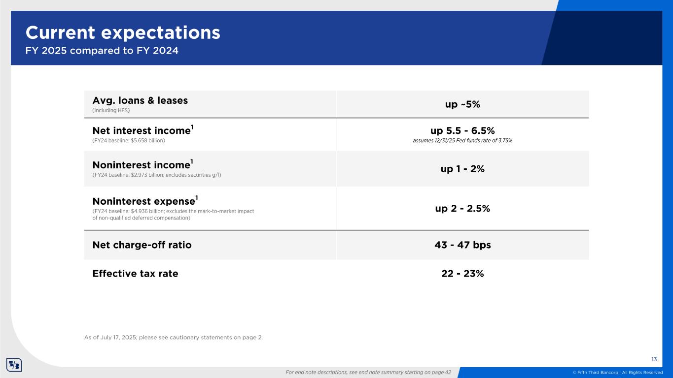 Stability: -正味貸倒引当金比率(b) は前四半期比で 1bp 低下、第 2 四半期比では 4bp 低下。 -有利子負債コストは25年第1四半期比2bps低下、DDAは前年同期比4%増 -好調な収益性により、CET1 は 13bps 増の 10.56%となった。 Profitability: -厳格な経費管理:効率性比率(a) は56.2%、調整後効率性比率(a) は55.5%と、前年同期比で130bps改善した。 -純金利マージンは6四半期連続で拡大 -調整後ROTCE(AOCI控除後)は13.9%。AOCI(a)は13.9%、調整後ROA(a)は1.22%。 Growth: -貸出金は 24 年第 2 四半期比で 5%増加、年間貸出金増加率は過去 2 年間で最高水準に達する -南東部での6%を含む2%の消費者世帯成長率 -運用資産は730億ドル、第2四半期比12%増 |