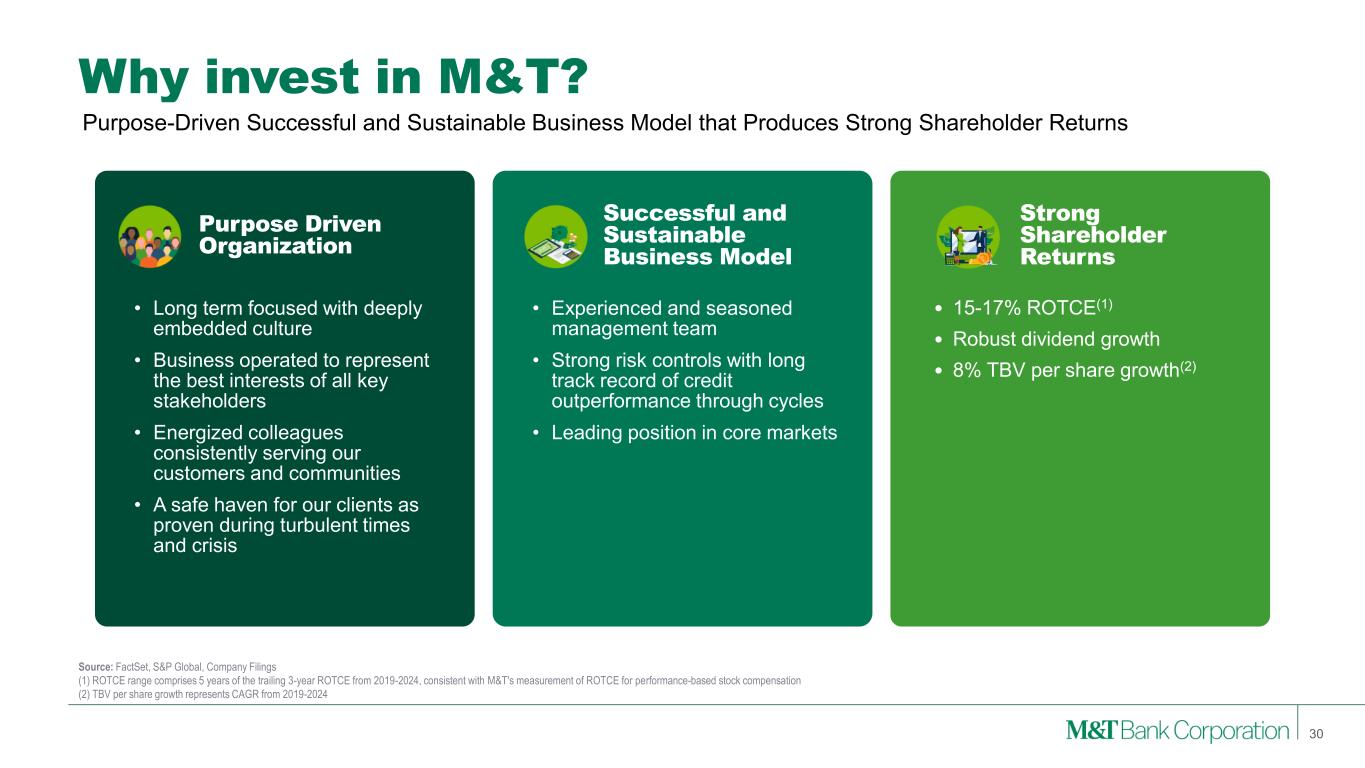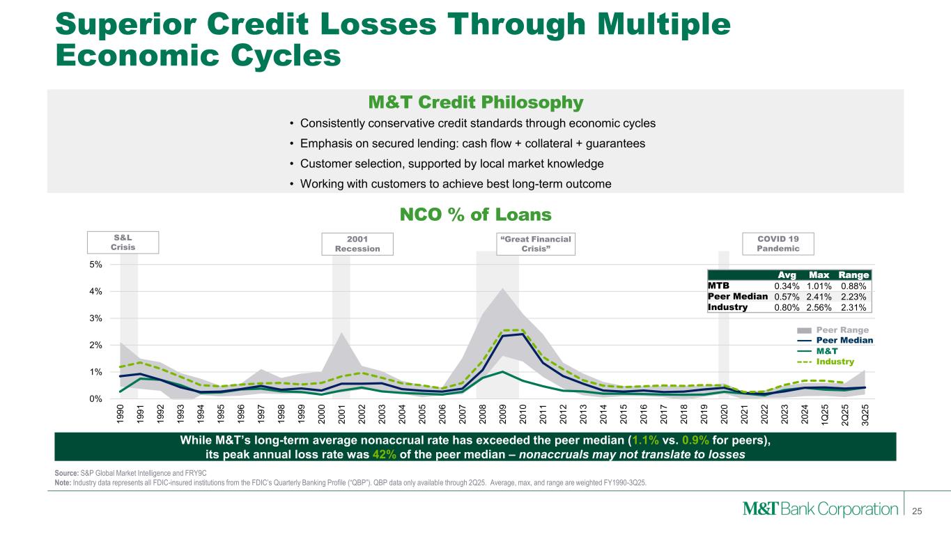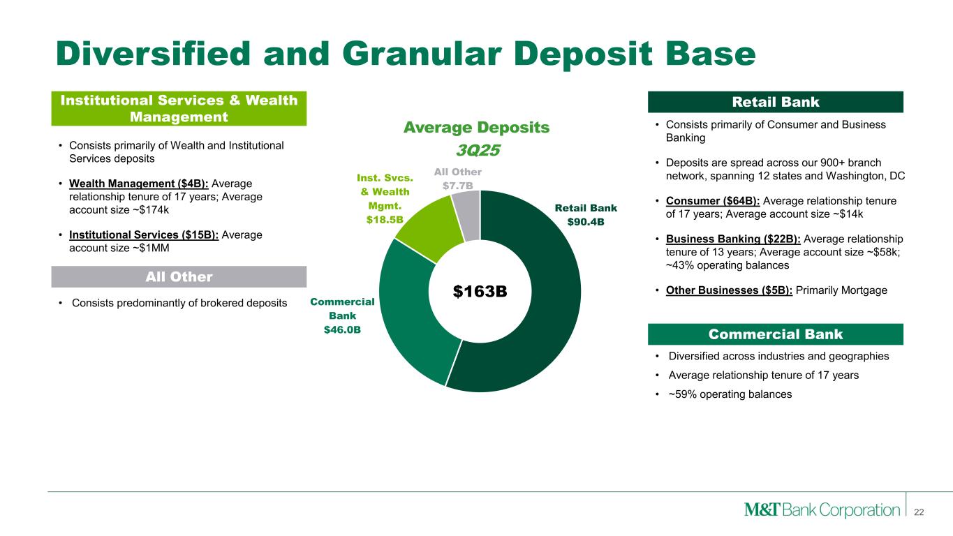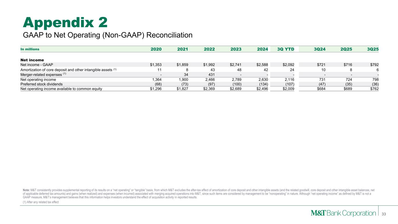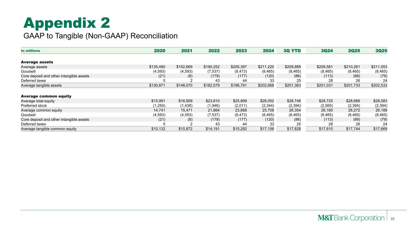 Forward-Looking Statements and Non-GAAP Financial Measures This presentation may contain forward-looking statements regarding M&T Bank Corporation (“M&T”) within the meaning of the Private Securities Litigation Reform Act of 1995 and the rules and regulations of the Securities and Exchange Commission (“SEC”). Any statement that does not describe historical or current facts is a forward-looking statement, including statements based on current expectations, estimates and projections about M&T's business, and management's beliefs and assumptions. Statements regarding the potential effects of events or factors specific to M&T and/or the financial industry as a whole, as well as national and global events generally, on M&T's business, financial condition, liquidity and results of operations may constitute forward-looking statements. Such statements are subject to the risk that the actual effects may differ, possibly materially, from what is reflected in those forward-looking statements due to factors and future developments that are uncertain, unpredictable and in many cases beyond M&T's control. Forward-looking statements are typically identified by words such as "believe," "expect," "anticipate," "intend," "target," "estimate," "continue," or "potential," by future conditional verbs such as "will," "would," "should," "could," or "may," or by variations of such words or by similar expressions. These statements are not guarantees of future performance and involve certain risks, uncertainties and assumptions which are difficult to predict and may cause actual outcomes to differ materially from what is expressed or forecasted. While there can be no assurance that any list of risks and uncertainties is complete, important factors that could cause actual outcomes and results to differ materially from those contemplated by forward-looking statements include the following, without limitation: economic conditions and growth rates, including inflation and market volatility; events, developments and current conditions in the financial services industry, including trust, brokerage and investment management businesses; changes in interest rates, spreads on earning assets and interest-bearing liabilities, and interest rate sensitivity; prepayment speeds, loan originations, loan concentrations by type and industry, credit losses and market values on loans, collateral securing loans, and other assets; sources of liquidity; levels of client deposits; ability to contain costs and expenses; changes in M&T's credit ratings; domestic or international political developments and other geopolitical events, including trade and tariff policies and international conflicts and hostilities; changes and trends in the securities markets; common shares outstanding and common stock price volatility; fair value of and number of stock-based compensation awards to be issued in future periods; the impact of changes in market values on trust-, brokerage-, and investment management-related revenues; federal, state or local legislation and/or regulations affecting the financial services industry, or M&T and its subsidiaries individually or collectively, including tax policy; regulatory supervision and oversight, including monetary policy and capital requirements; governmental and public policy changes; political conditions, either nationally or in the states in which M&T and its subsidiaries do business; the initiation and outcome of potential, pending and future litigation, investigations and governmental proceedings, including tax-related examinations and other matters; operational risk events, including loss resulting from fraud by employees or persons outside M&T and breaches in data and cybersecurity; changes in accounting policies or procedures as may be required by the Financial Accounting Standards Board, regulatory agencies or legislation; increasing price, product and service competition by competitors, including new entrants; technological developments and changes; the ability to continue to introduce competitive new products and services on a timely, cost-effective basis; the mix of products and services; protection and validity of intellectual property rights; reliance on large customers; technological, implementation and cost/financial risks in large, multi-year contracts; continued availability of financing; financial resources in the amounts, at the times and on the terms required to support M&T and its subsidiaries' future businesses; and material differences in the actual financial results of merger, acquisition, divestment and investment activities compared with M&T's initial expectations, including the full realization of anticipated cost savings and revenue enhancements. These are representative of the factors that could affect the outcome of the forward-looking statements. In addition, as noted, such statements could be affected by general industry and market conditions and growth rates, general economic and political conditions, either nationally or in the states in which M&T and its subsidiaries do business, and other factors. M&T provides further detail regarding these risks and uncertainties in its Form 10-K for the year ended December 31, 2024, including in the Risk Factors section of such report, as well as in other SEC filings. Forward-looking statements speak only as of the date they are made, and M&T assumes no duty and does not undertake to update forward-looking statements. Annualized, pro forma, projected, and estimated numbers are used for illustrative purposes only, are not forecasts and may not reflect actual results. This presentation also contains financial information and performance measures determined by methods other than in accordance with accounting principles generally accepted in the United States ("GAAP"). Management believes investors may find these non-GAAP financial measures useful. These disclosures should not be viewed as a substitute for financial measures determined i