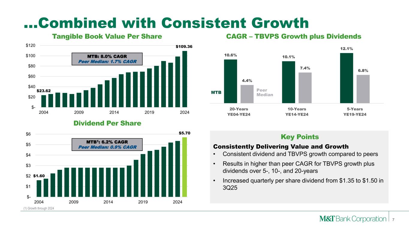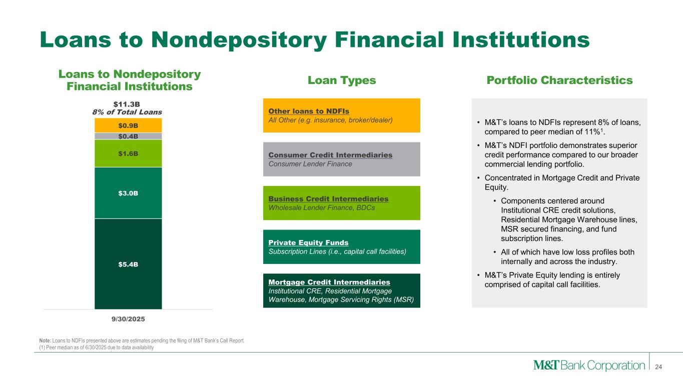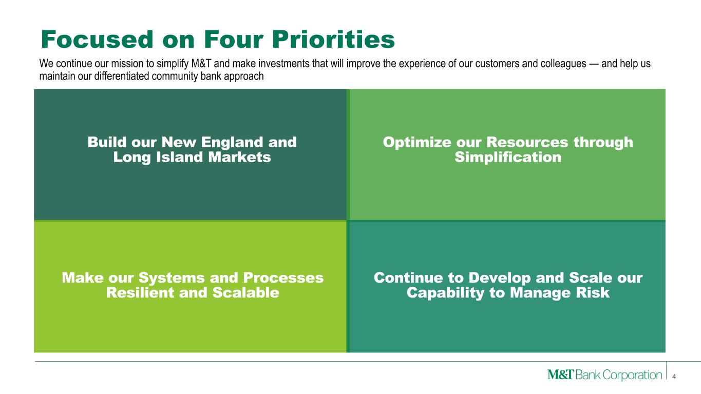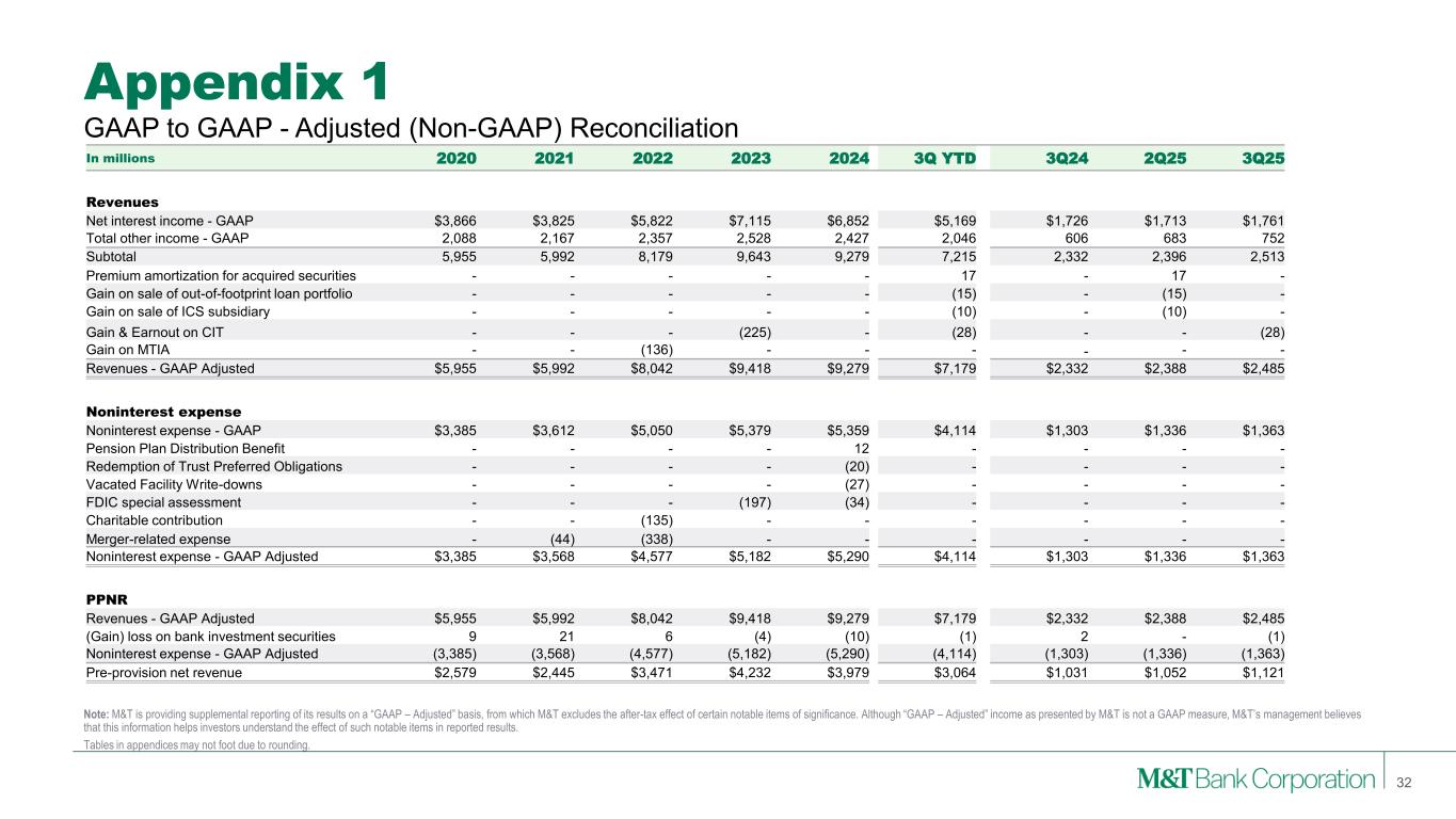 Forward-Looking Statements and Non-GAAP Financial Measures This presentation may contain forward-looking statements regarding M&T Bank Corporation (“M&T”) within the meaning of the Private Securities Litigation Reform Act of 1995 and the rules and regulations of the Securities and Exchange Commission (“SEC”). Any statement that does not describe historical or current facts is a forward-looking statement, including statements based on current expectations, estimates and projections about M&T's business, and management's beliefs and assumptions. Statements regarding the potential effects of events or factors specific to M&T and/or the financial industry as a whole, as well as national and global events generally, on M&T's business, financial condition, liquidity and results of operations may constitute forward-looking statements. Such statements are subject to the risk that the actual effects may differ, possibly materially, from what is reflected in those forward-looking statements due to factors and future developments that are uncertain, unpredictable and in many cases beyond M&T's control. Forward-looking statements are typically identified by words such as "believe," "expect," "anticipate," "intend," "target," "estimate," "continue," or "potential," by future conditional verbs such as "will," "would," "should," "could," or "may," or by variations of such words or by similar expressions. These statements are not guarantees of future performance and involve certain risks, uncertainties and assumptions which are difficult to predict and may cause actual outcomes to differ materially from what is expressed or forecasted. While there can be no assurance that any list of risks and uncertainties is complete, important factors that could cause actual outcomes and results to differ materially from those contemplated by forward-looking statements include the following, without limitation: economic conditions and growth rates, including inflation and market volatility; events, developments and current conditions in the financial services industry, including trust, brokerage and investment management businesses; changes in interest rates, spreads on earning assets and interest-bearing liabilities, and interest rate sensitivity; prepayment speeds, loan originations, loan concentrations by type and industry, credit losses and market values on loans, collateral securing loans, and other assets; sources of liquidity; levels of client deposits; ability to contain costs and expenses; changes in M&T's credit ratings; domestic or international political developments and other geopolitical events, including trade and tariff policies and international conflicts and hostilities; changes and trends in the securities markets; common shares outstanding and common stock price volatility; fair value of and number of stock-based compensation awards to be issued in future periods; the impact of changes in market values on trust-, brokerage-, and investment management-related revenues; federal, state or local legislation and/or regulations affecting the financial services industry, or M&T and its subsidiaries individually or collectively, including tax policy; regulatory supervision and oversight, including monetary policy and capital requirements; governmental and public policy changes; political conditions, either nationally or in the states in which M&T and its subsidiaries do business; the initiation and outcome of potential, pending and future litigation, investigations and governmental proceedings, including tax-related examinations and other matters; operational risk events, including loss resulting from fraud by employees or persons outside M&T and breaches in data and cybersecurity; changes in accounting policies or procedures as may be required by the Financial Accounting Standards Board, regulatory agencies or legislation; increasing price, product and service competition by competitors, including new entrants; technological developments and changes; the ability to continue to introduce competitive new products and services on a timely, cost-effective basis; the mix of products and services; protection and validity of intellectual property rights; reliance on large customers; technological, implementation and cost/financial risks in large, multi-year contracts; continued availability of financing; financial resources in the amounts, at the times and on the terms required to support M&T and its subsidiaries' future businesses; and material differences in the actual financial results of merger, acquisition, divestment and investment activities compared with M&T's initial expectations, including the full realization of anticipated cost savings and revenue enhancements. These are representative of the factors that could affect the outcome of the forward-looking statements. In addition, as noted, such statements could be affected by general industry and market conditions and growth rates, general economic and political conditions, either nationally or in the states in which M&T and its subsidiaries do business, and other factors. M&T provides further detail regarding these risks and uncertainties in its Form 10-K for the year ended December 31, 2024, including in the Risk Factors section of such report, as well as in other SEC filings. Forward-looking statements speak only as of the date they are made, and M&T assumes no duty and does not undertake to update forward-looking statements. Annualized, pro forma, projected, and estimated numbers are used for illustrative purposes only, are not forecasts and may not reflect actual results. This presentation also contains financial information and performance measures determined by methods other than in accordance with accounting principles generally accepted in the United States ("GAAP"). Management believes investors may find these non-GAAP financial measures useful. These disclosures should not be viewed as a substitute for financial measures determined i