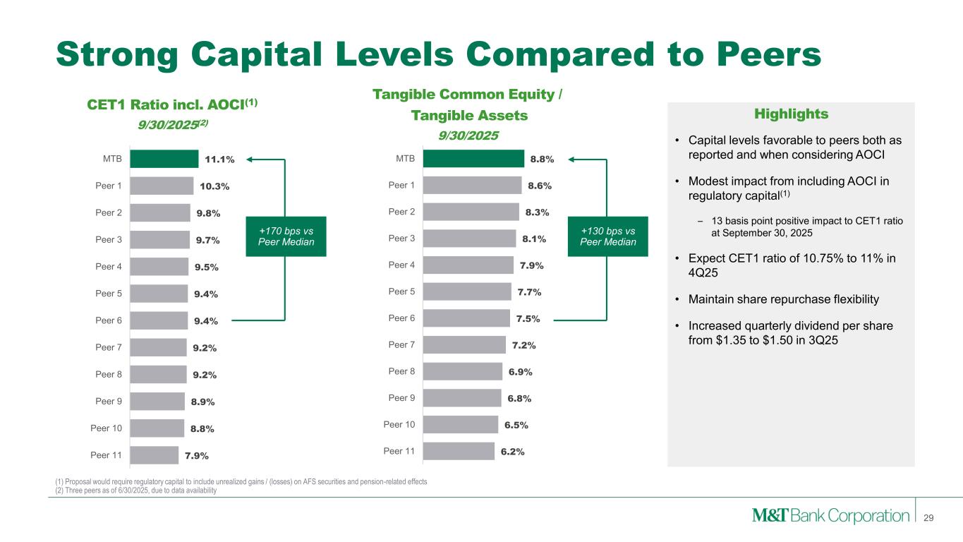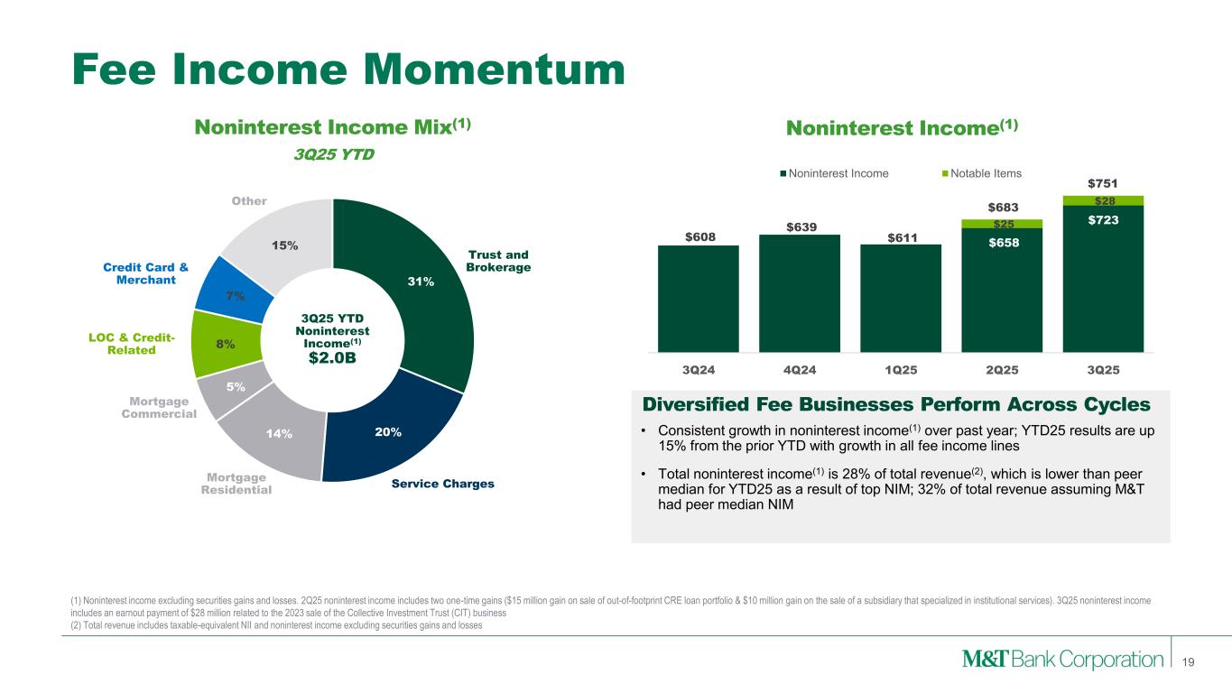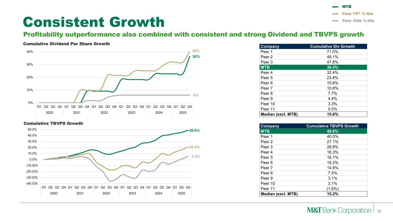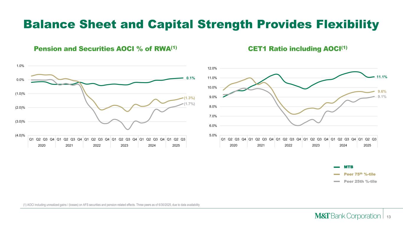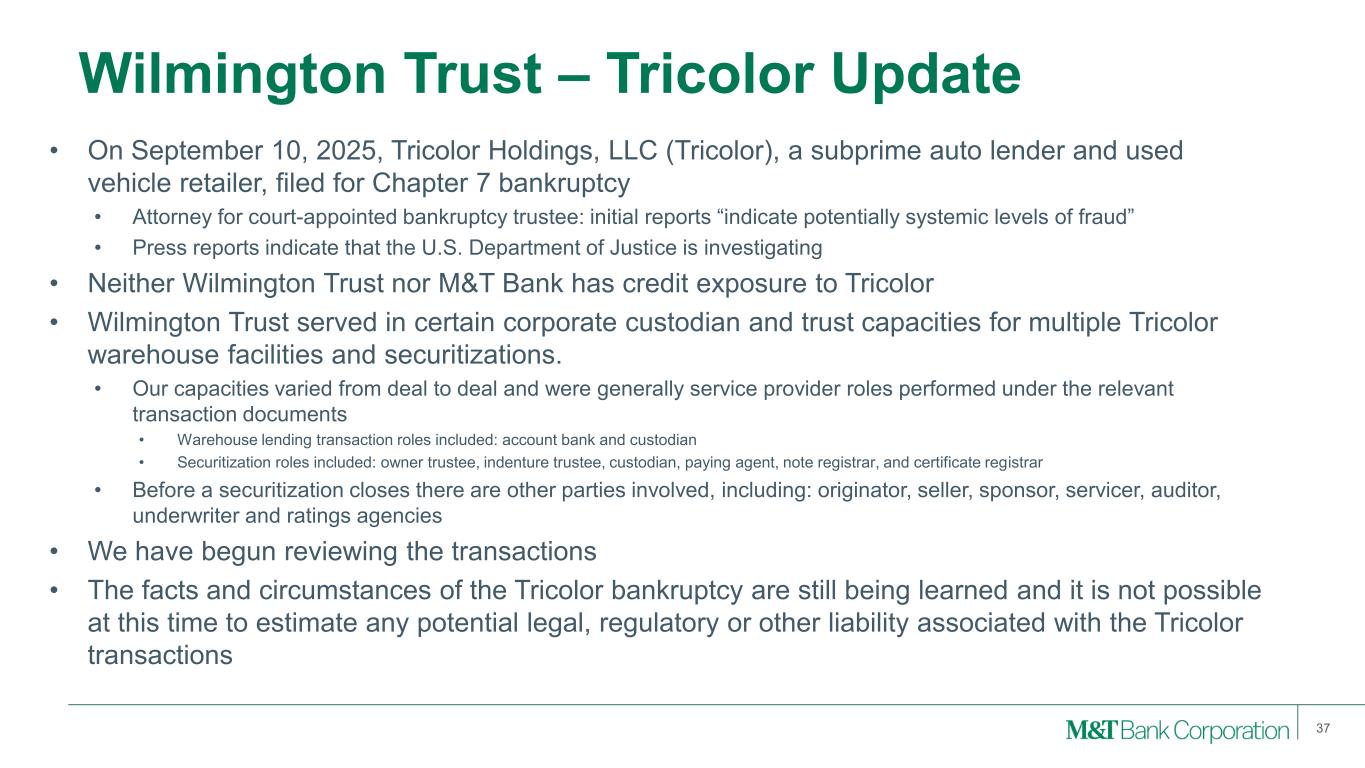 Forward-Looking Statements and Non-GAAP Financial Measures This presentation may contain forward-looking statements regarding M&T Bank Corporation (“M&T”) within the meaning of the Private Securities Litigation Reform Act of 1995 and the rules and regulations of the Securities and Exchange Commission (“SEC”). Any statement that does not describe historical or current facts is a forward-looking statement, including statements based on current expectations, estimates and projections about M&T's business, and management's beliefs and assumptions. Statements regarding the potential effects of events or factors specific to M&T and/or the financial industry as a whole, as well as national and global events generally, on M&T's business, financial condition, liquidity and results of operations may constitute forward-looking statements. Such statements are subject to the risk that the actual effects may differ, possibly materially, from what is reflected in those forward-looking statements due to factors and future developments that are uncertain, unpredictable and in many cases beyond M&T's control. Forward-looking statements are typically identified by words such as "believe," "expect," "anticipate," "intend," "target," "estimate," "continue," or "potential," by future conditional verbs such as "will," "would," "should," "could," or "may," or by variations of such words or by similar expressions. These statements are not guarantees of future performance and involve certain risks, uncertainties and assumptions which are difficult to predict and may cause actual outcomes to differ materially from what is expressed or forecasted. While there can be no assurance that any list of risks and uncertainties is complete, important factors that could cause actual outcomes and results to differ materially from those contemplated by forward-looking statements include the following, without limitation: economic conditions and growth rates, including inflation and market volatility; events, developments and current conditions in the financial services industry, including trust, brokerage and investment management businesses; changes in interest rates, spreads on earning assets and interest-bearing liabilities, and interest rate sensitivity; prepayment speeds, loan originations, loan concentrations by type and industry, credit losses and market values on loans, collateral securing loans, and other assets; sources of liquidity; levels of client deposits; ability to contain costs and expenses; changes in M&T's credit ratings; domestic or international political developments and other geopolitical events, including trade and tariff policies and international conflicts and hostilities; changes and trends in the securities markets; common shares outstanding and common stock price volatility; fair value of and number of stock-based compensation awards to be issued in future periods; the impact of changes in market values on trust-, brokerage-, and investment management-related revenues; federal, state or local legislation and/or regulations affecting the financial services industry, or M&T and its subsidiaries individually or collectively, including tax policy; regulatory supervision and oversight, including monetary policy and capital requirements; governmental and public policy changes; political conditions, either nationally or in the states in which M&T and its subsidiaries do business; the initiation and outcome of potential, pending and future litigation, investigations and governmental proceedings, including tax-related examinations and other matters; operational risk events, including loss resulting from fraud by employees or persons outside M&T and breaches in data and cybersecurity; changes in accounting policies or procedures as may be required by the Financial Accounting Standards Board, regulatory agencies or legislation; increasing price, product and service competition by competitors, including new entrants; technological developments and changes; the ability to continue to introduce competitive new products and services on a timely, cost-effective basis; the mix of products and services; protection and validity of intellectual property rights; reliance on large customers; technological, implementation and cost/financial risks in large, multi-year contracts; continued availability of financing; financial resources in the amounts, at the times and on the terms required to support M&T and its subsidiaries' future businesses; and material differences in the actual financial results of merger, acquisition, divestment and investment activities compared with M&T's initial expectations, including the full realization of anticipated cost savings and revenue enhancements. These are representative of the factors that could affect the outcome of the forward-looking statements. In addition, as noted, such statements could be affected by general industry and market conditions and growth rates, general economic and political conditions, either nationally or in the states in which M&T and its subsidiaries do business, and other factors. M&T provides further detail regarding these risks and uncertainties in its Form 10-K for the year ended December 31, 2024, including in the Risk Factors section of such report, as well as in other SEC filings. Forward-looking statements speak only as of the date they are made, and M&T assumes no duty and does not undertake to update forward-looking statements. Annualized, pro forma, projected, and estimated numbers are used for illustrative purposes only, are not forecasts and may not reflect actual results. This presentation also contains financial information and performance measures determined by methods other than in accordance with accounting principles generally accepted in the United States ("GAAP"). Management believes investors may find these non-GAAP financial measures useful. These disclosures should not be viewed as a substitute for financial measures determined i