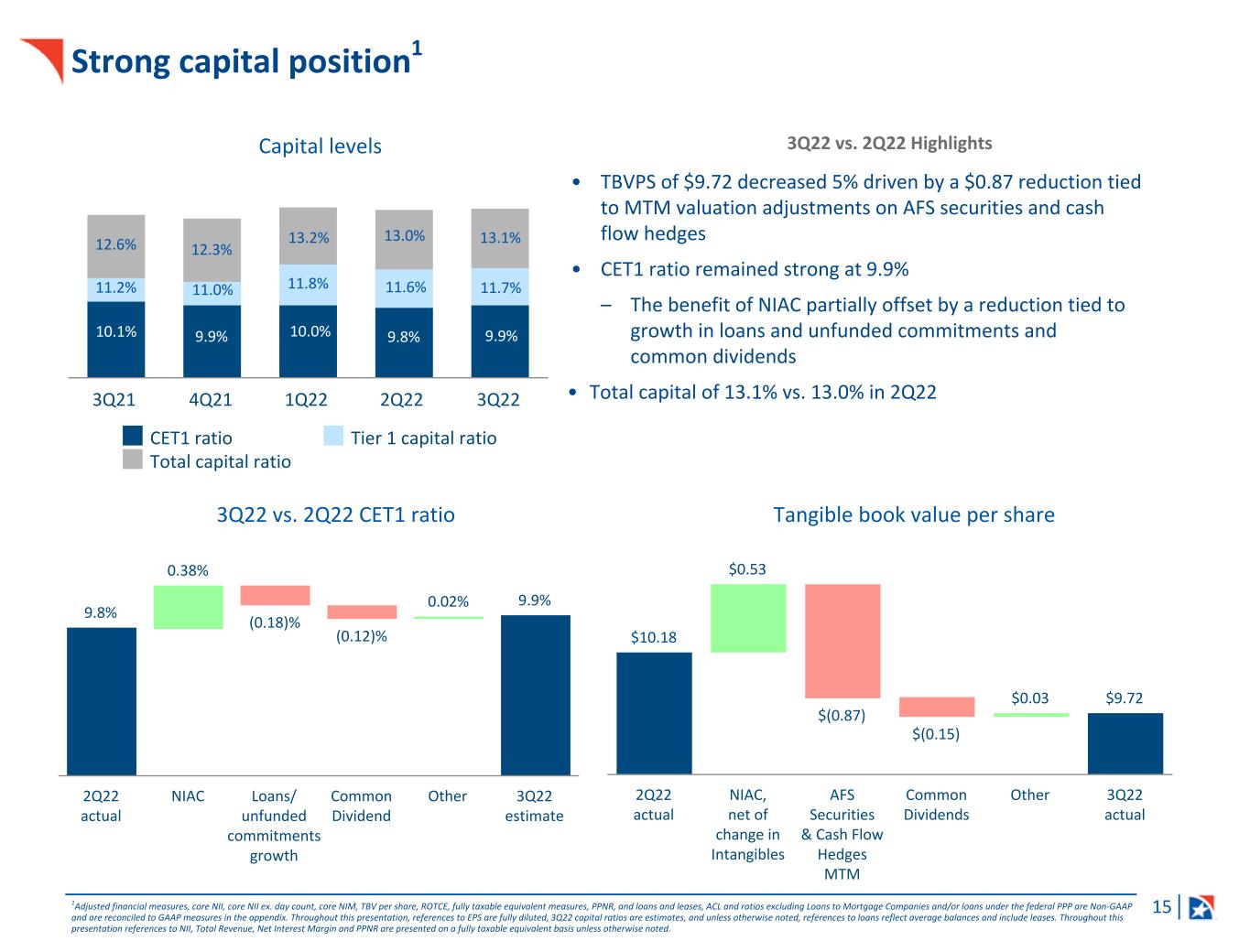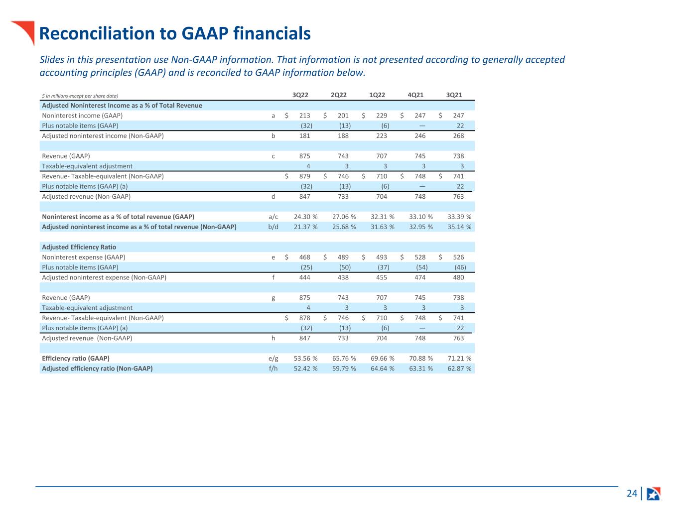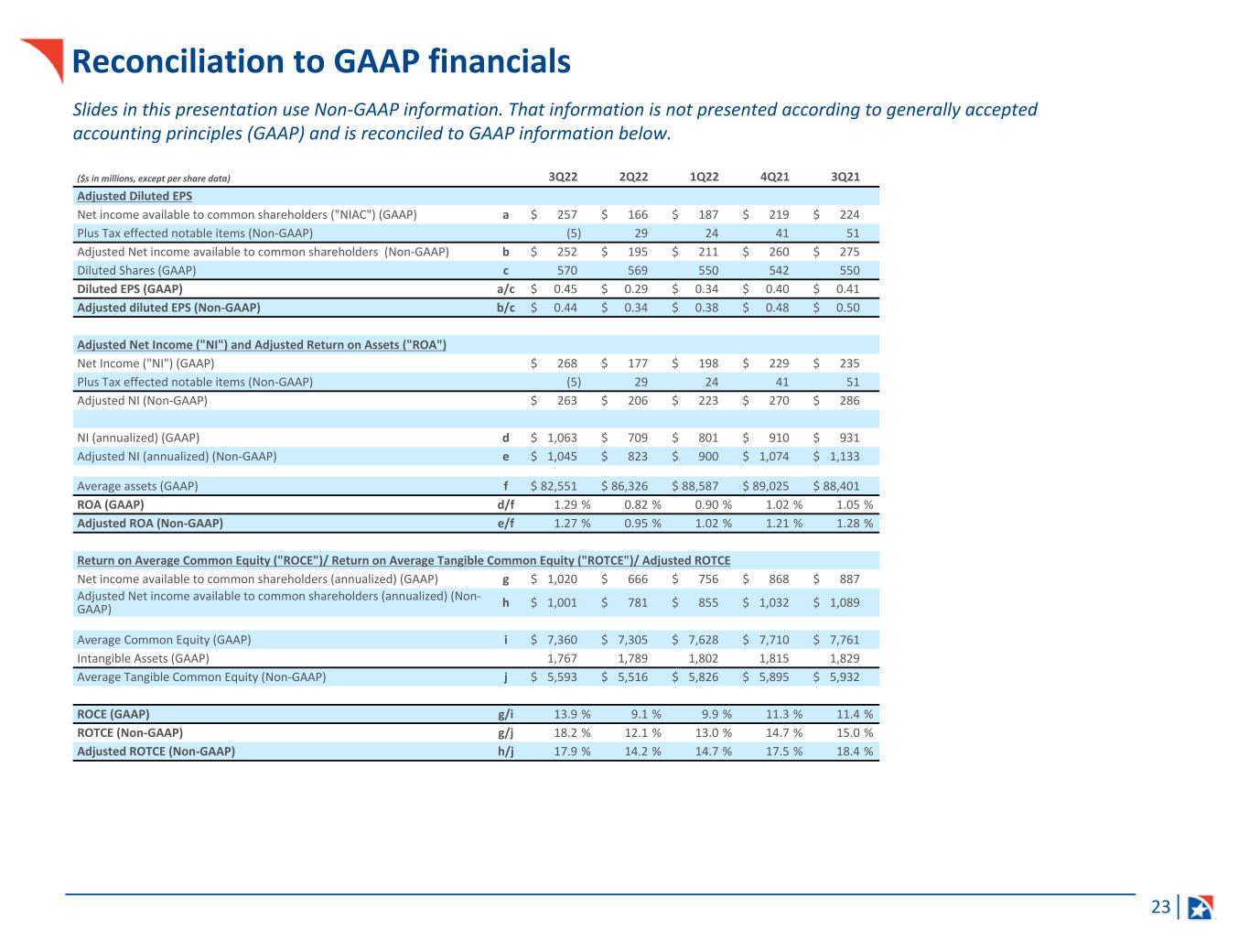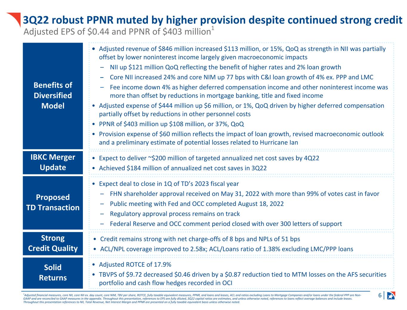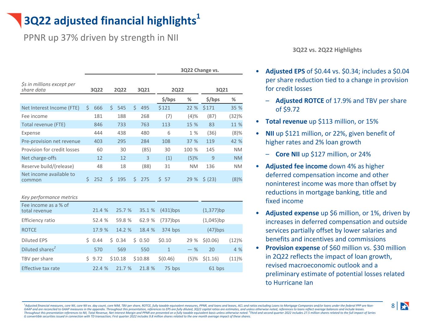 2022年第3四半期の業績は、2022年第2四半期の2900万ドル(1株当たり0.05ドル)の純減額に対し、税引き後500万ドル(1株当たり0.01ドル)の注目項目の増加の影響を受けています。注目すべき項目を除くと、調整後の2022年第3四半期のNIACは2億5,200万ドル(1株当たり0.44ドル)となり、2022年第2四半期の1億9,500万ドル(1株当たり0.34ドル)から増加しました。結果は、信用損失引当金に関連する一株当たり 0.04 ドルの減少、及び提案されている TD 取引に関連する自社株買いの停止による影響を反映しています。