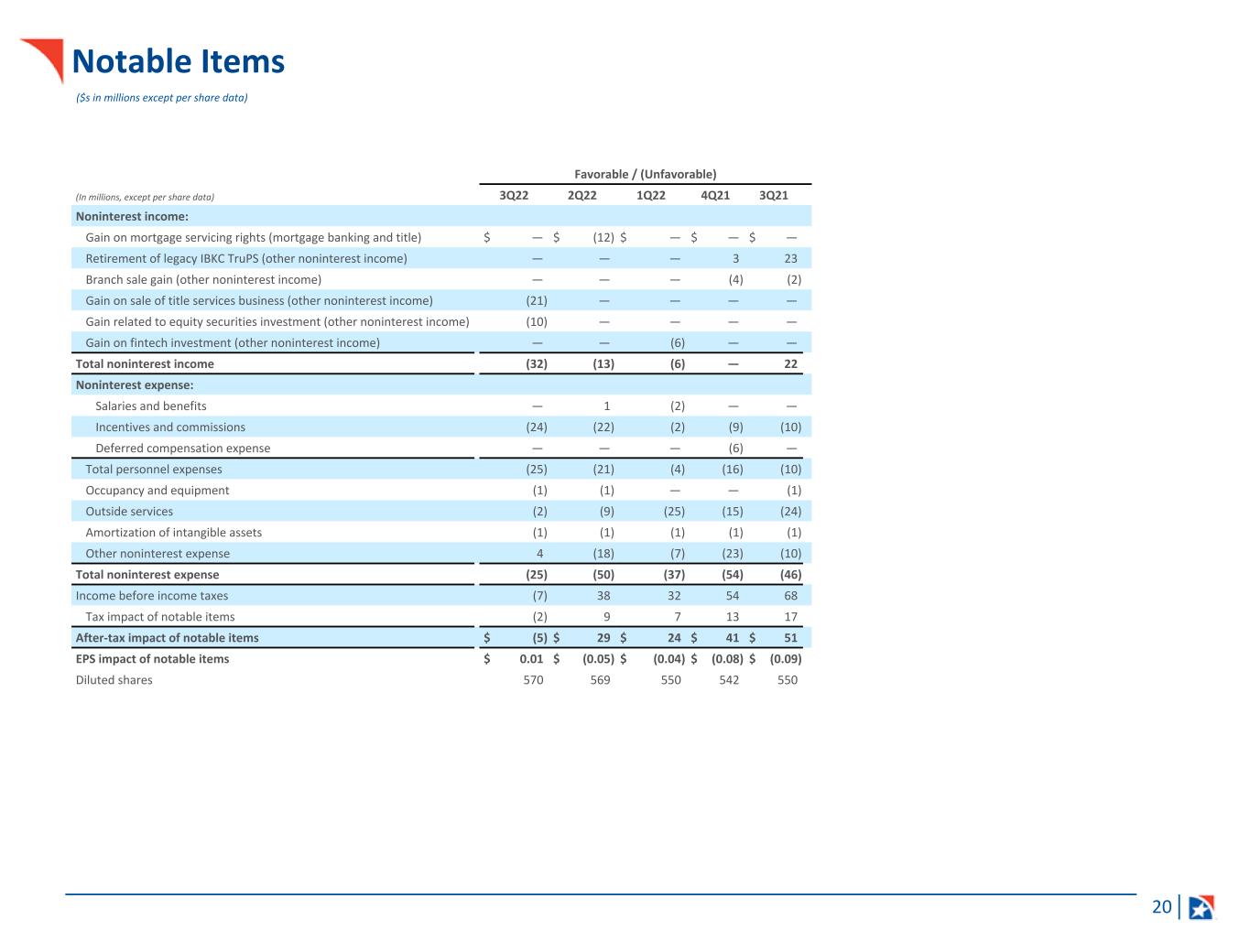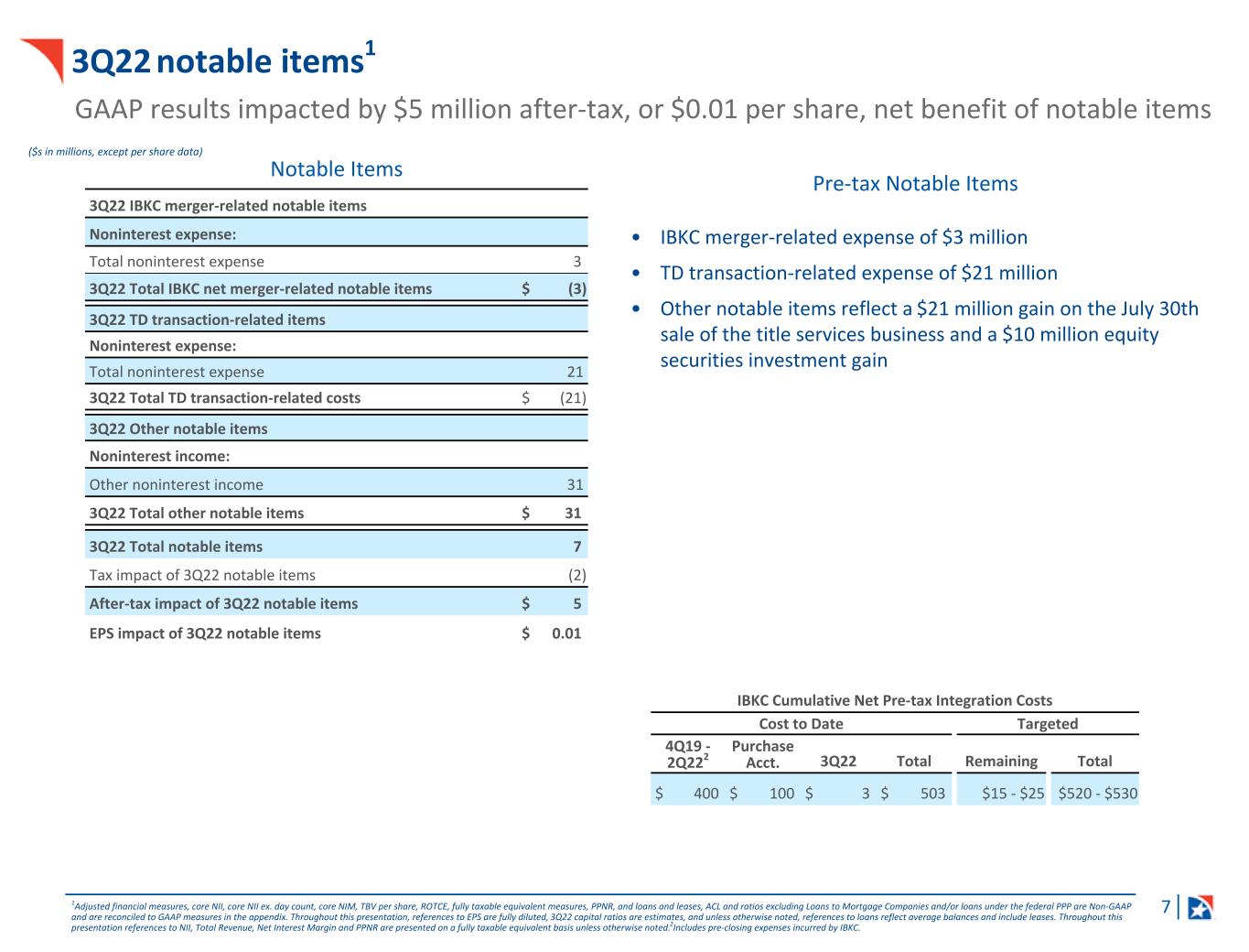 第3四半期の税引前純損益で特筆すべき項目は、TDの取引関連費用2100万ドル、IBKCの合併関連費用300万ドルです。その他の注目すべき項目には、7月30日のタイトルサービス事業売却による利益2100万ドル、株式投資利益1000万ドルが含まれます。