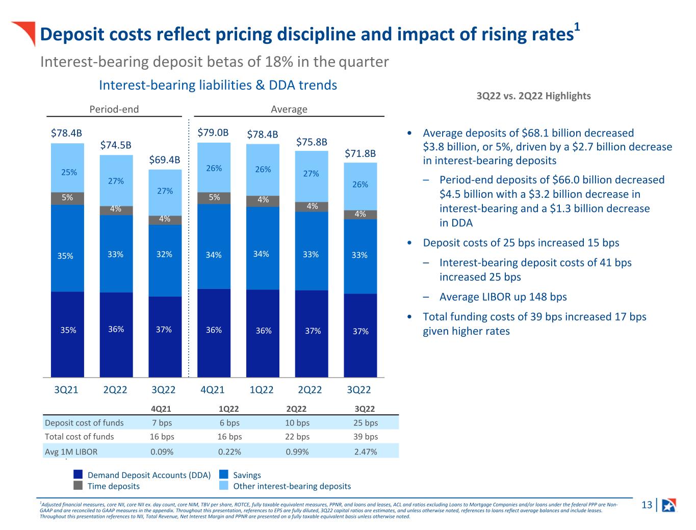 -平均預金は、有利子負債が 27 億ドル減少したことにより、38 億ドル(5%)減少して 681 億ドルとなりました。預金コスト合計は25bpとなり、15bp増加しました。