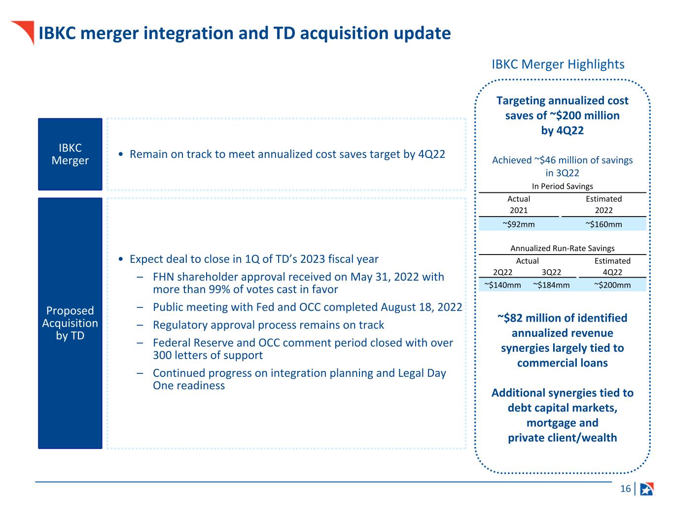-IBKC合併による年間約2億ドルのコスト削減目標を4Q22までに達成する予定です。